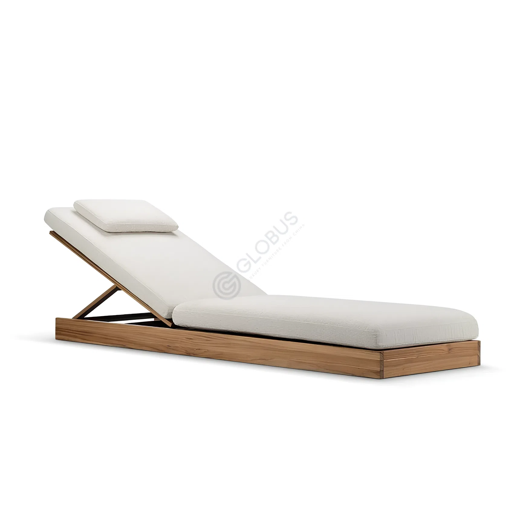 Современный шезлонг с чистой геометрией и низким профилем. Основание выполнено из натурального массива с тщательно выверенными пропорциями, теплая текстура древесины подчеркивает лаконичный силуэт.