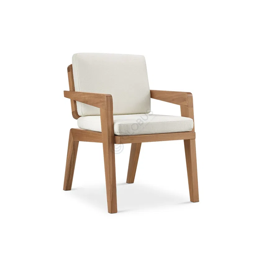 Мягкая часть представляет собой подушку, обтянутую высококачественным текстилем. Материал приятен на ощупь и создан для использования на открытом воздухе, обеспечивая комфорт и сохраняя привлекательный вид в течение долгого времени. Светлый оттенок обивки придает изделию воздушность и универсальность.