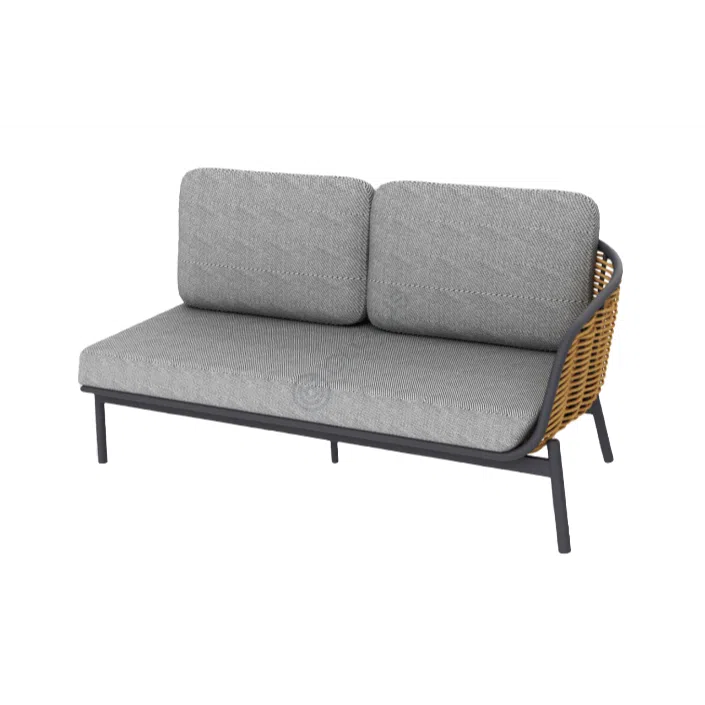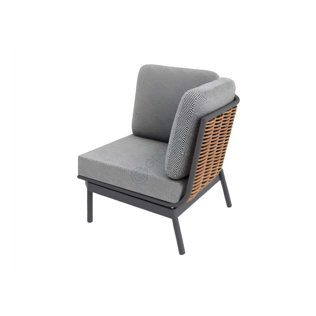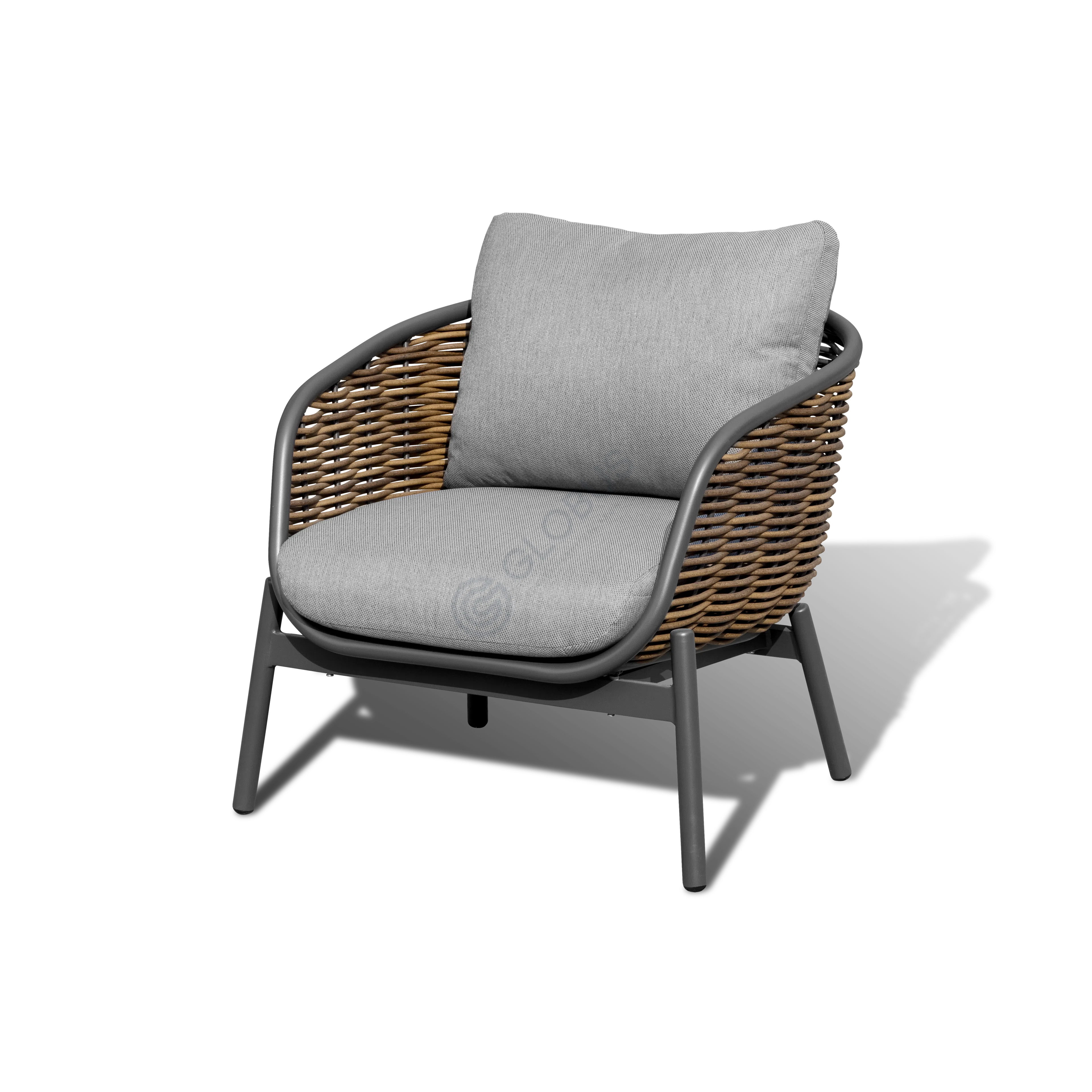 Конструкция опирается на легкий, но надежный алюминиевый каркас. Внешняя часть спинки выполнена из искусственного ротанга с привлекательной плетеной фактурой, что придает изделию особый шарм. Внутренняя обивка из качественного текстиля обеспечивает мягкость и удобство посадки.
