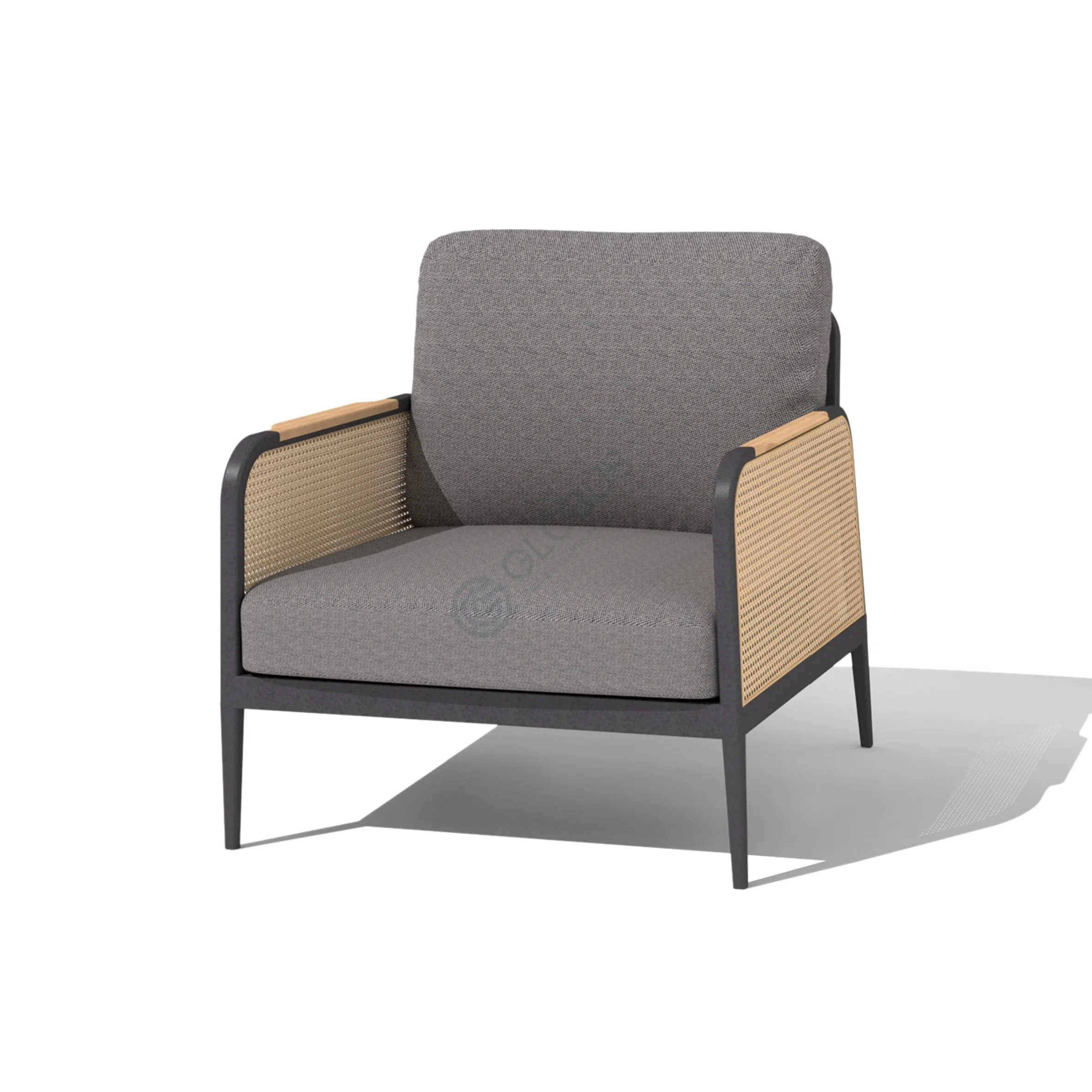 В основе изделия лежит прочный алюминиевый каркас, обеспечивающий долговечность и устойчивость к внешним воздействиям. Комфортное сиденье и спинка обтянуты приятным на ощупь текстилем, создавая уютное место для отдыха. Особенный шарм придает сочетание натурального дерева и искусно сплетенного искусственного ротанга, использованное в оформлении боковин, что добавляет текстурную глубину и теплоту к общему облику.