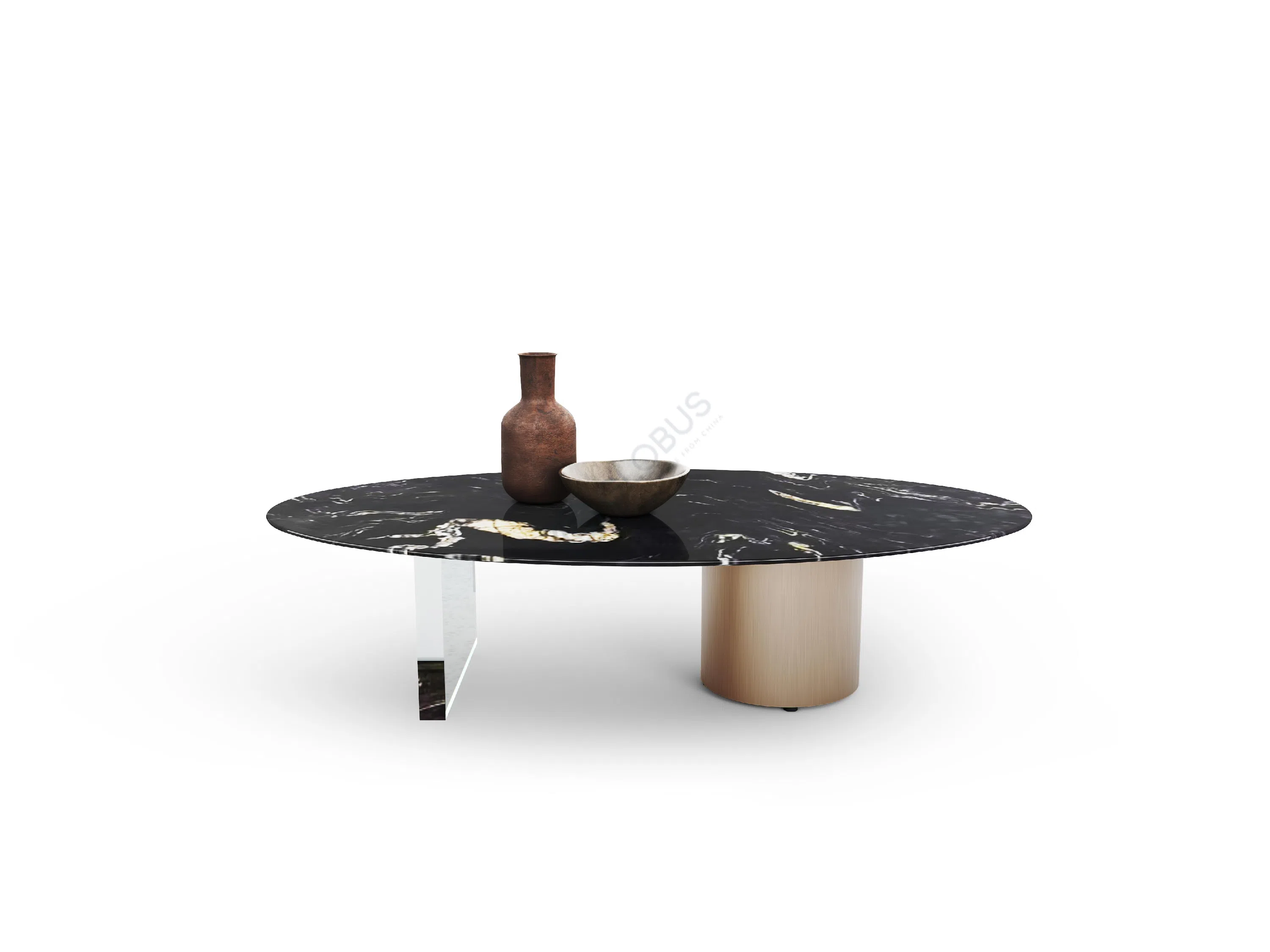 Изящество дизайна подчеркивает оригинальное основание из нержавеющей стали. Одна часть опоры имеет плавную цилиндрическую форму с благородной матовой отделкой под бронзу или золото, а другая представлена элементом, визуально облегчающим конструкцию и создающим эффект прозрачности. Это сочетание массивности и легкости придает изделию выразительность и является характерной чертой современного стиля.