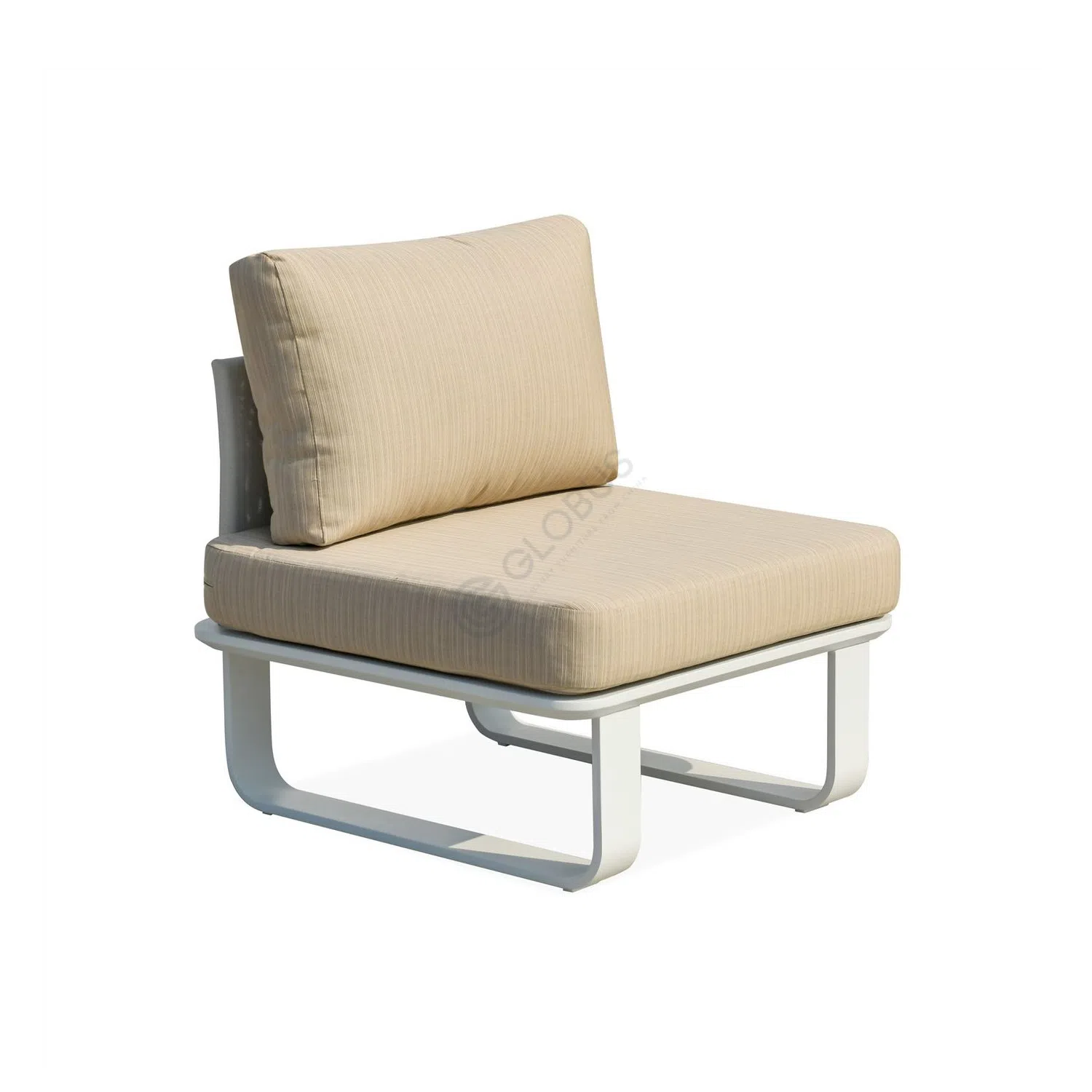 Прочный каркас выполнен из легкого и долговечного алюминия, обеспечивающего устойчивость и надежность конструкции. Сиденье и спинка оснащены мягкими подушками, обтянутыми высококачественным текстилем, специально разработанным для использования на улице. Этот материал приятен на ощупь и устойчив к воздействию солнечных лучей и влаги.