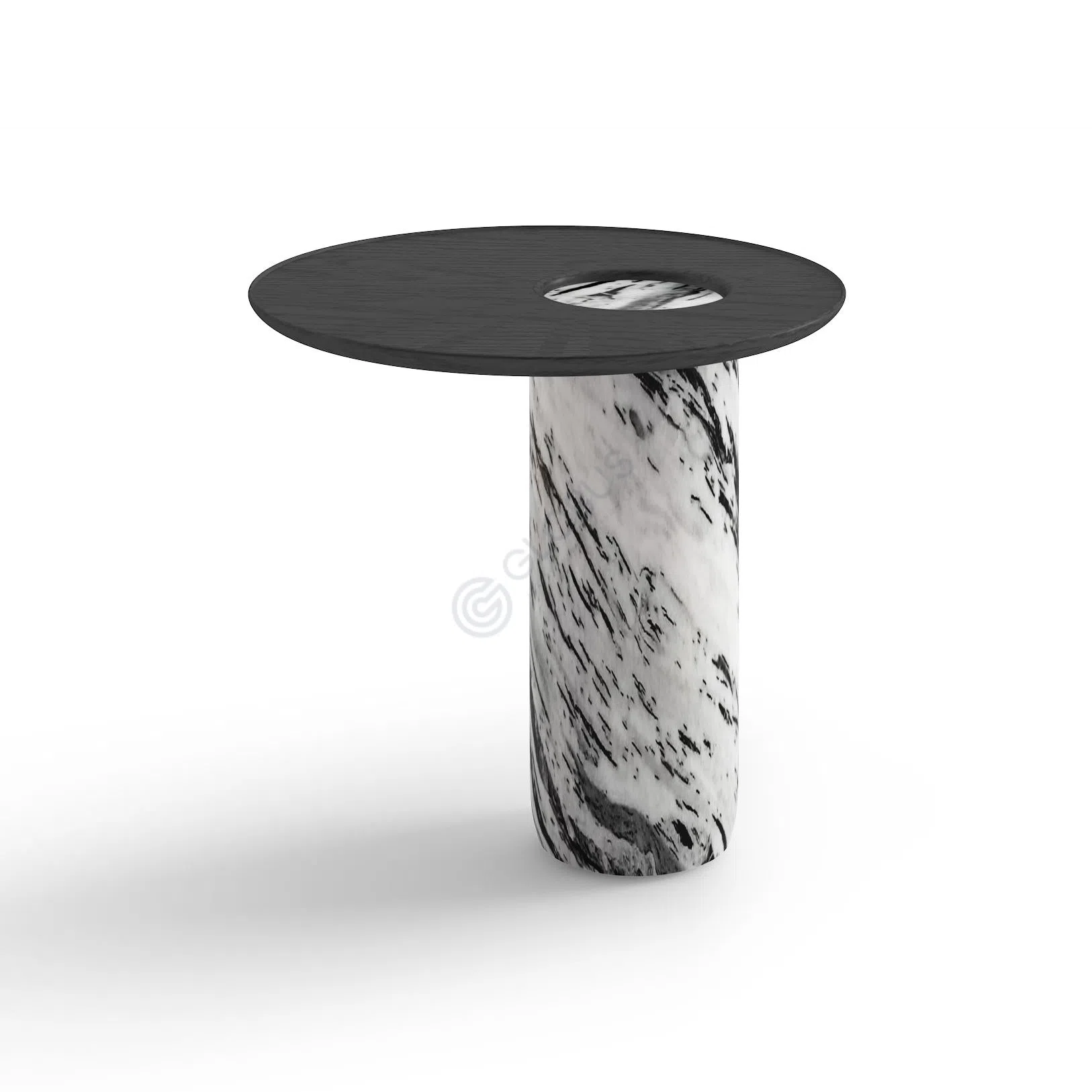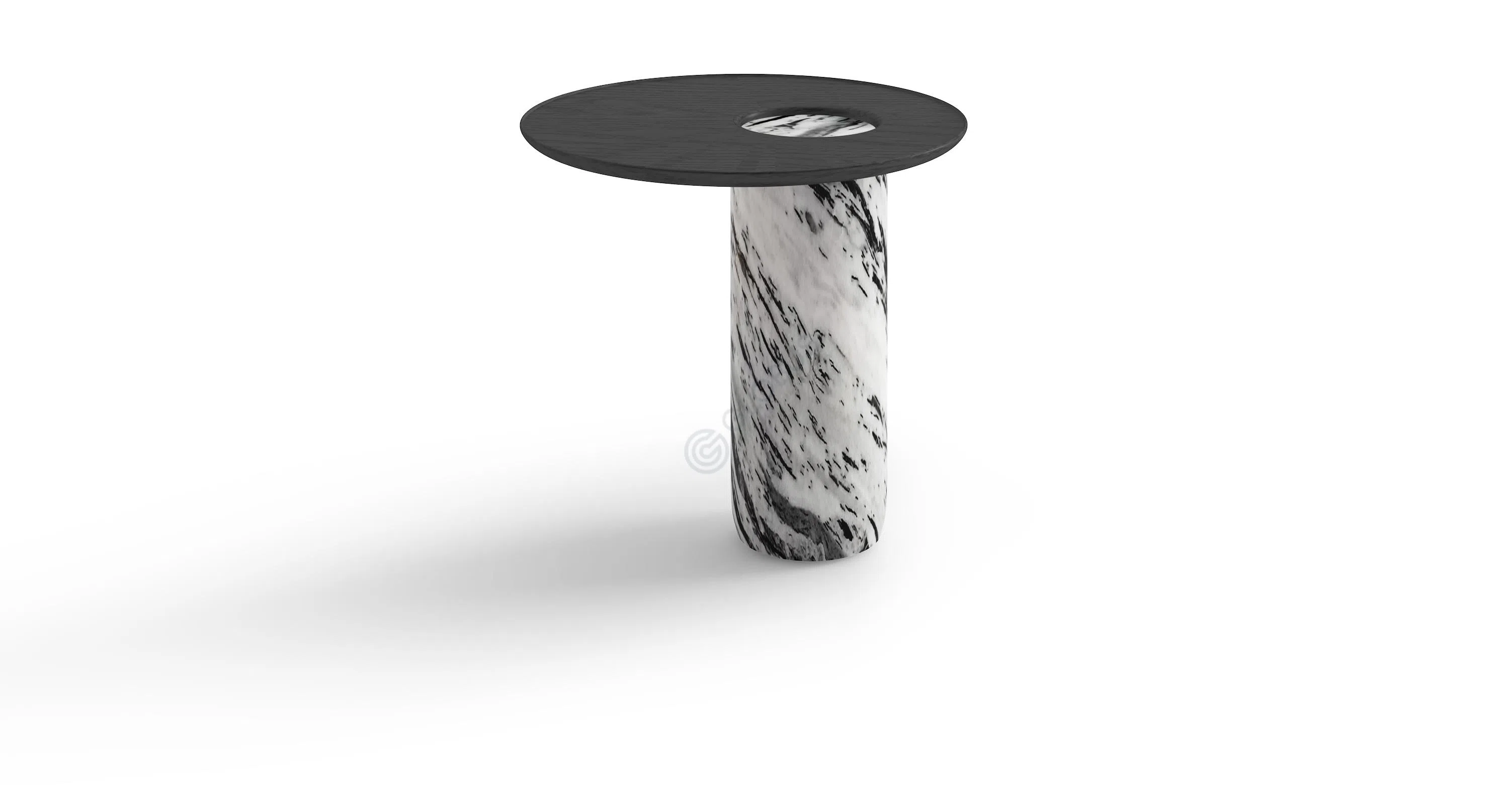 Этот журнальный столик представляет собой воплощение современного дизайна, где встречаются природная красота материалов и лаконичные формы. Его конструкция строится вокруг элегантного контраста между округлой столешницей и цилиндрическим основанием.