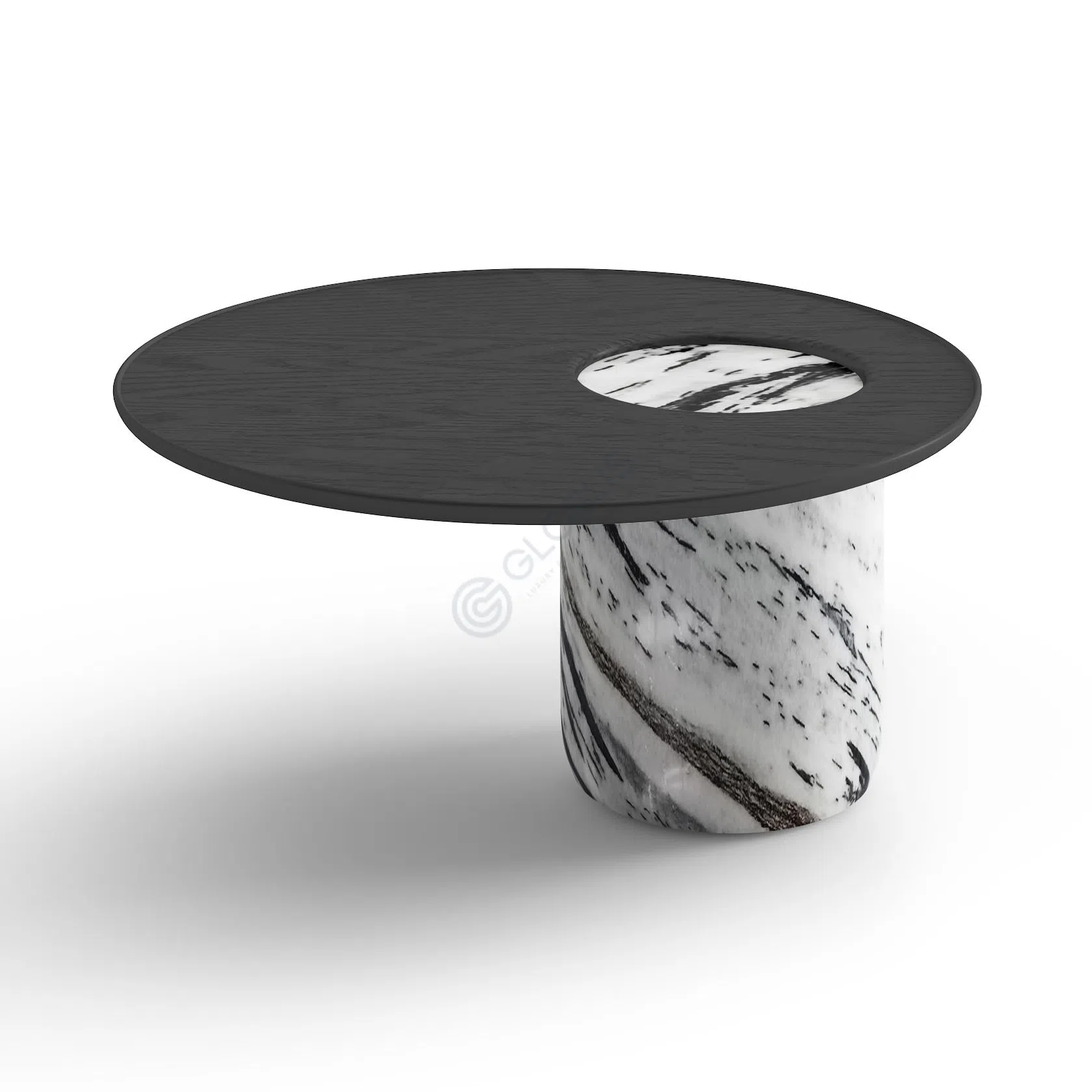 Основание столика выполнено из натурального мрамора, демонстрируя его неповторимый природный рисунок и величие. Каждый экземпляр обладает уникальным узором прожилок, делая предмет по-настоящему особенным. Столешница из натурального дерева благородного оттенка добавляет теплоты и тактильного комфорта, создавая интересное визуальное и осязательное взаимодействие материалов. Круглая форма верха с деликатным вырезом подчеркивает утонченность дизайна.