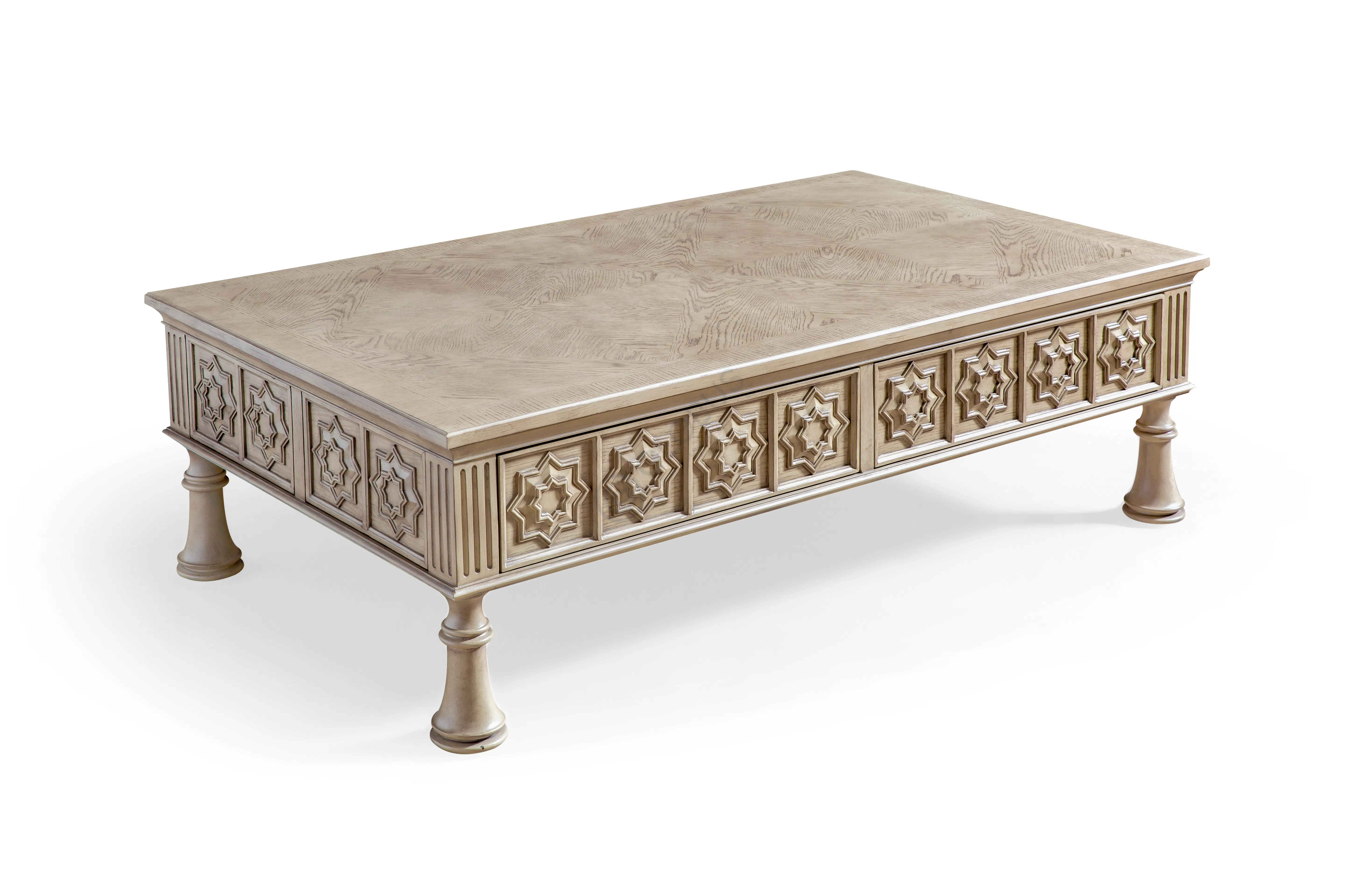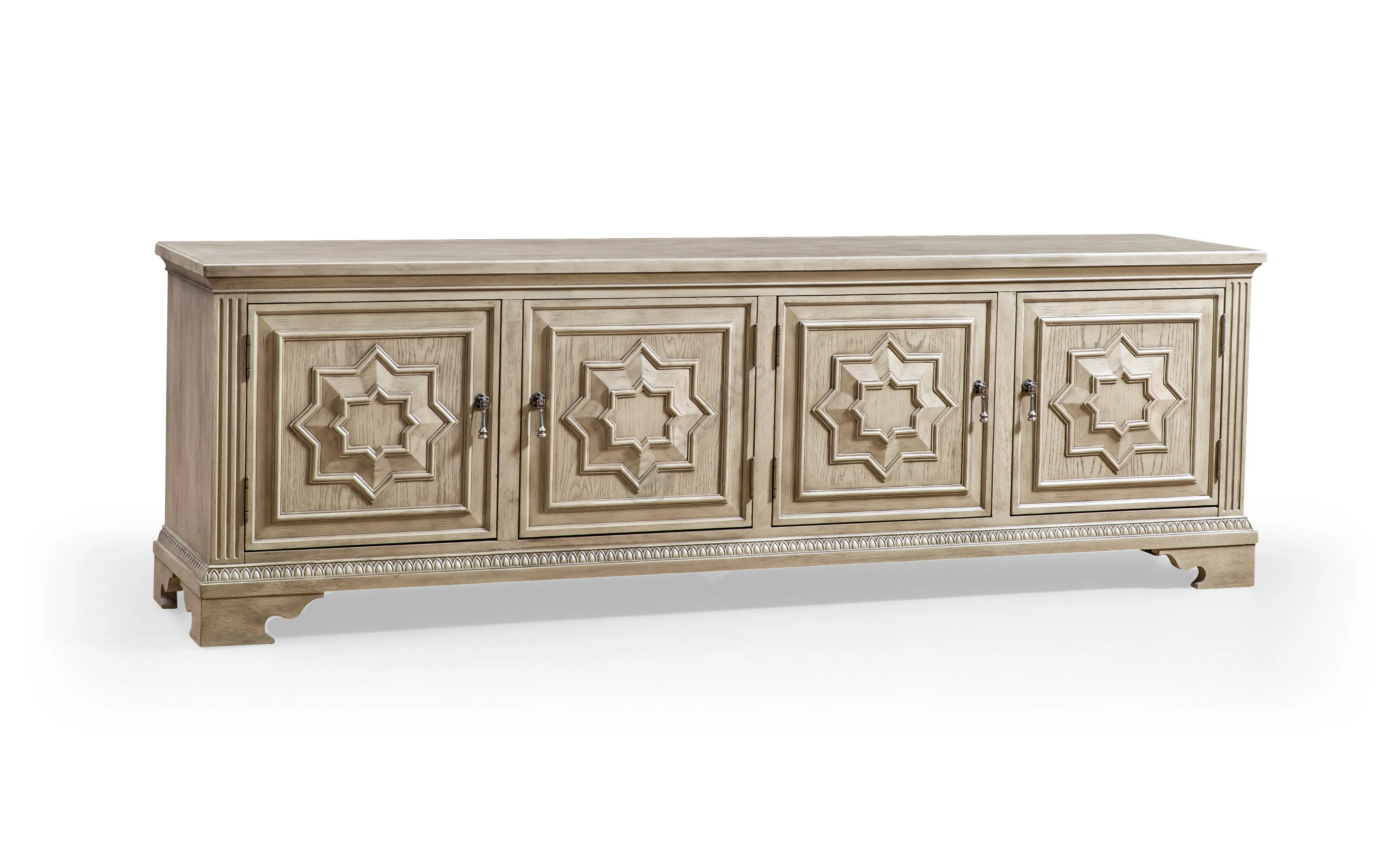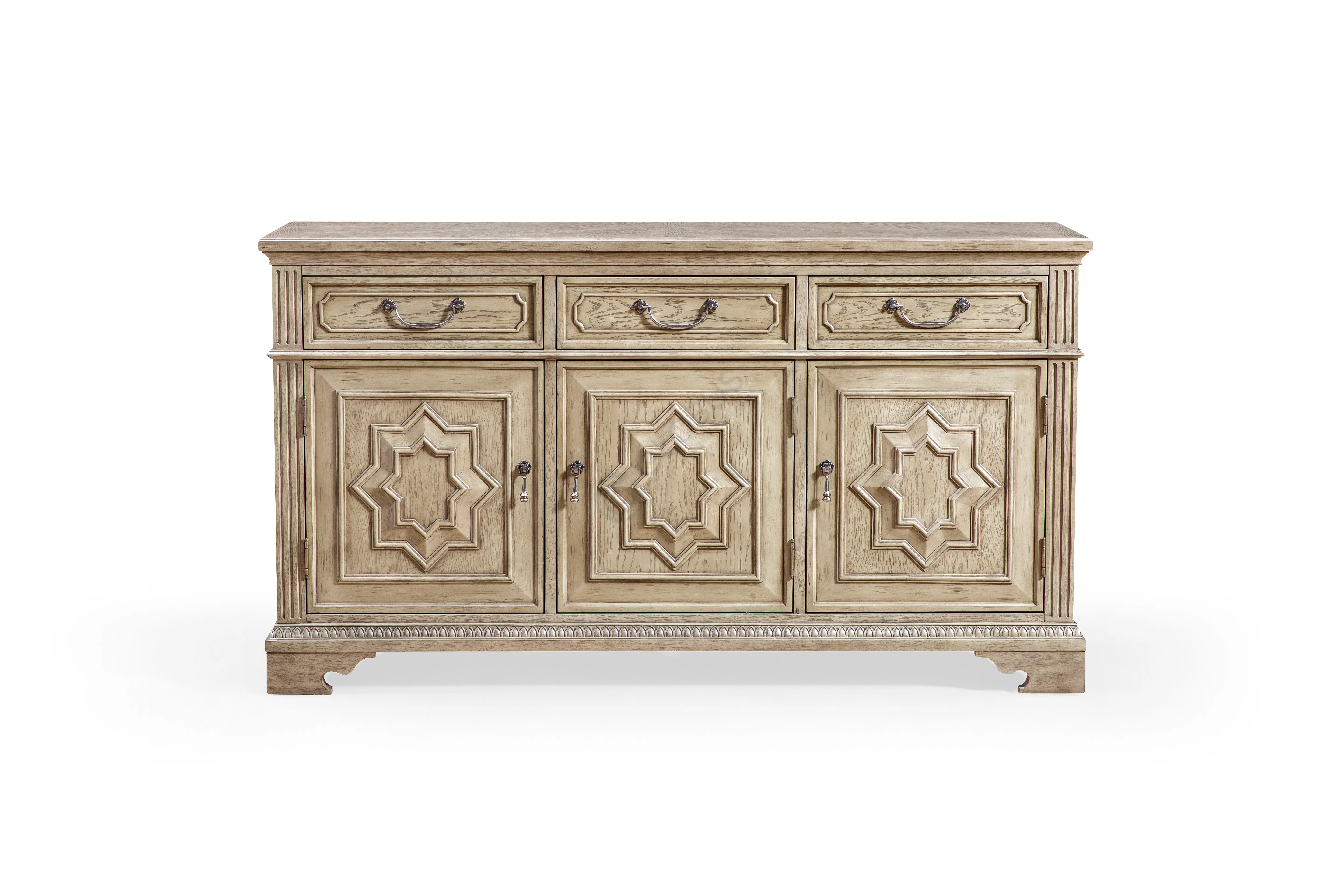 Комод в неоклассическом ключе с ясными пропорциями и светлым оттенком натурального дерева. Фасады оформлены тонкими филенками, стойки подчеркнуты каннелюрами, по цоколю проходит аккуратный декоративный бордюр.