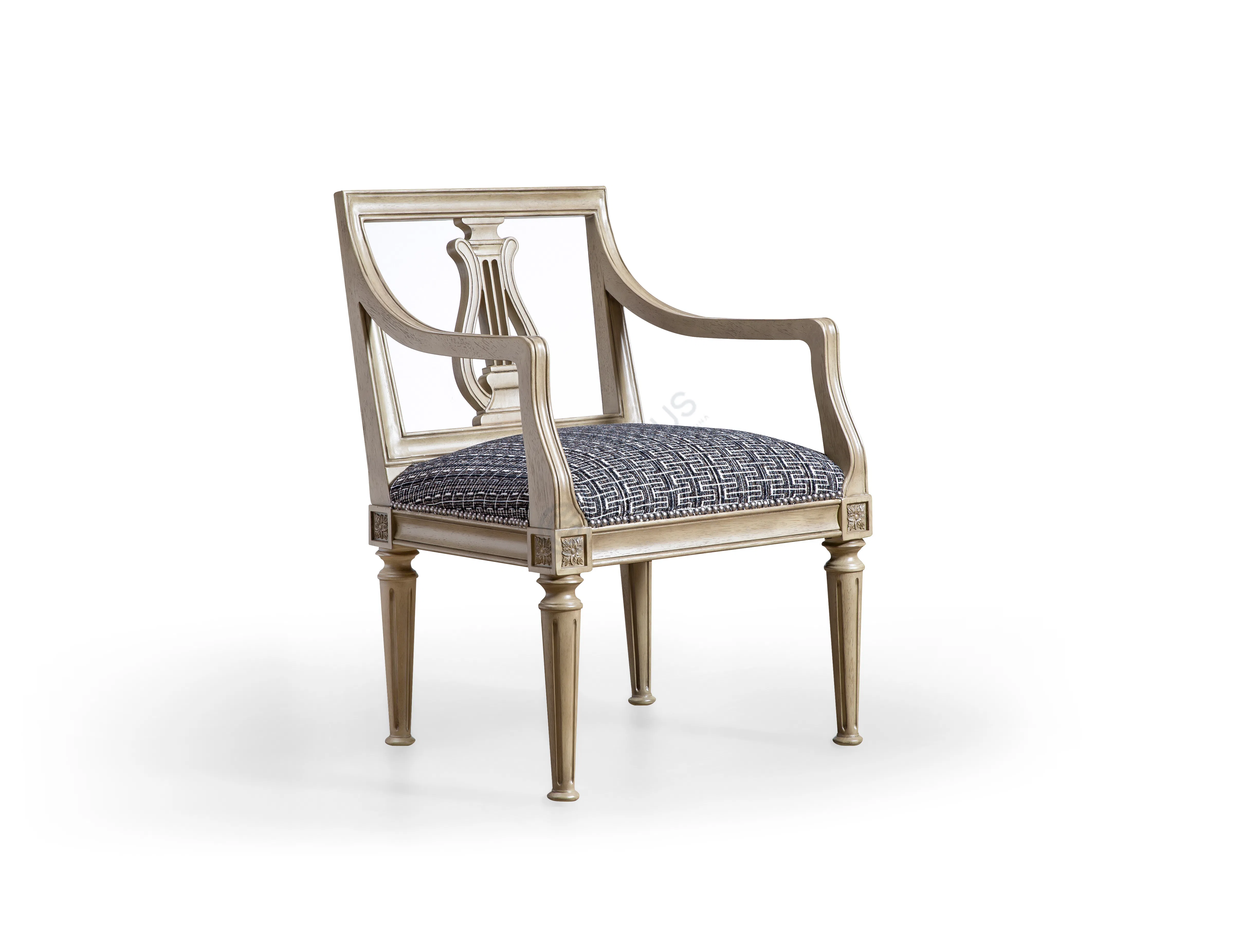 Каркас из массива надежен и аккуратно отделан. Сиденье обтянуто текстилем со спокойным геометрическим рисунком, дарит комфорт и оформлено деликатной окантовкой. Резные розетки на царгах и конические ножки поддерживают характер предмета.