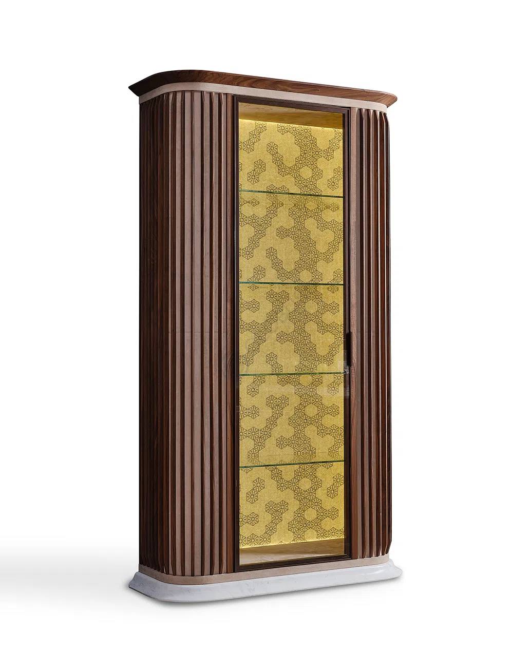 Внутри шкафа предусмотрено продуманное пространство для хранения, выполненное из натурального дерева и фанеры, возможно, с полками из закаленного стекла для демонстрации ценных предметов. Интегрированная светодиодная подсветка делает содержимое легко доступным и добавляет визуального интереса. Тонкие детали из нержавеющей стали завершают образ, подчеркивая современный стиль композиции.