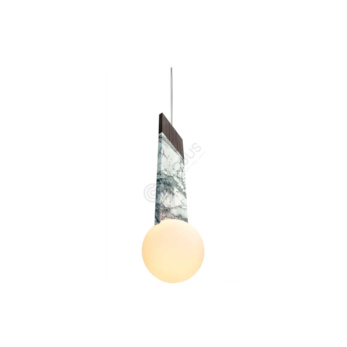 Основание светильника выполнено из натурального мрамора с неповторимым природным узором, где каждый слэб уникален, рассказывая свою историю в глубоких оттенках и прожилках. Детали из полированной меди придают композиции теплое сияние и подчеркивают статус изделия. Венчает конструкцию сферический плафон из матового стекла, мягко рассеивающий свет.