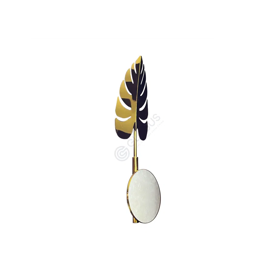 Основание светильника выполнено из натурального мрамора, чей уникальный узор добавляет каждому экземпляру неповторимость и глубину. Верхняя часть представляет собой композицию из стилизованных элементов, напоминающих листья, выполненных из полированной меди. Теплый блеск металла контрастирует с прохладной текстурой камня, подчеркивая изящество линий.