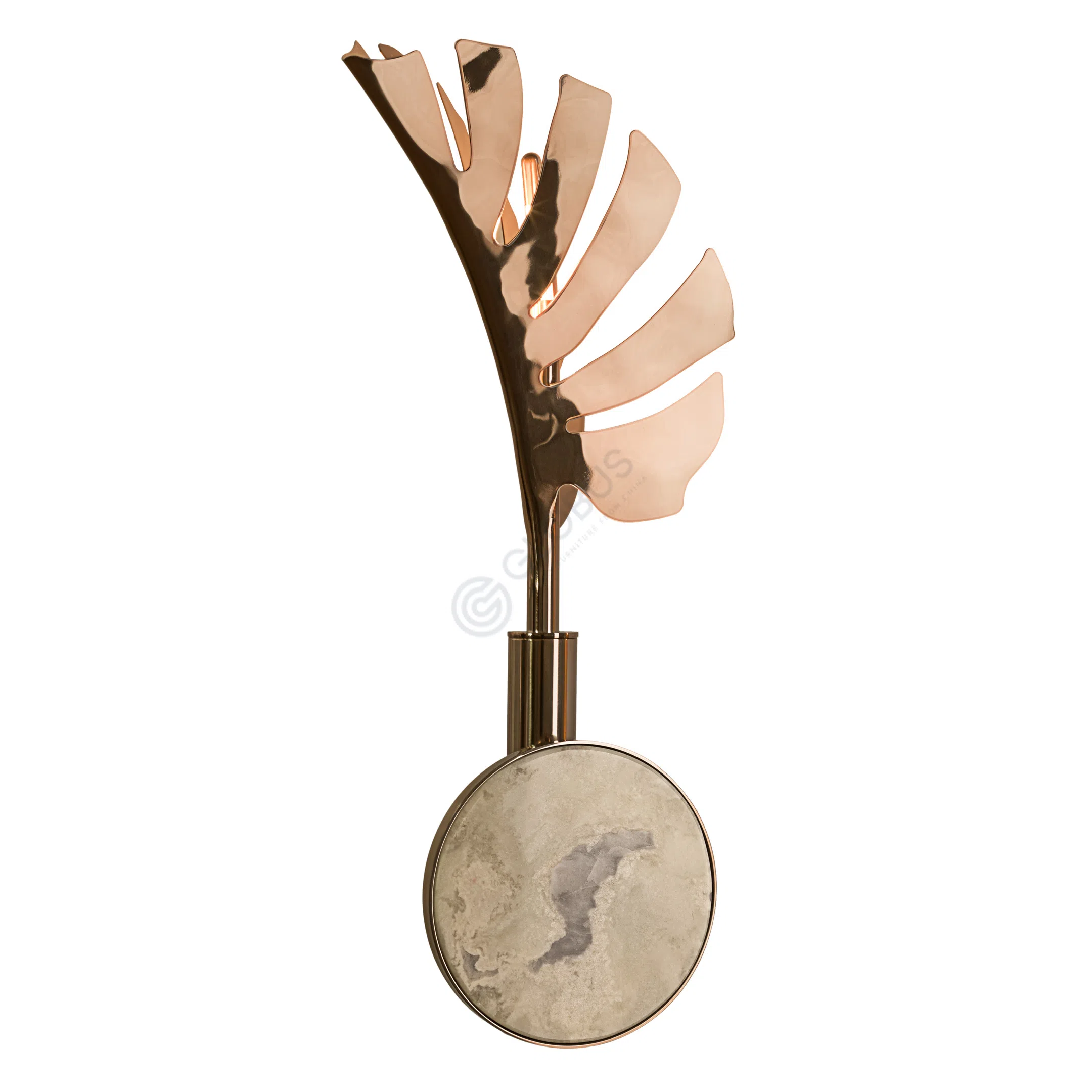 Основание светильника выполнено из натурального мрамора, чей уникальный узор добавляет каждому экземпляру неповторимость и глубину. Верхняя часть представляет собой композицию из стилизованных элементов, напоминающих листья, выполненных из полированной меди. Теплый блеск металла контрастирует с прохладной текстурой камня, подчеркивая изящество линий.