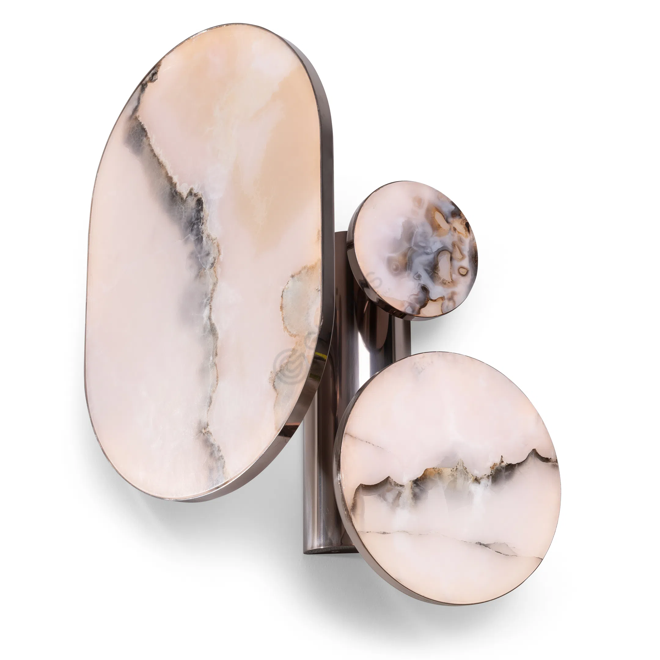 Предмет освещения воплощает современную элегантность. Его дизайн построен на гармоничном сочетании природных материалов и искусной обработки. Несколько дисков разного диаметра, расположенных в каскадном порядке, создают динамичный и при этом утонченный силуэт.