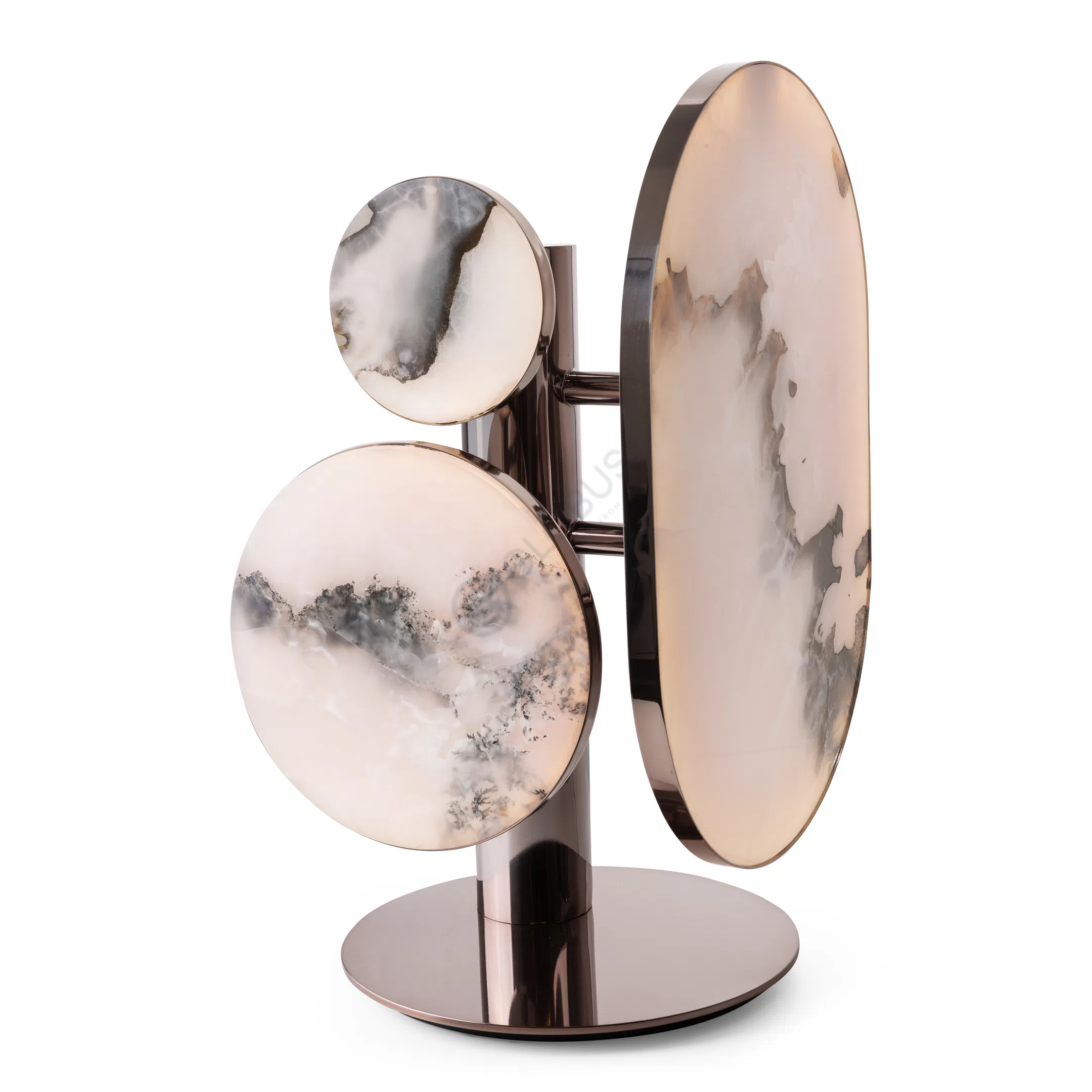 Основными элементами декора выступают диски из натурального мрамора с уникальными природными прожилками и пластины из полированной меди. Мрамор придает изделию благородство и неповторимый узор, тогда как медные детали добавляют теплого сияния и отражают свет, обогащая визуальное восприятие. Такое сочетание фактур и оттенков создает ощущение роскоши и изысканности.