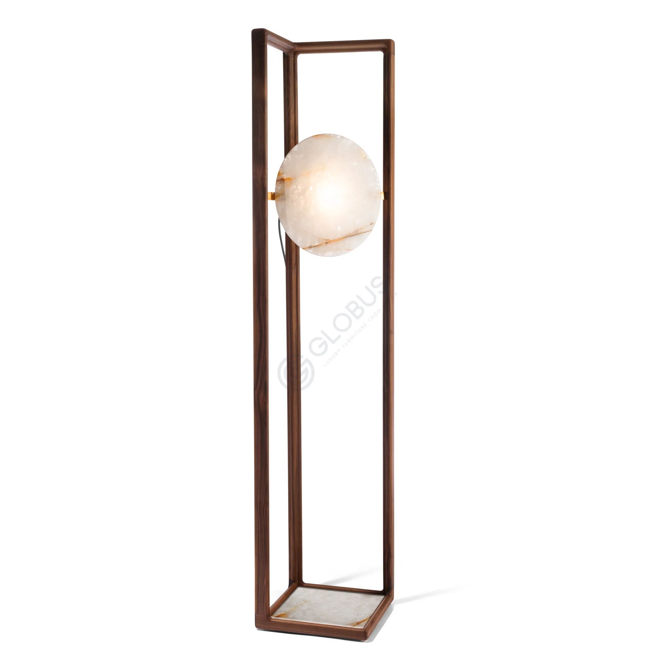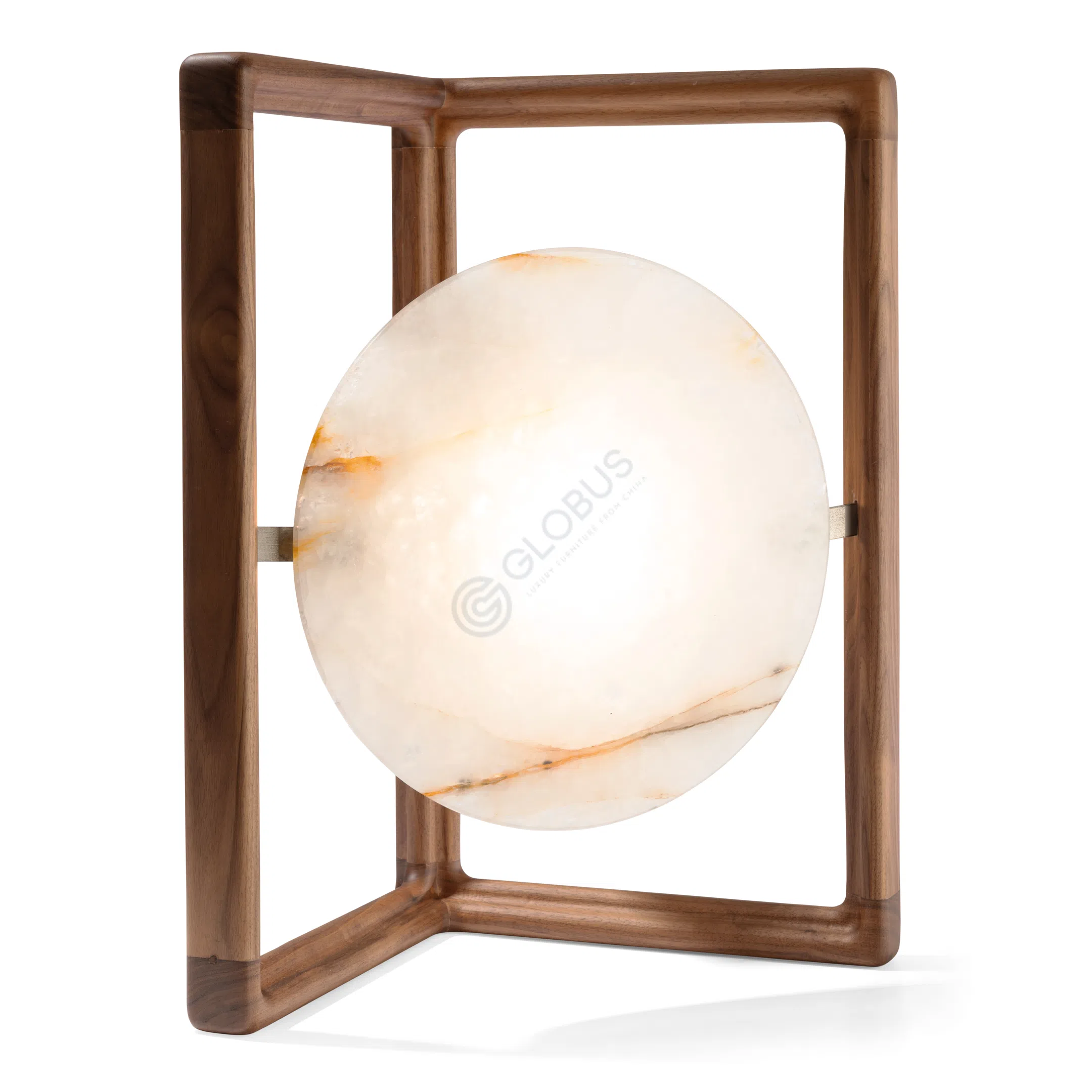 Окружает каменный плафон каркас из натурального дерева. Благородный оттенок древесины и четкие линии рамы подчеркивают чистоту и изящество каменного диска. Сочетание этих двух материалов создает сбалансированный и тактильно приятный вид, демонстрируя высокое качество исполнения и внимание к деталям.