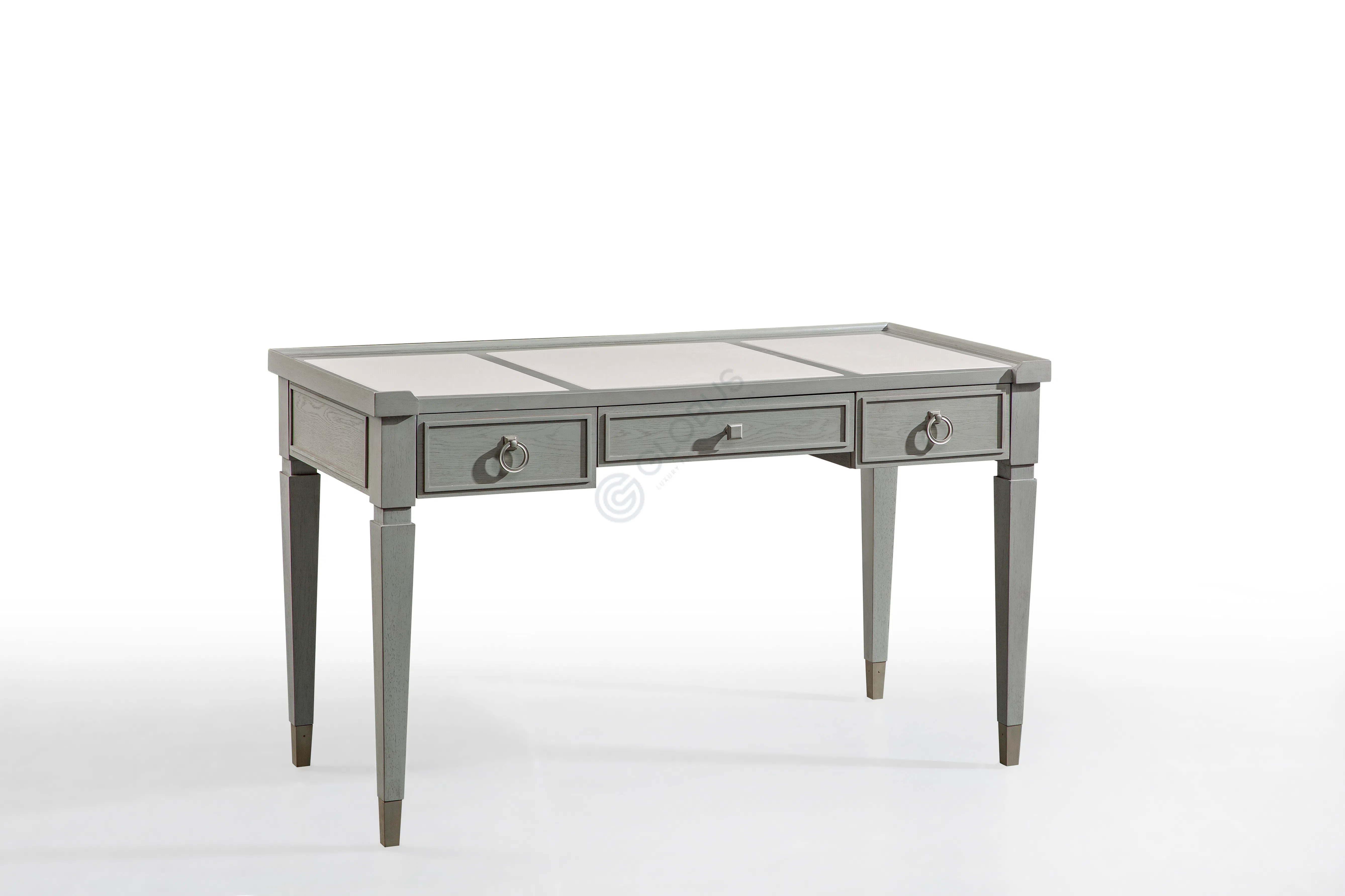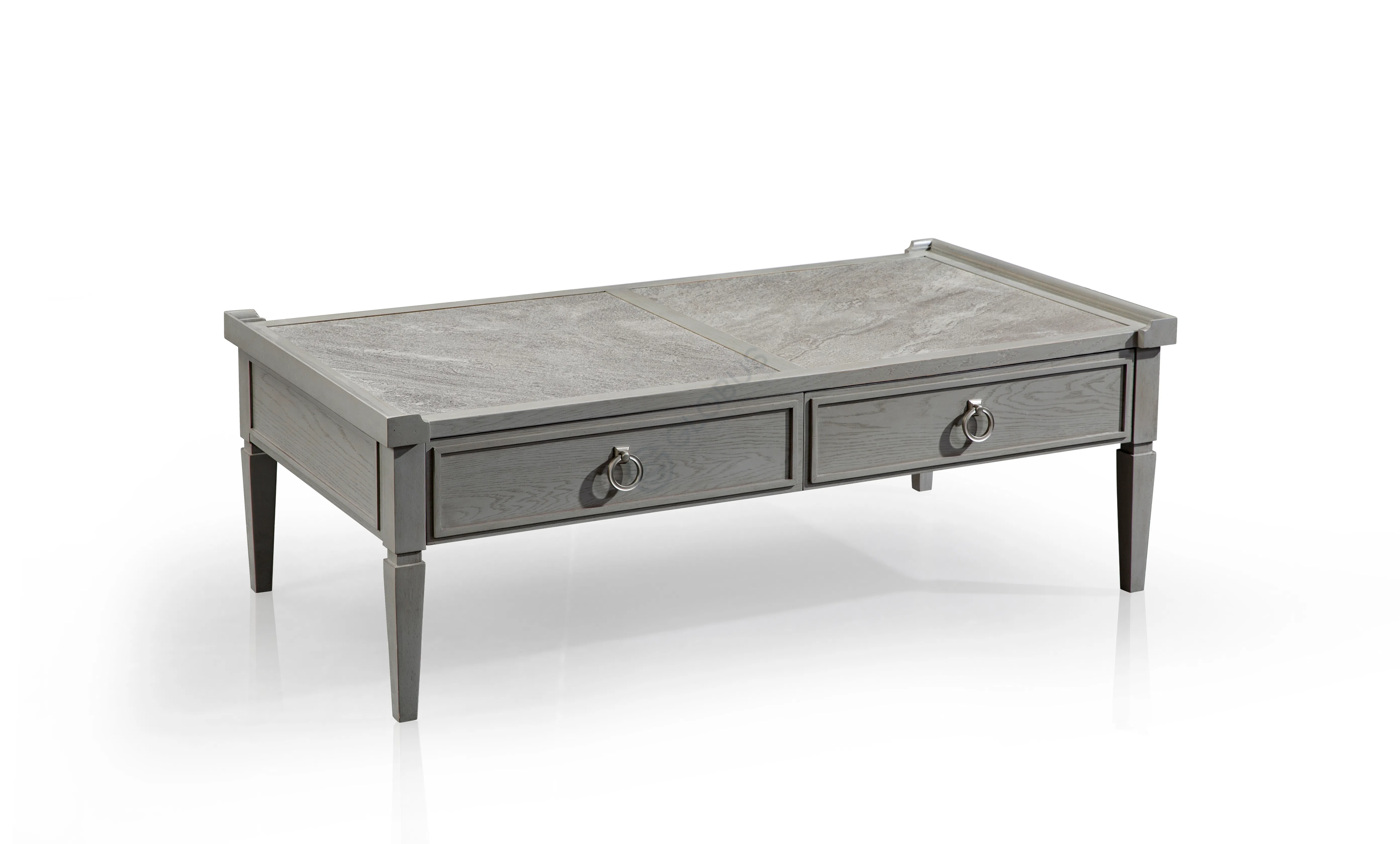 Сдержанный угловой столик для гостиной в духе неоклассики и американской классики. Пропорции выверены, ножки плавно сужаются к низу, фасад украшает аккуратный ящик с кольцевой ручкой. Столешница обрамлена высокими кромками, в центре — изящная вставка из спеченного камня в благородном сером оттенке.