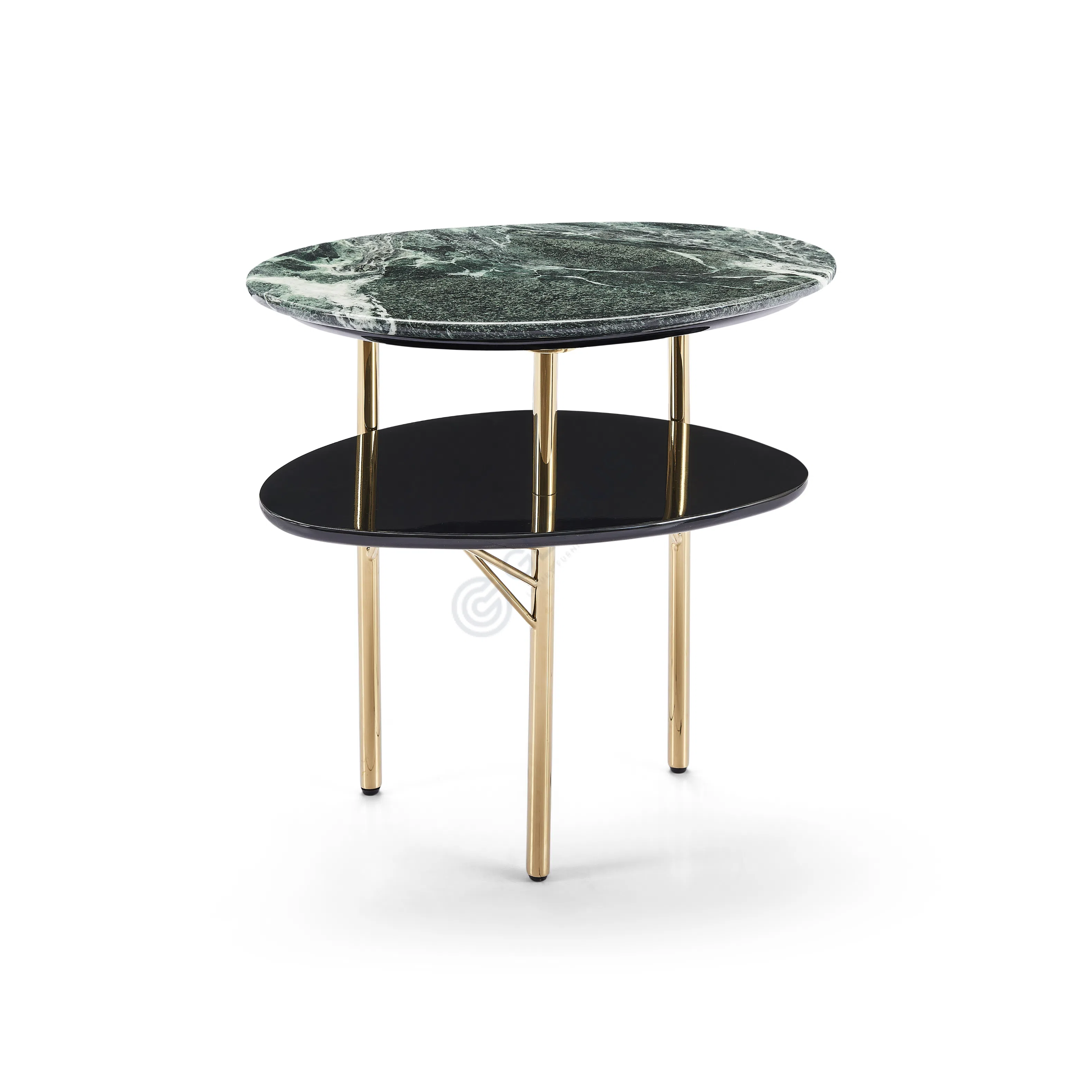 Двухуровневый журнальный столик сочетает строгие линии нержавеющей стали, натурального мрамора и прочной фанеры. Верхняя столешница из камня красивого изумрудного оттенка плавно переходит к низкой полке с лаковым покрытием. Металлические опоры создают ощущение легкости и визуального простора.