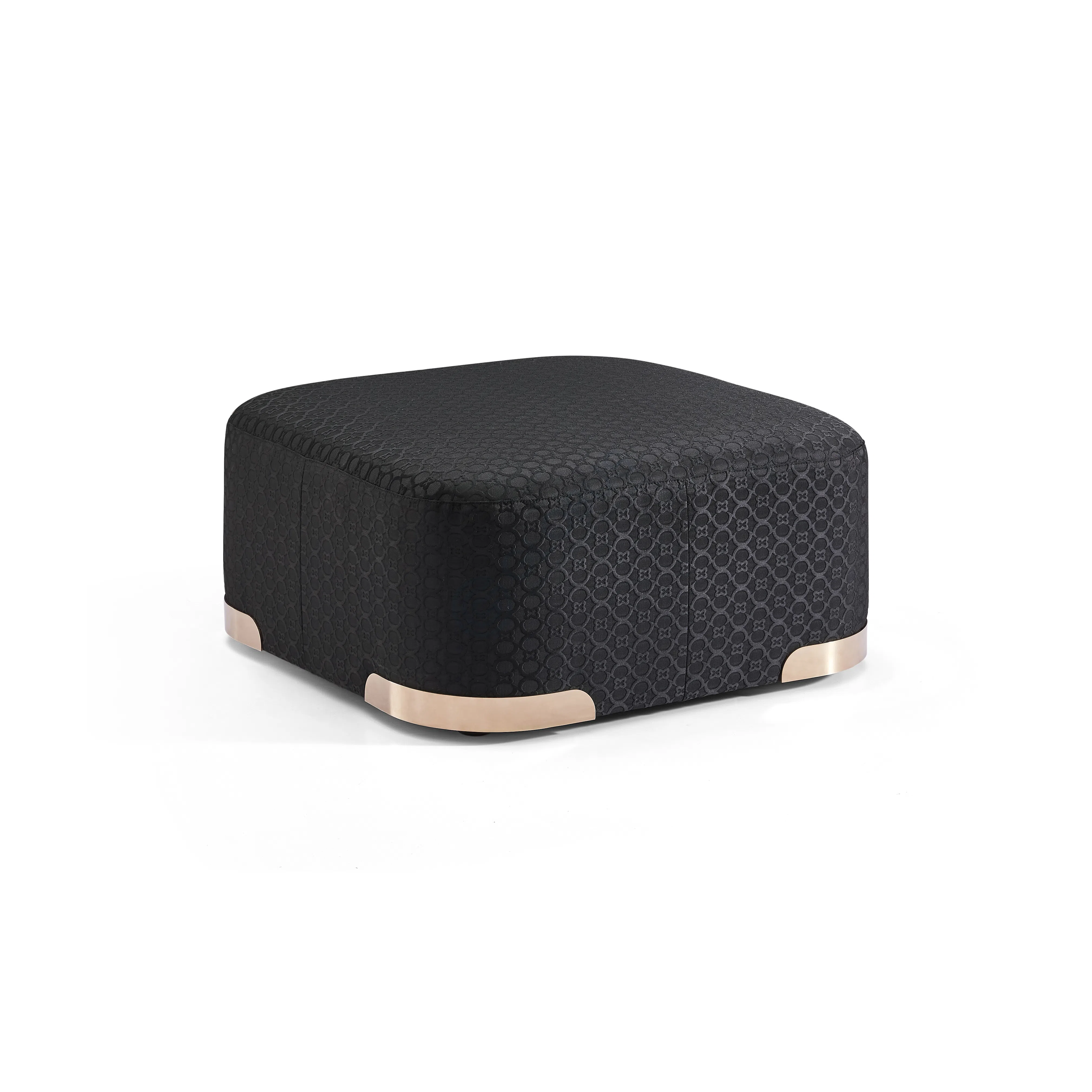 Основание пуфа украшает тонкий кант из нержавеющей стали с изящным золотистым покрытием. Этот металлический акцент добавляет изделию утонченности и делает его заметным элементом интерьера. Внутренняя конструкция, состоящая из натурального дерева и прочной фанеры, гарантирует устойчивость и долговечность.