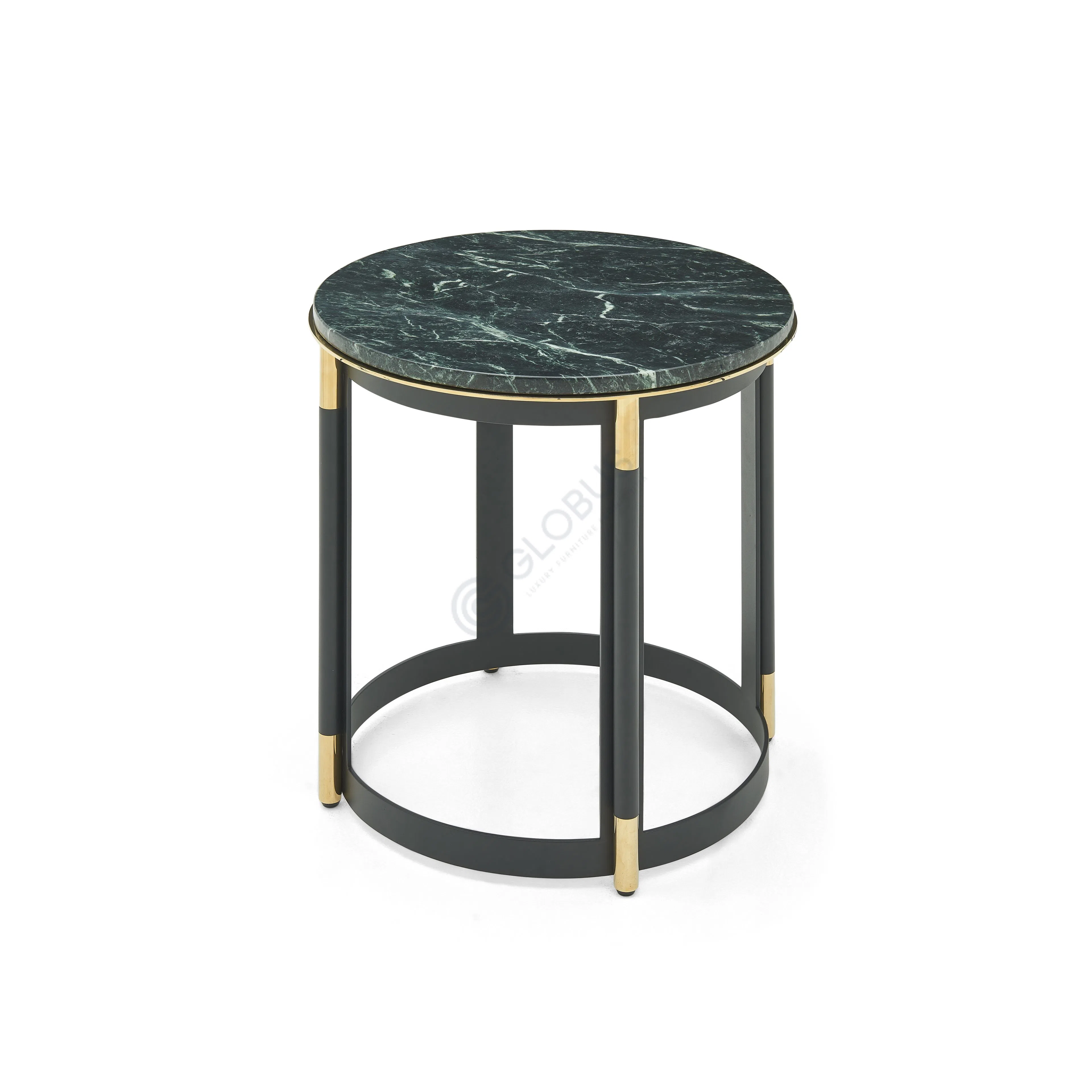 Основание столика создано из прочной углеродистой и нержавеющей стали. Стройные опоры, дополненные тонкими акцентами из стали с золотистым блеском, поддерживают столешницу, создавая ощущение легкости и воздушности. Нижний круглый элемент придает конструкции завершенность и устойчивость.