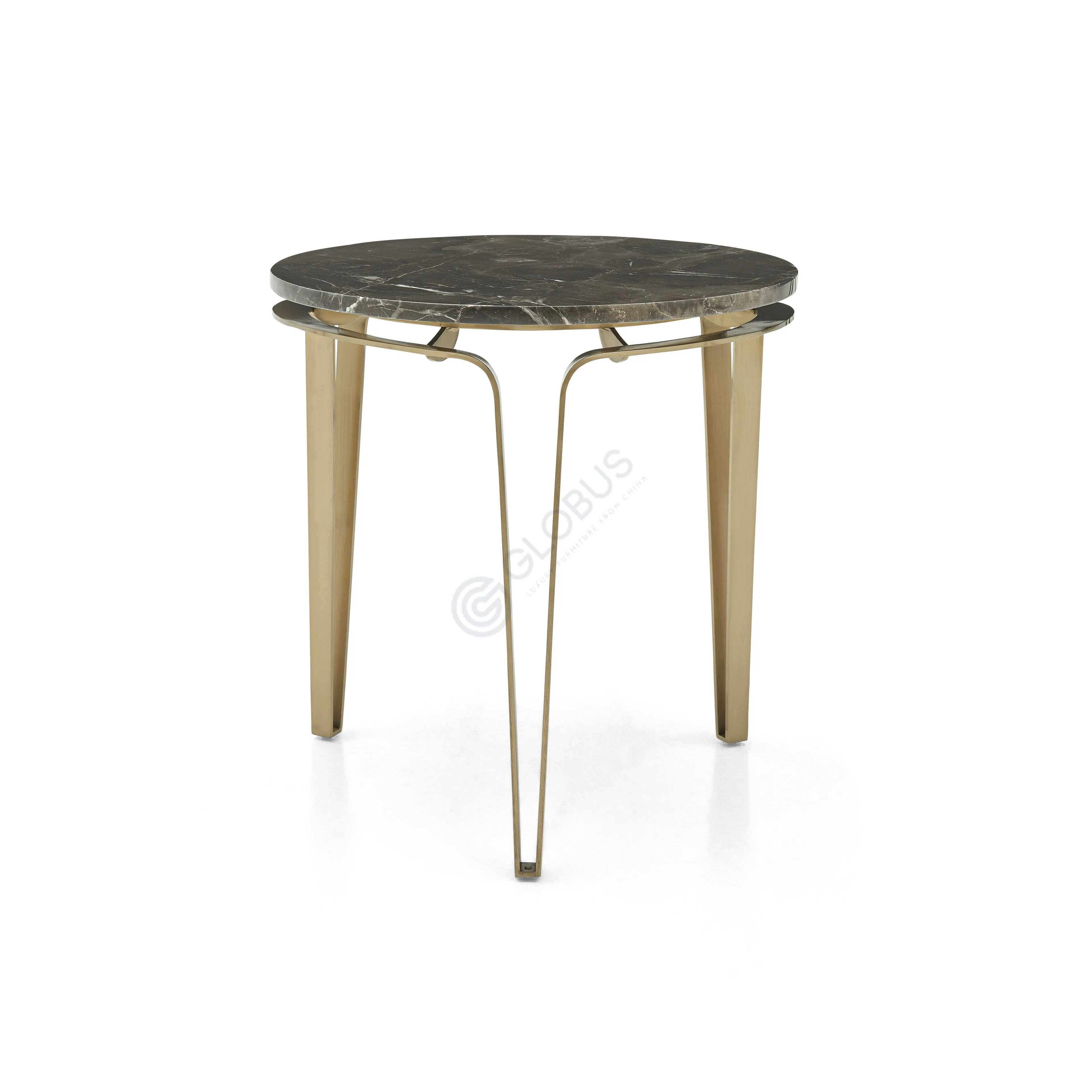 Поверхность из мрамора отличается ровной полировкой и естественным рисунком прожилок, подчёркивающим благородство камня. Опора из нержавеющей стали с деликатным золотистым оттенком обеспечивает устойчивость и долговечность конструкции.