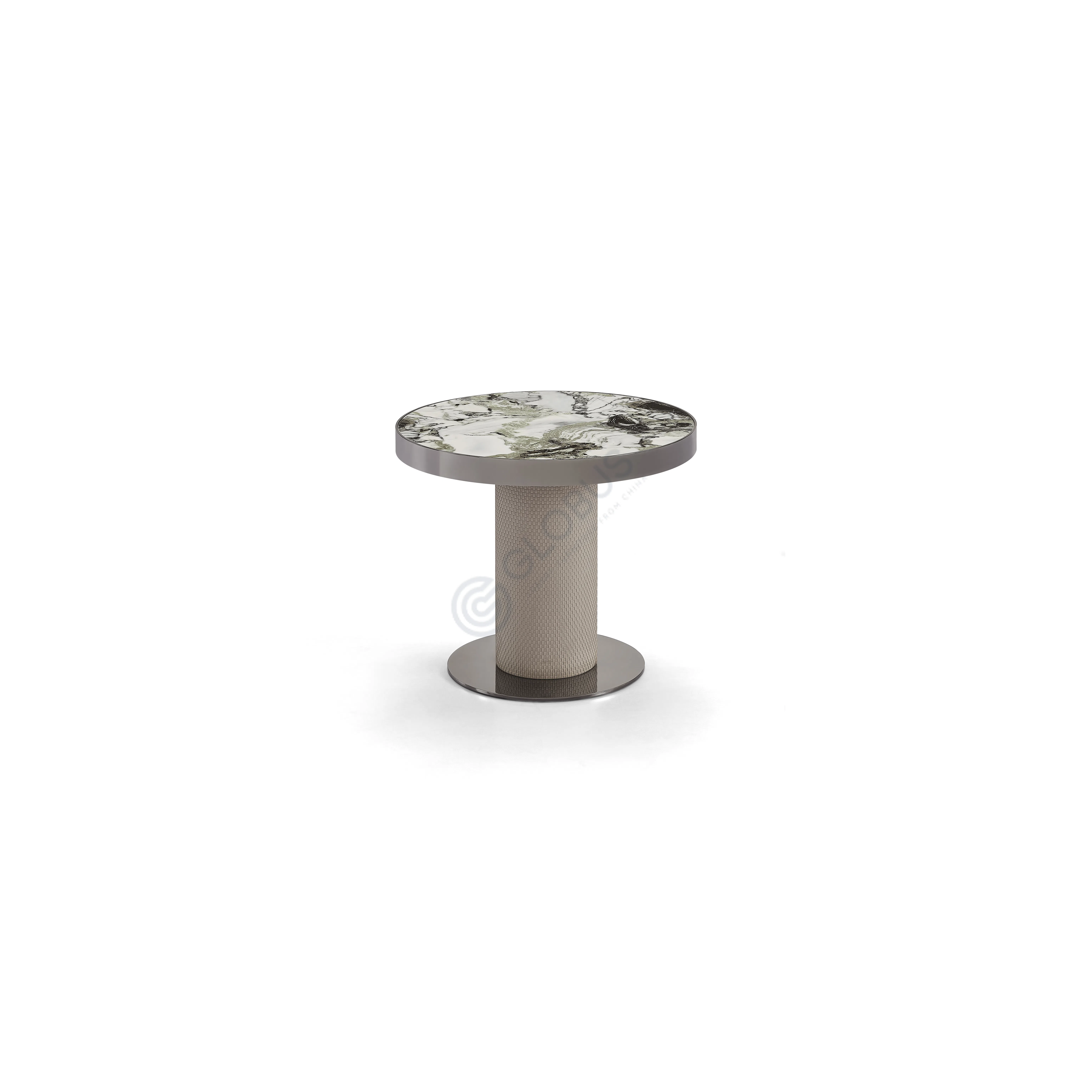 Изящный журнальный столик современного дизайна объединяет блеск полированной нержавеющей стали, благородство спеченного камня и мягкую фактуру кожи. Округлая столешница обладает термостойкостью и стойкостью к царапинам, предлагая ровную и прочную рабочую зону для чашки и аксессуаров. Центральная колонна, обтянутая натуральной кожей, добавляет тактильного интереса и визуального контраста.