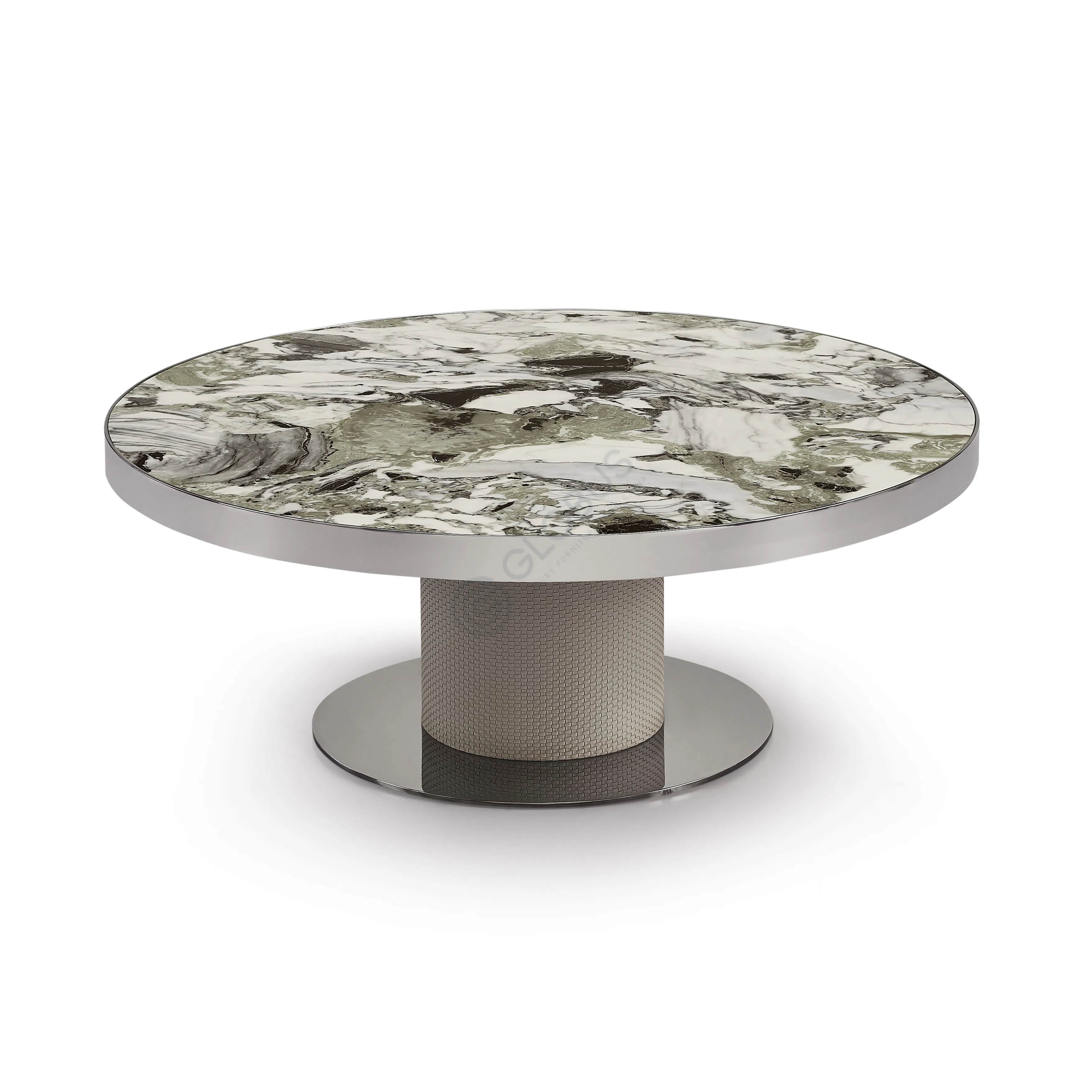 Угловой столик представлен круглой столешницей из спеченного камня с выразительным рисунком. Основание из нержавеющей стали выполнено в лаконичной форме, а цилиндрическая опора обтянута натуральной кожей бежевого оттенка.