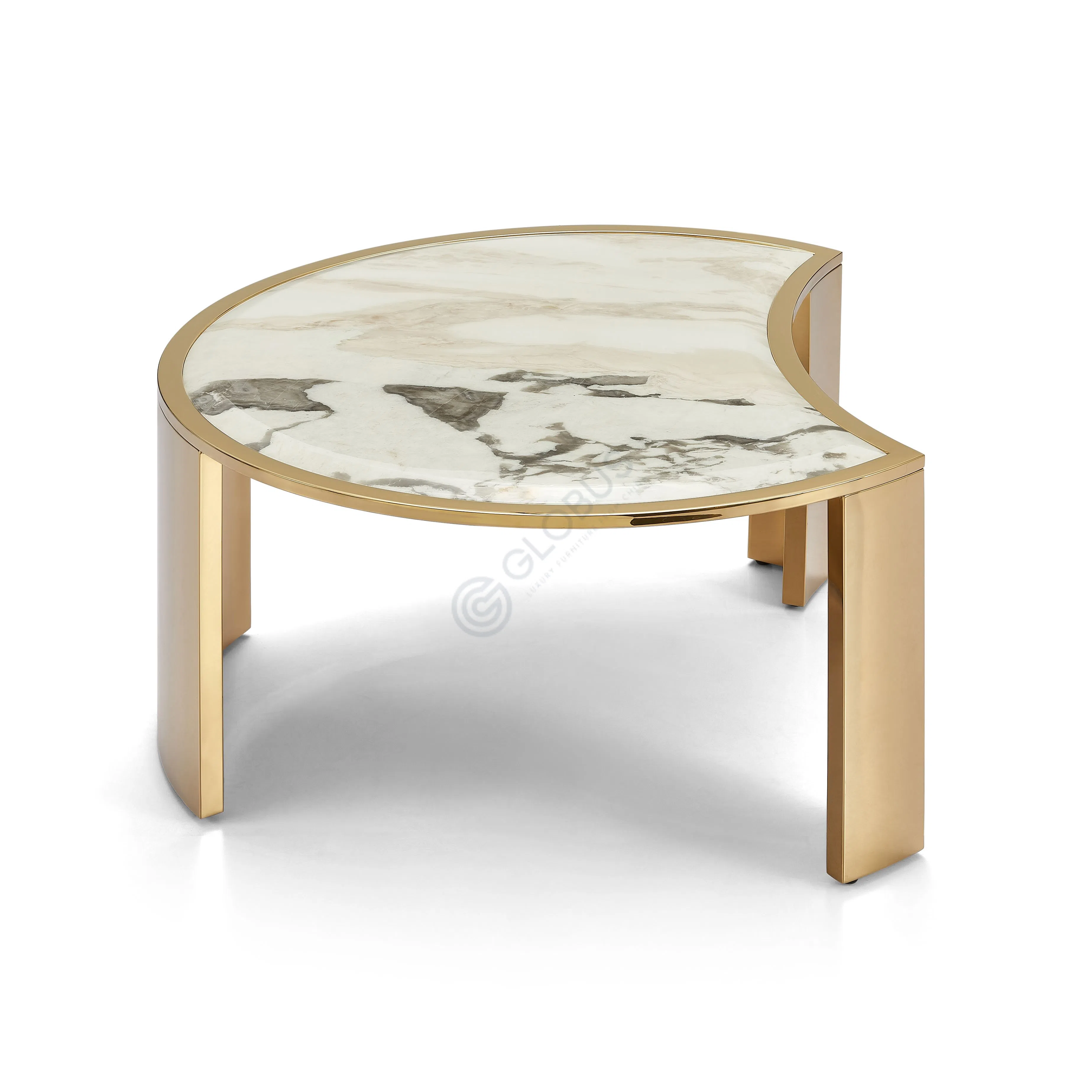 Основание изготовлено из нержавеющей стали с зеркальной полировкой золотистого оттенка, устойчивой к коррозии и лёгкой в уходе. Верхняя плоскость выполнена из натурального мрамора с тонкой сеткой контрастных прожилок, придающей изделию глубину и выразительность.
