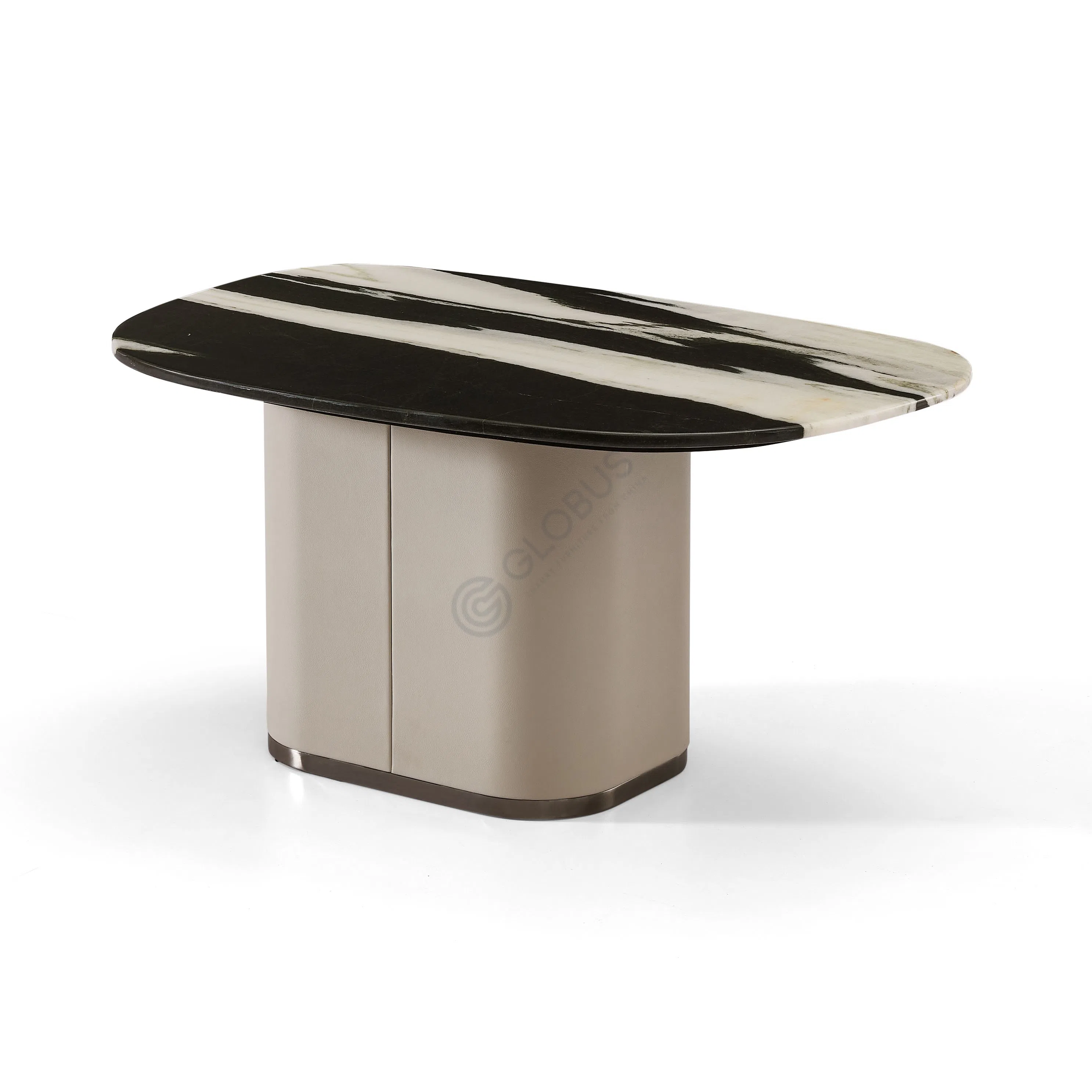 Угловой столик сочетает строгую геометрию и натуральную фактуру камня. Столешница из цельного мрамора с выразительным контрастным рисунком опирается на основание из полированной нержавеющей стали, обтянутое эко-кожей на микрофибре. Такое сочетание металла и текстиля создаёт гармоничное переплетение холодных и тёплых оттенков.