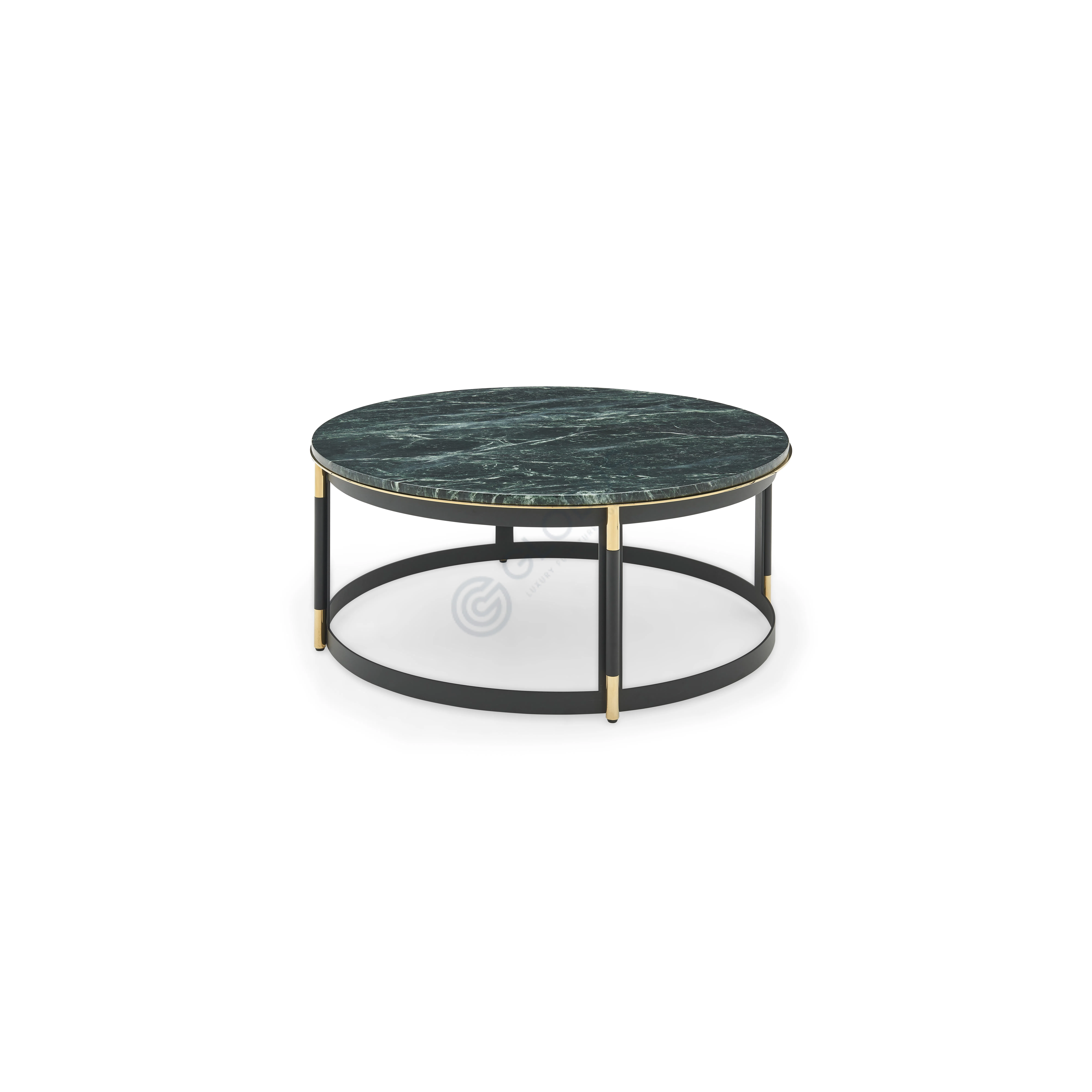 Столик из натурального мрамора темно-зеленого оттенка опирается на каркас из нержавеющей и углеродистой стали с аккуратными золотистыми вставками на опорах. Аскетичная геометрия конструкции и сочетание благородных материалов соответствуют современному стилю, привнося в гостиную сдержанную элегантность.