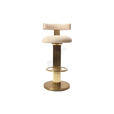 Круглая столешница из натурального темно-зеленого мрамора с мягким рисунком прожилок опирается на цилиндрическое основание из нержавеющей стали с матовой бронзовой отделкой.