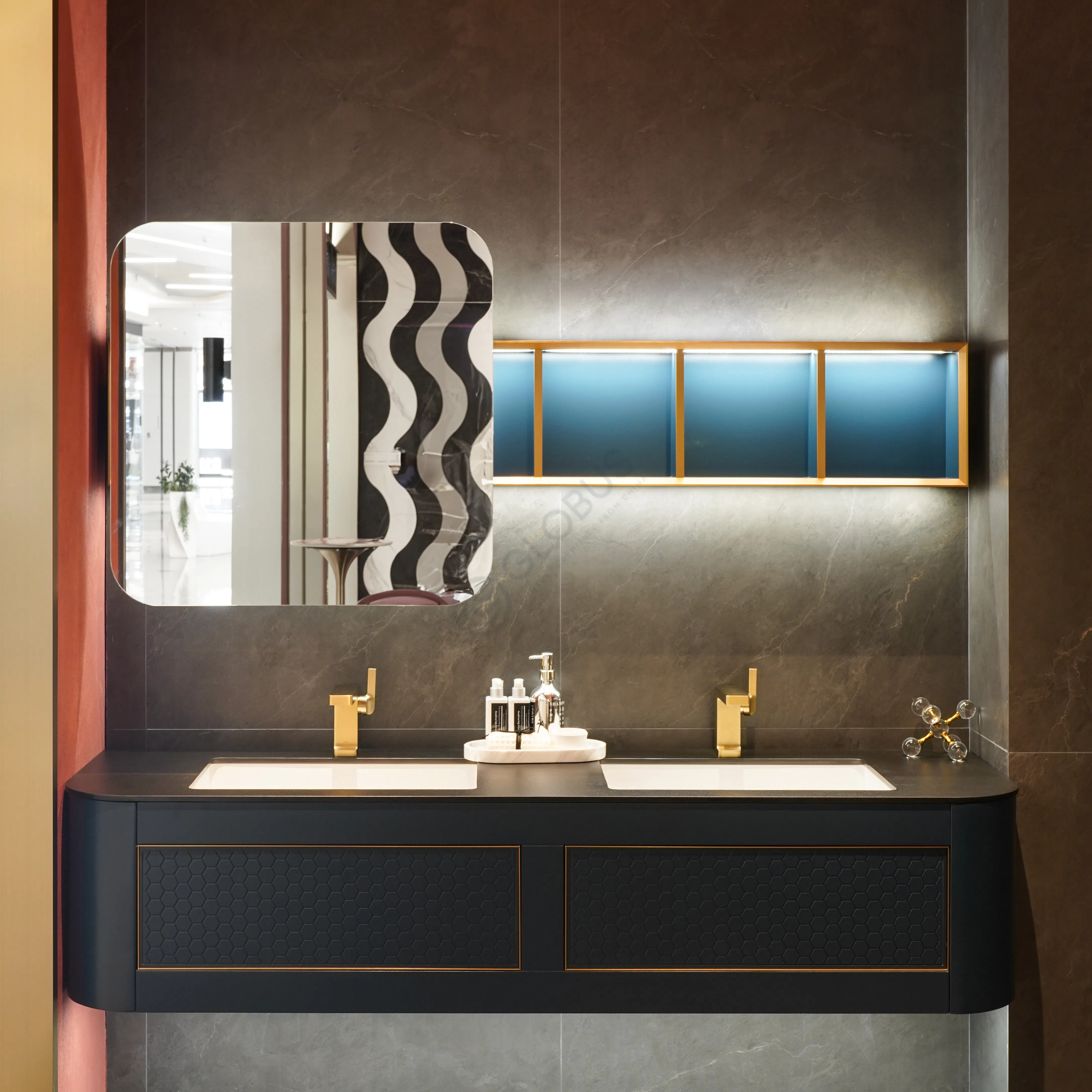 Столешница выполнена из спеченного камня — материала, известного своей исключительной прочностью, гигиеничностью и устойчивостью к царапинам и пятнам, что идеально подходит для использования в ванной комнате. Интегрированная подсветка, вероятно, с использованием светодиодных элементов, придает дополнительную глубину и создает мягкое, приятное освещение, подчеркивающее текстуру и отделку поверхности.