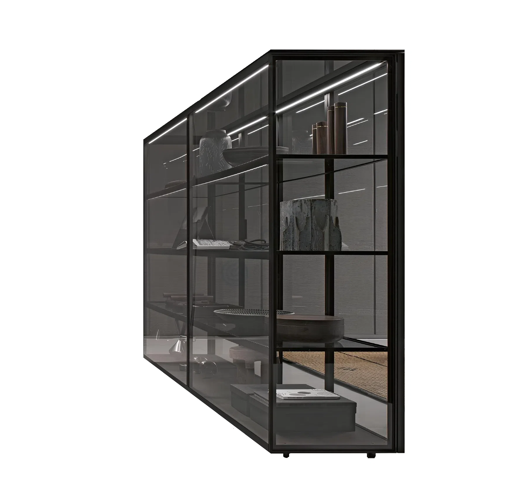 Этот изящный стеллаж предстает как вертикальный акцент, способный преобразить любое пространство. Его современный дизайн сочетает в себе легкость прозрачного стекла и благородство натуральных материалов, создавая утонченную витрину для самых ценных предметов.