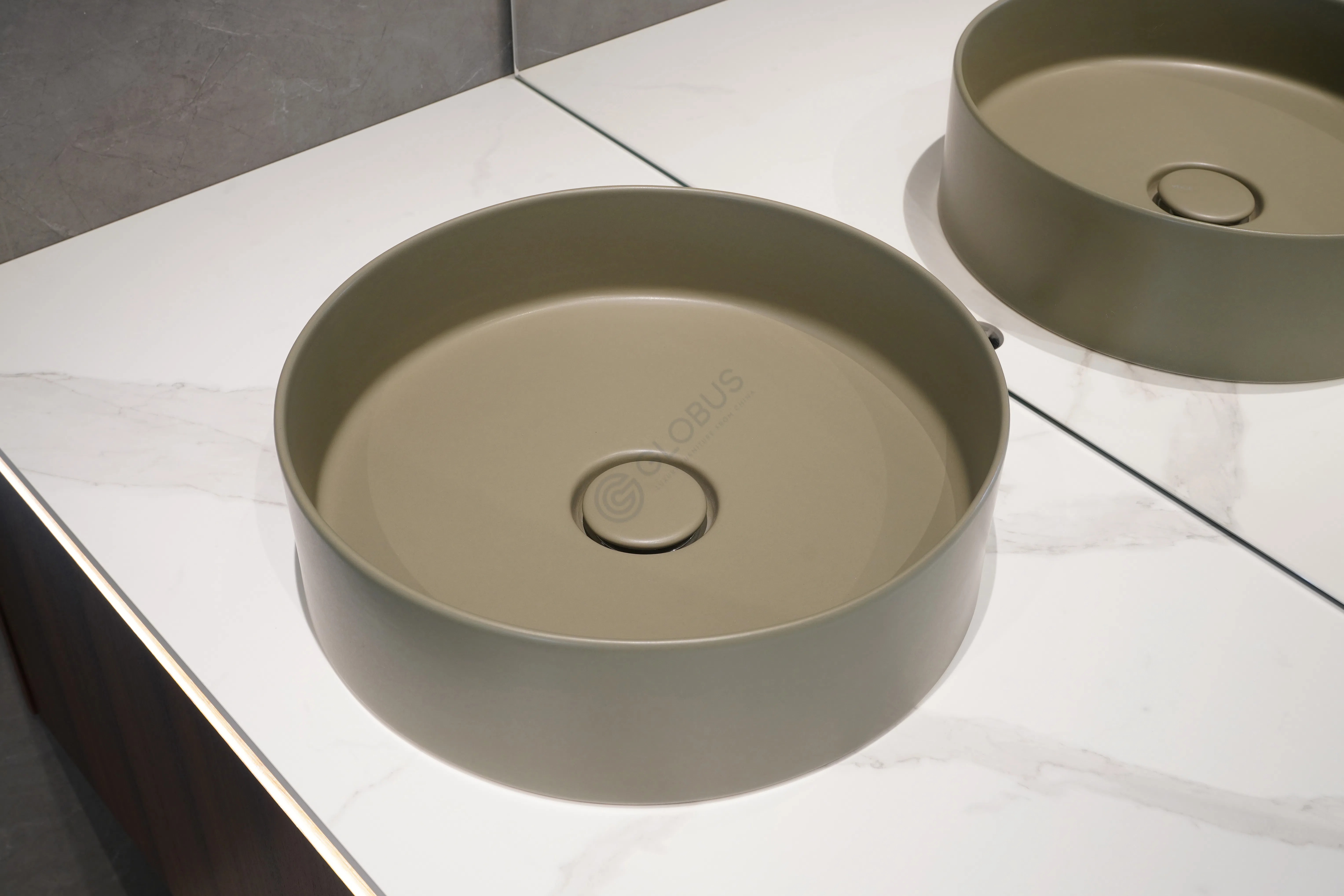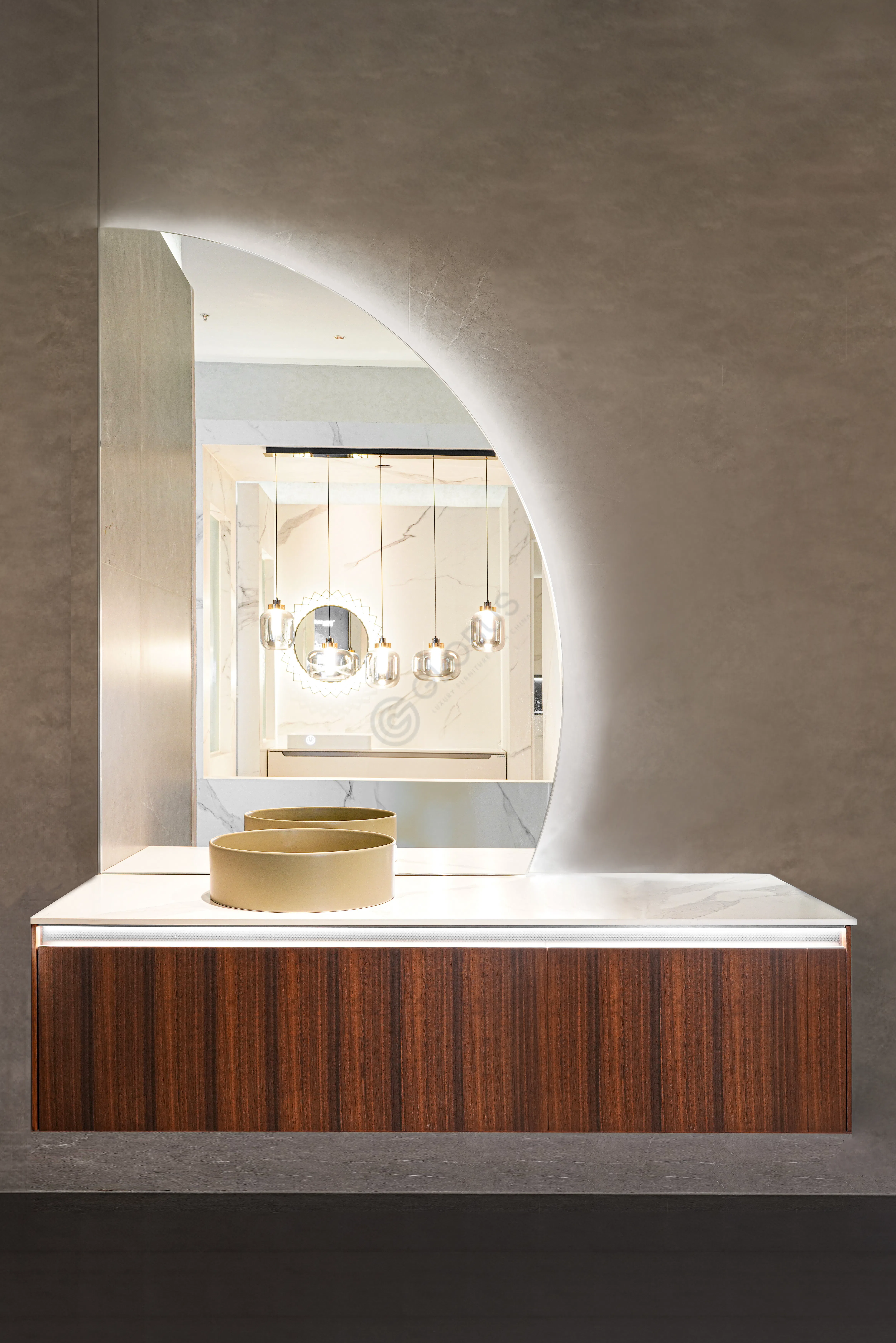 Фасад изделия выполнен из высококачественной фанеры, облицованной шпоном с выразительной древесной текстурой. Вертикальное расположение волокон придает поверхности динамичность и глубину, становясь притягательным акцентом. Столешница, изготовленная из прочного спеченного камня, обладает безупречной гладкостью и устойчивостью к воздействию влаги и перепадов температур, что делает ее идеальным выбором для ванной.