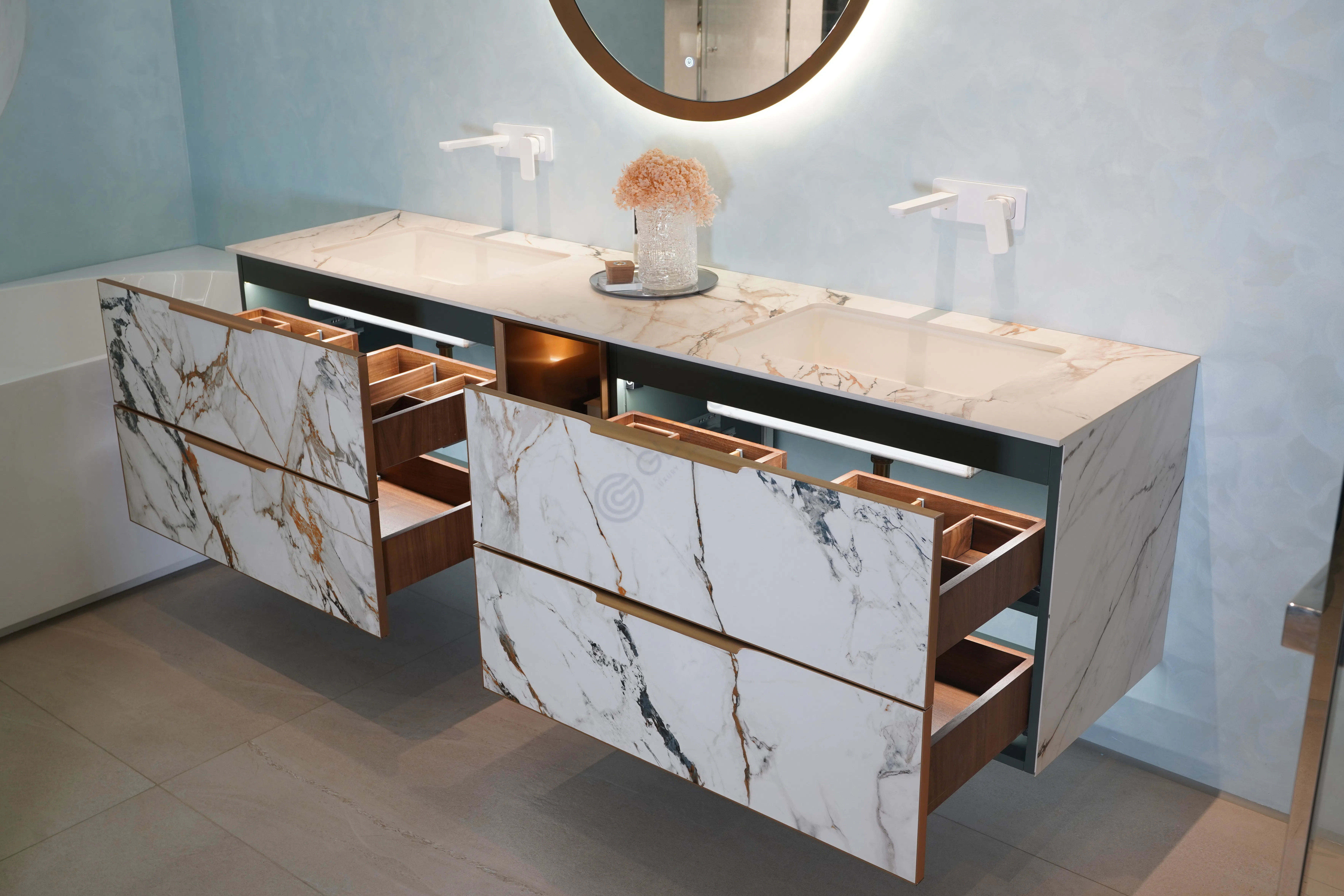 Круглое зеркало с металлизированной рамой и элегантной подсветкой из светодиодов создаёт атмосферу утончённости и комфорта. Этот стильный элемент интерьера не только визуально увеличивает пространство, но и обеспечивает мягкое, равномерное освещение. Изысканный дизайн гармонично сочетается с современными материалами и технологиями, акцентируя внимание на деталях и подчеркивая ваш элегантный вкус.