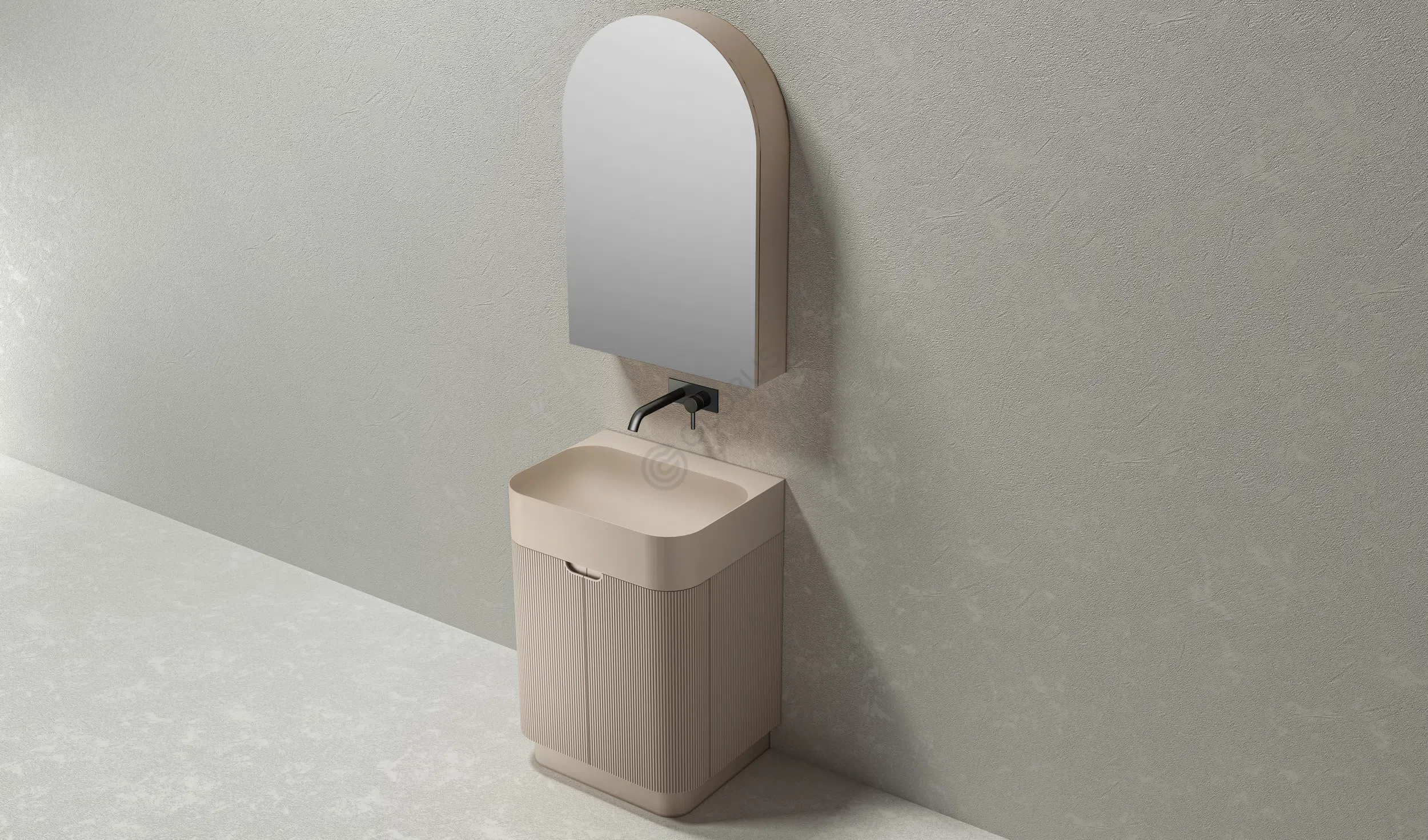 Корпус изделия выполнен из морской фанеры, материала, который прекрасно адаптирован к условиям повышенной влажности, обеспечивая надежность и долговечность конструкции. Фасад украшает деликатная вертикальная рельефная текстура, создающая игру света и тени и подчеркивающая минималистичный стиль.