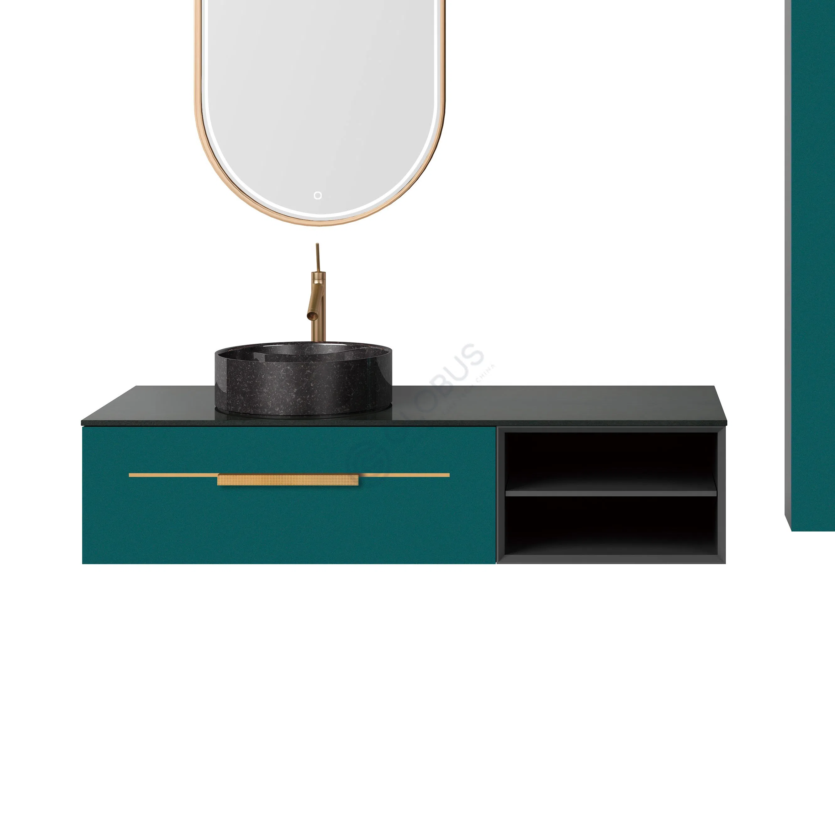 Этот предмет мебели сразу привлекает внимание своим насыщенным оттенком и изящной вертикальной формой. Его дизайн подчеркнут тонкими золотистыми линиями и гармоничными ручками, которые ненавязчиво интегрированы в фасады. Центральная часть с открытыми полками добавляет легкости и позволяет продемонстрировать декор или аккуратно сложенные полотенца, создавая интересный визуальный акцент.