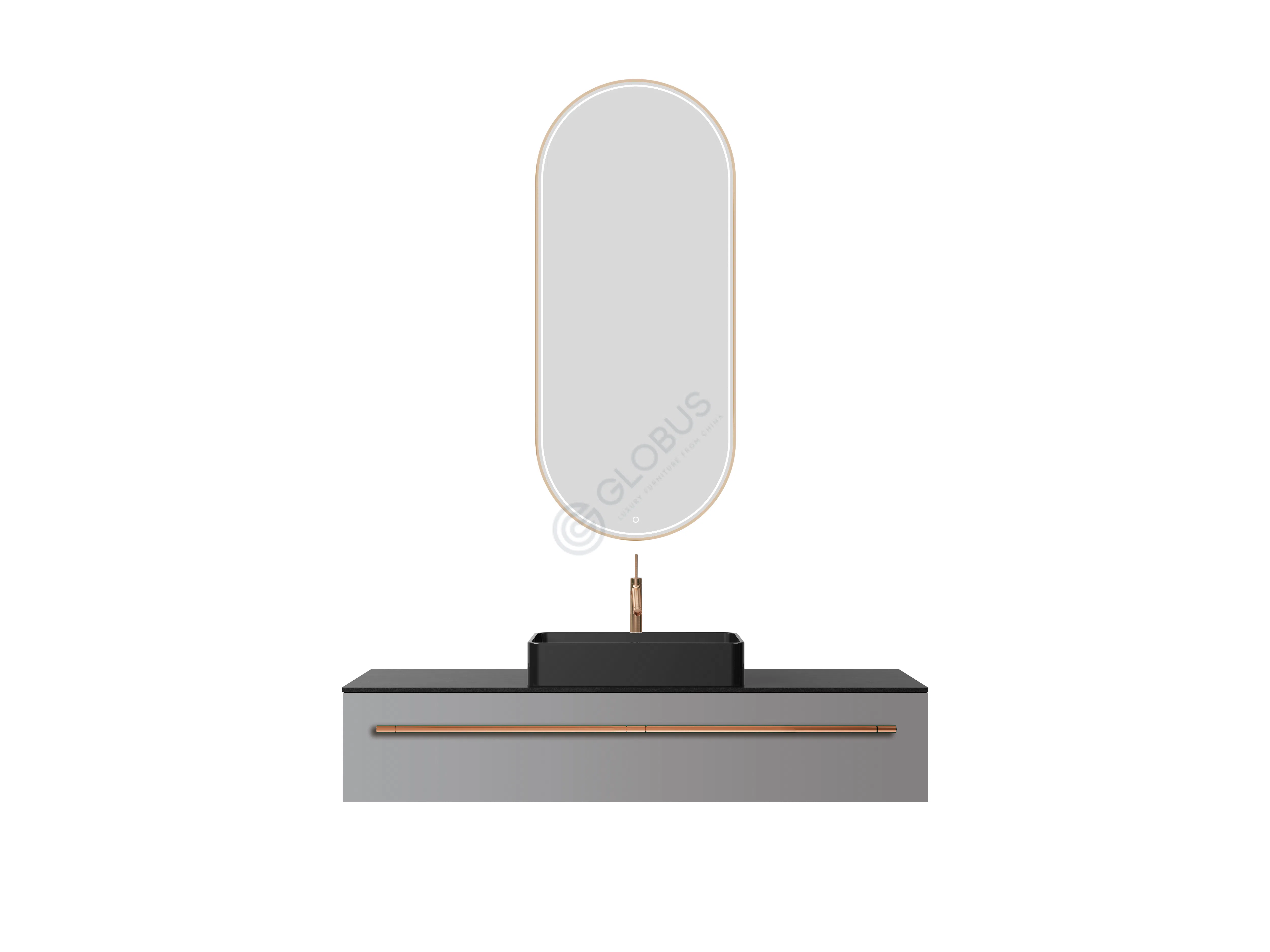 В основе конструкции использована морская фанера, гарантирующая исключительную стойкость к воздействию влаги и долговечность в условиях ванной. Столешница выполнена из спеченного камня, материала с уникальными характеристиками — он чрезвычайно прочный, гигиеничный и обладает роскошной текстурой, имитирующей природный материал. Металлические элементы добавляют изысканности и подчеркивают современный характер изделия.
