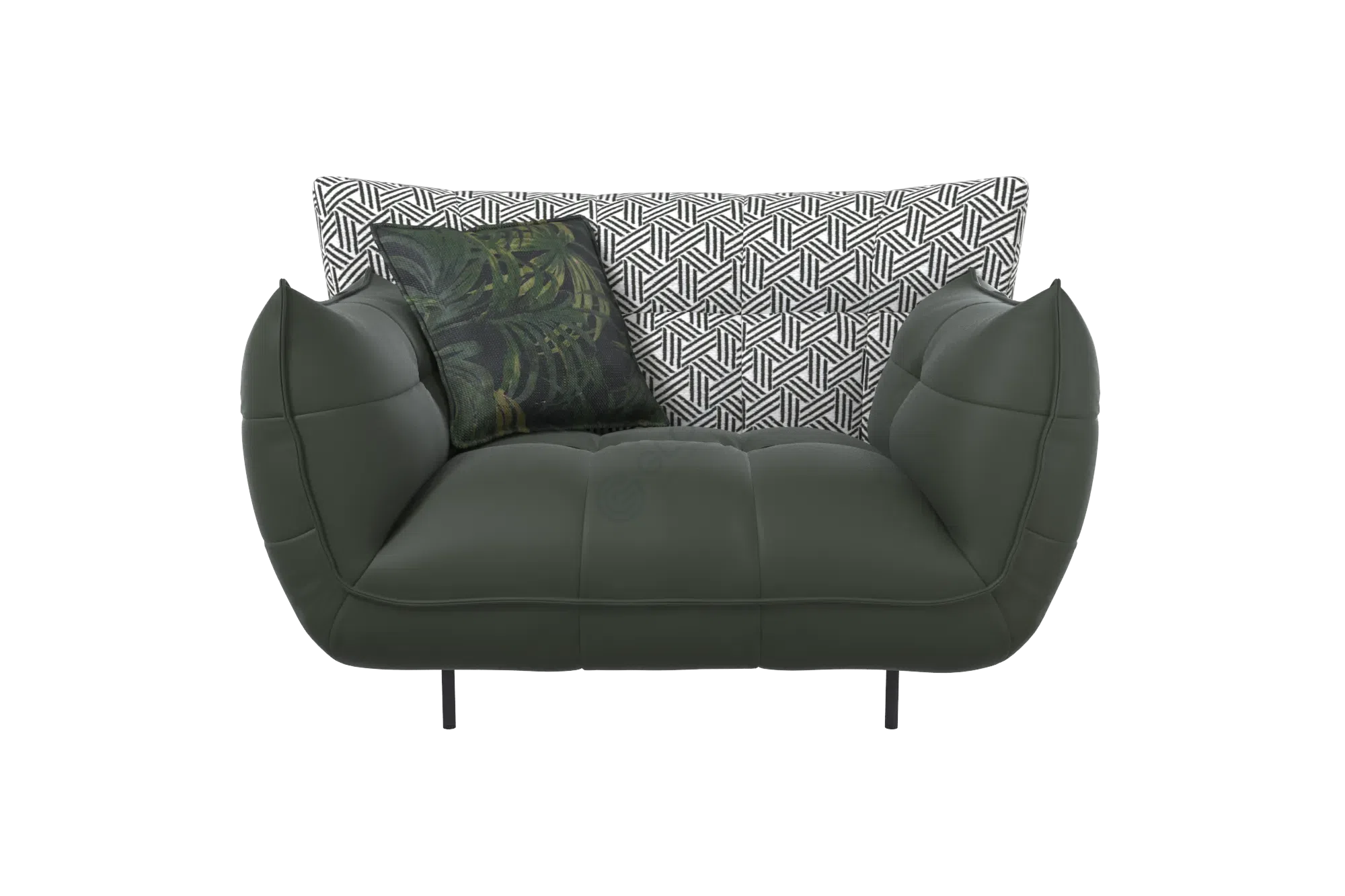 Используемые материалы подчеркивают премиальный статус. Основа конструкции выполнена из натурального дерева и фанеры, обеспечивая надежность и долговечность. Обивка предлагает роскошное сочетание нежной кожи для сиденья и подлокотников, в то время как задняя часть покрыта изысканным текстилем с уникальным узором, добавляющим выразительности. Детали из нержавеющей стали придают завершающий штрих, подчеркивая современный вид.