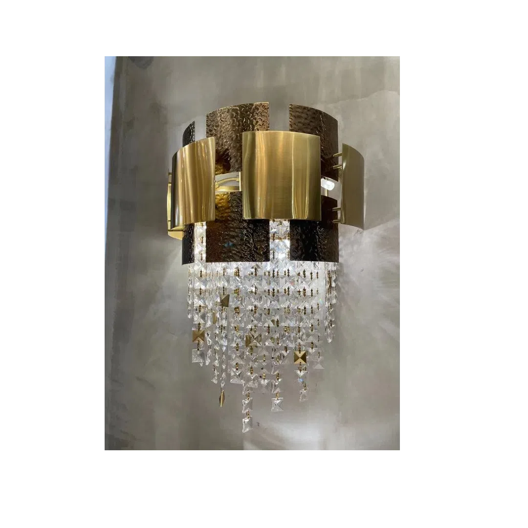 В основе дизайна лежит сочетание высококачественной латуни с мерцающими стеклянными элементами. Теплый металлический оттенок стойки и основания гармонично дополняет головную часть светильника, где архитектурная форма из латуни обрамляет каскады прозрачного стекла.