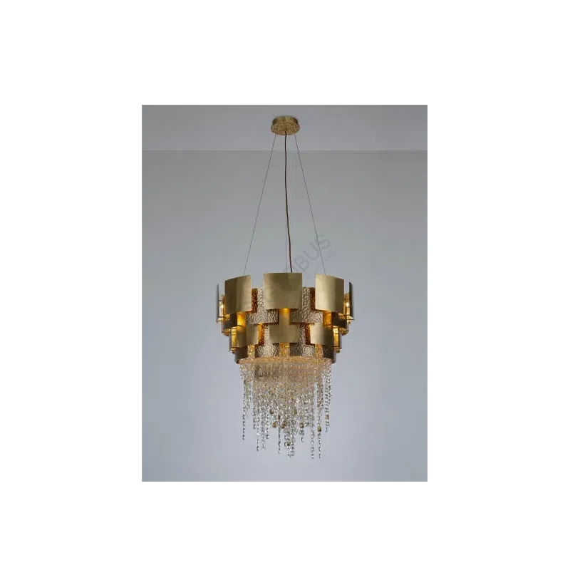 Абажур выполнен в многоуровневом стиле, напоминая о великолепии эпохи ар-деко, но с современным прочтением. Кристаллоподобные стеклянные подвески ловят и преломляют лучи света, создавая завораживающее сияние и игру бликов, наполняющих комнату особенной атмосферой.