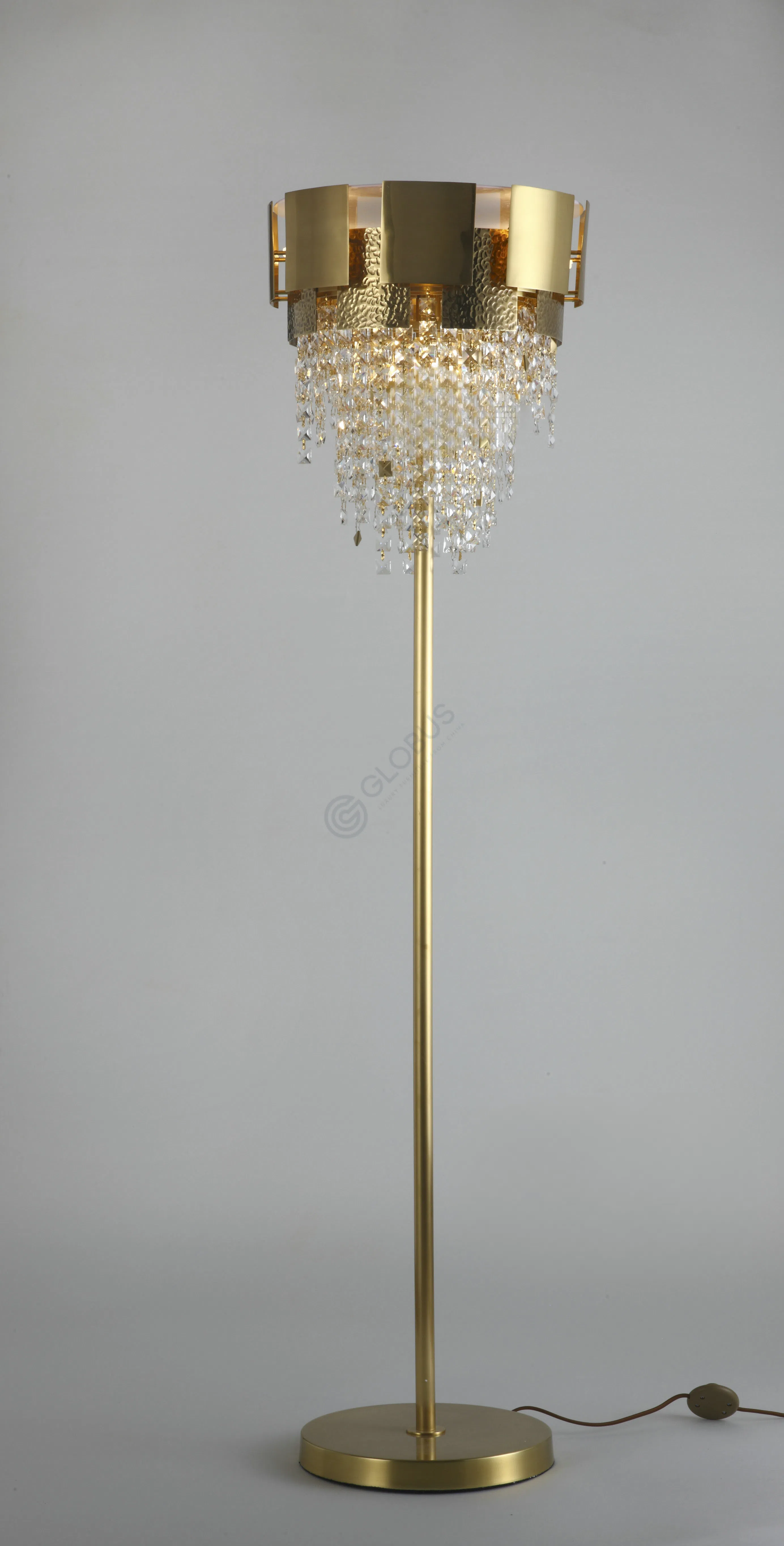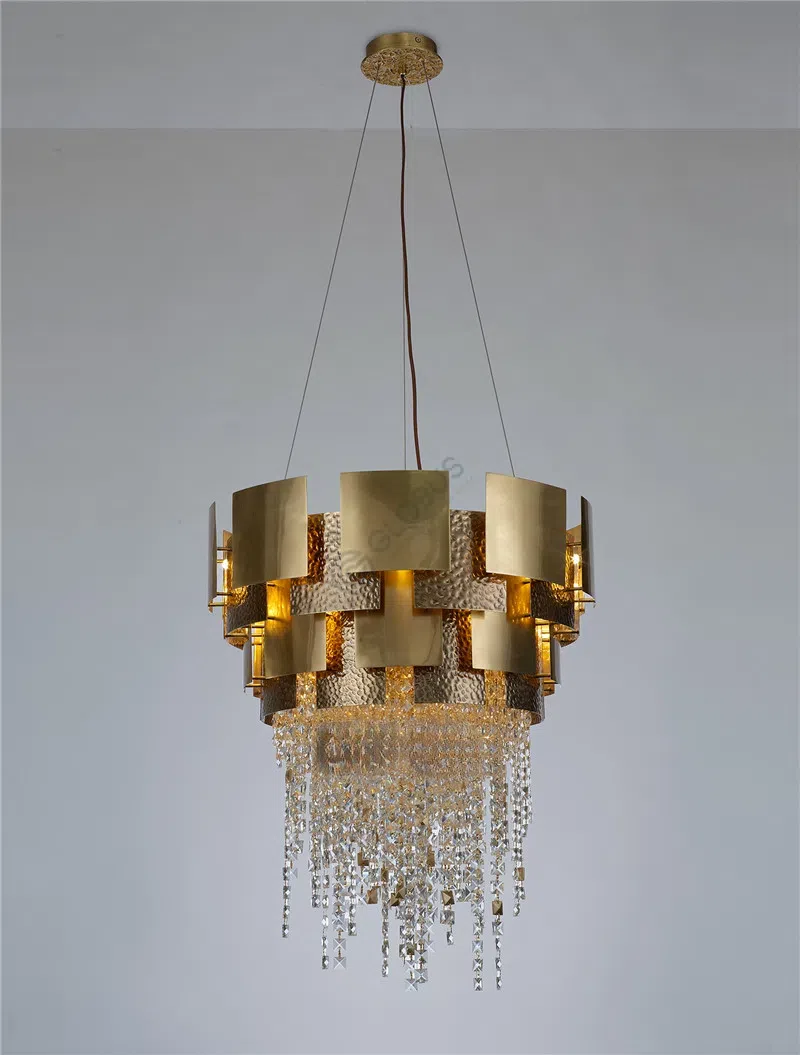 Основой композиции служит скульптурная форма из латуни, часть которой имеет оригинальную фактуру, добавляющую визуальной глубины. Ниже располагается каскад сверкающих элементов из кристалла К9. Их точное расположение создает эффект струящегося света, наполняющего помещение искрящимися бликами.