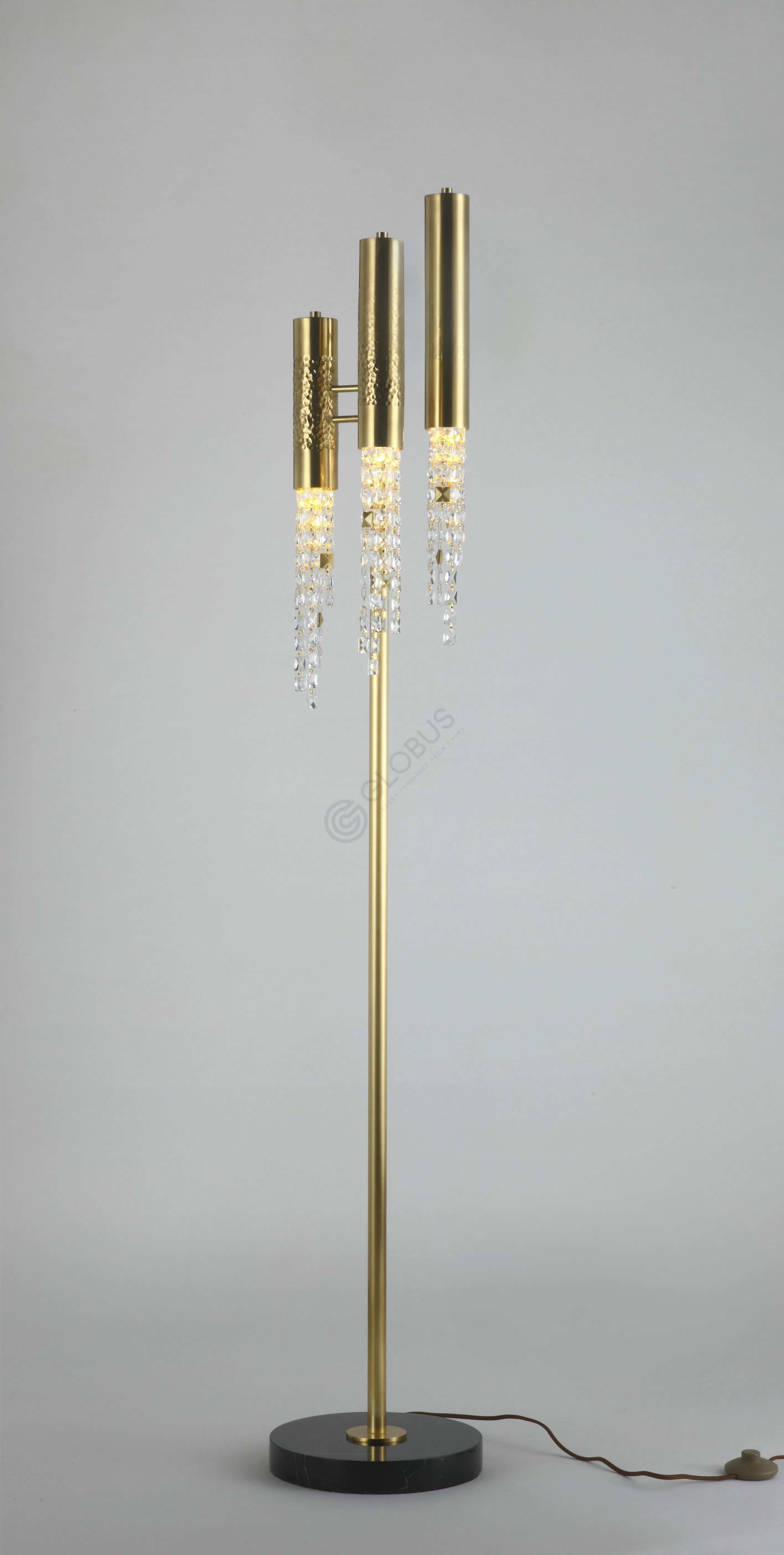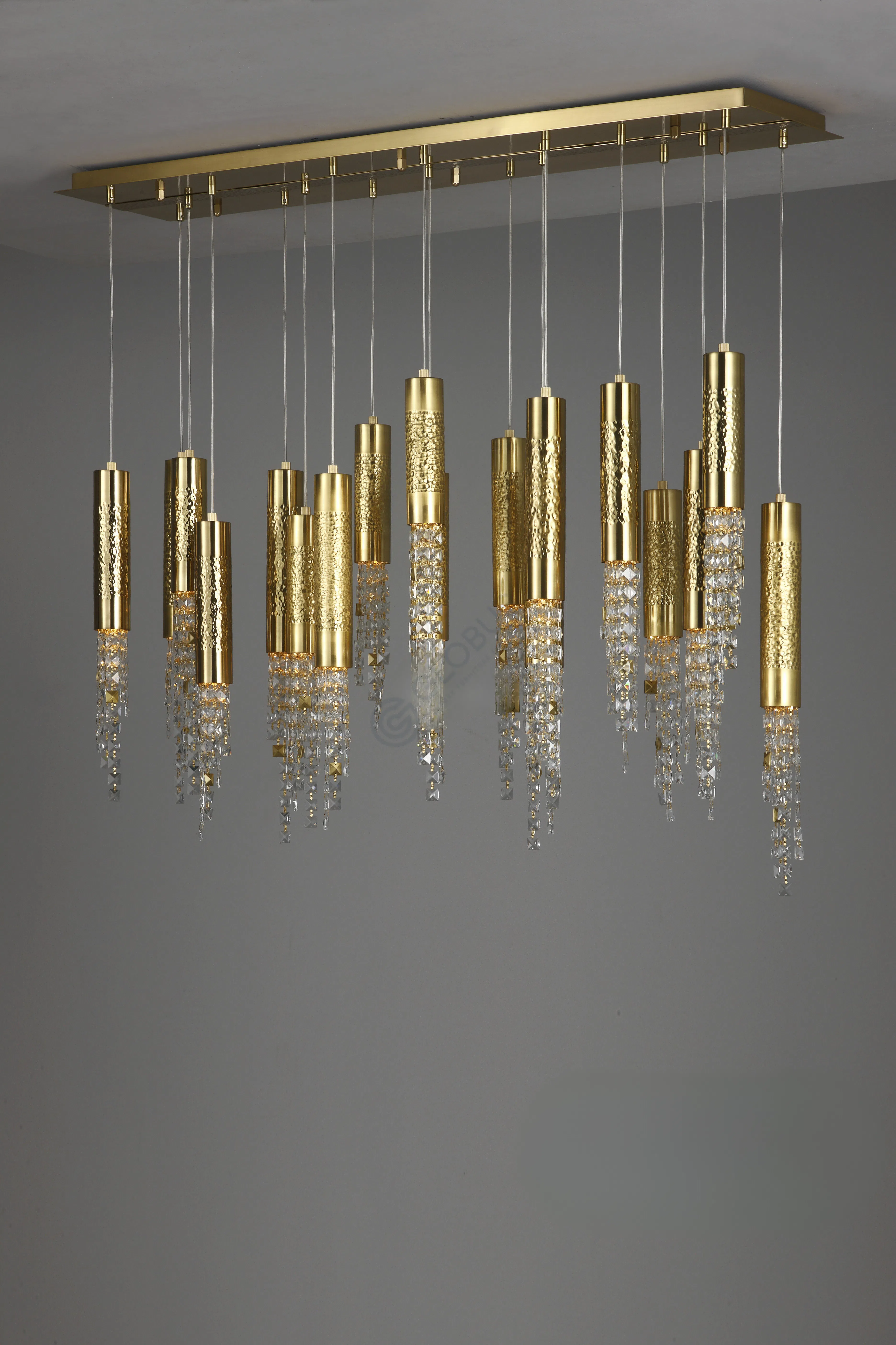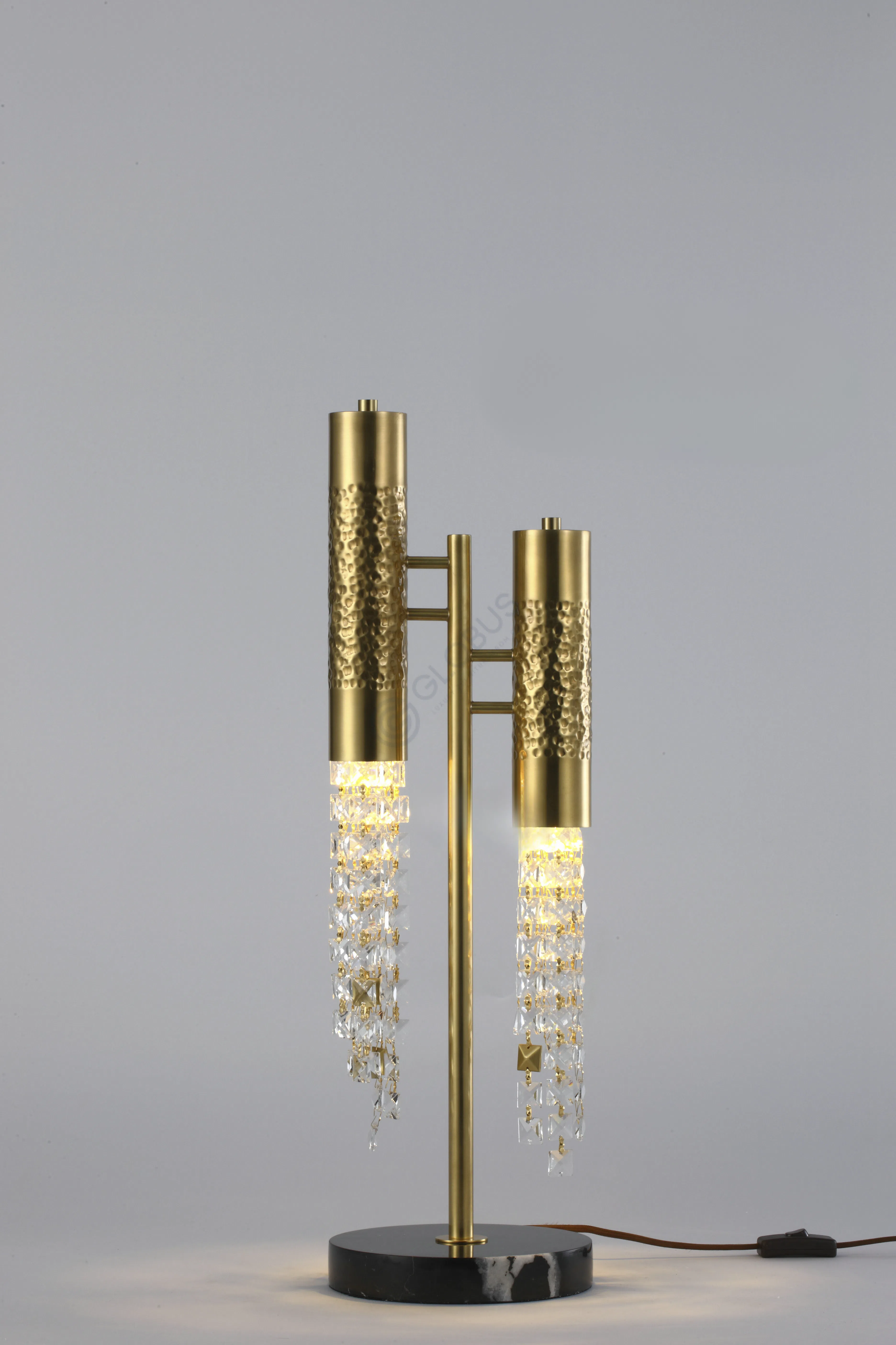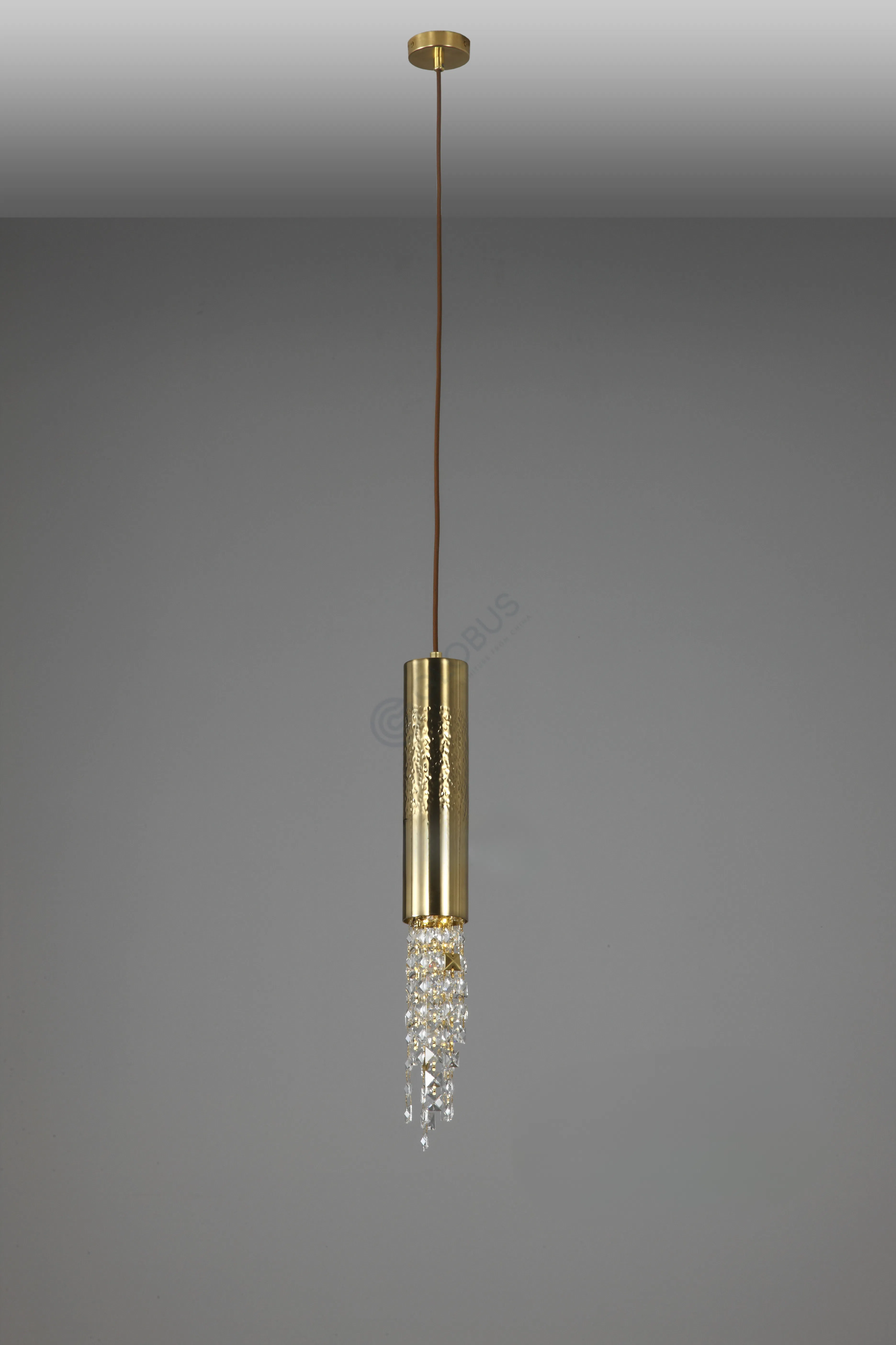 Основание светильника выполнено из высококачественной латуни, которая придает изделию благородный блеск и долговечность. Узор на цилиндрической части добавляет фактуру и визуальный интерес. Основным декоративным элементом является ниспадающий каскад кристаллов K9. Этот материал известен своей исключительной чистотой и способностью красиво преломлять свет.