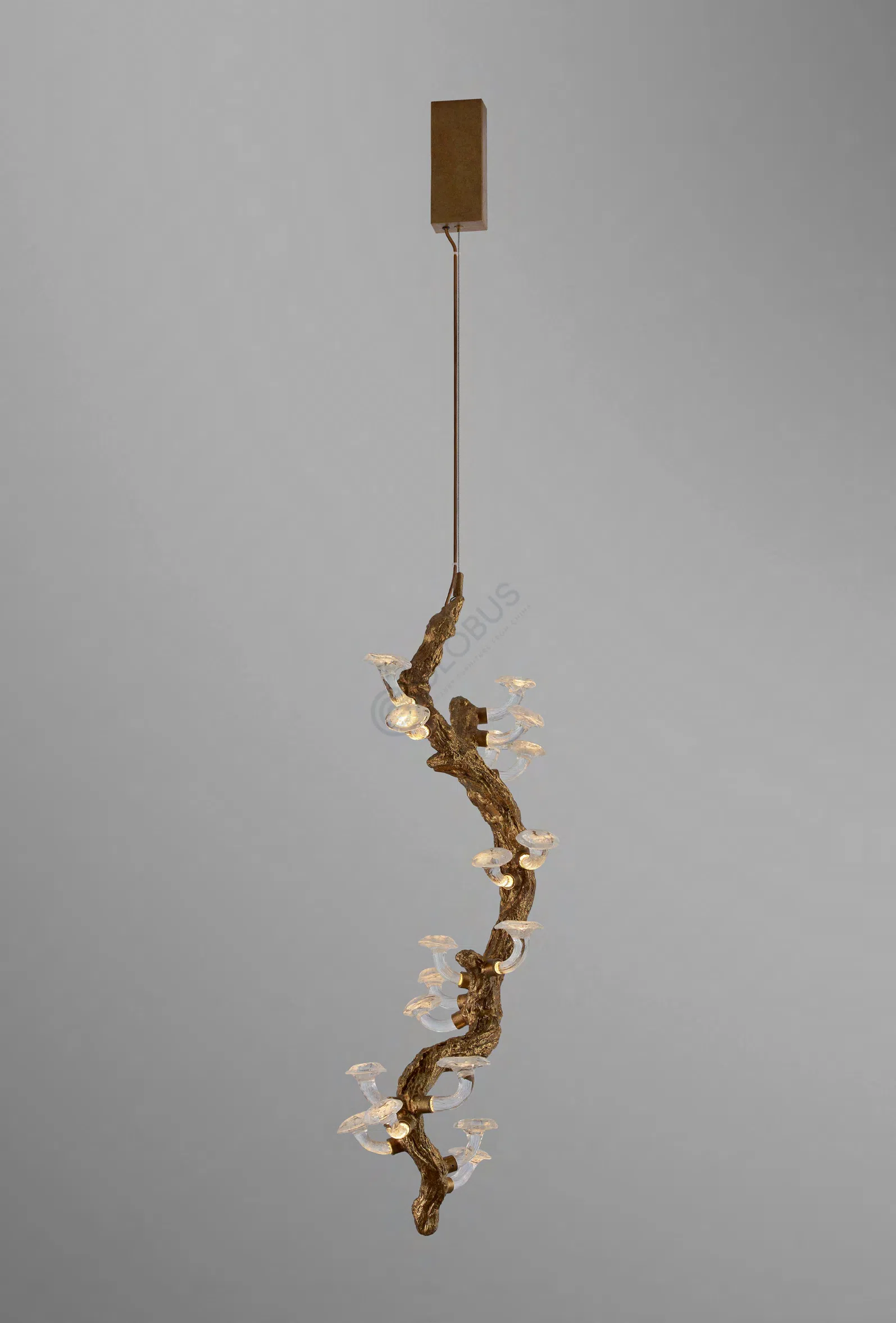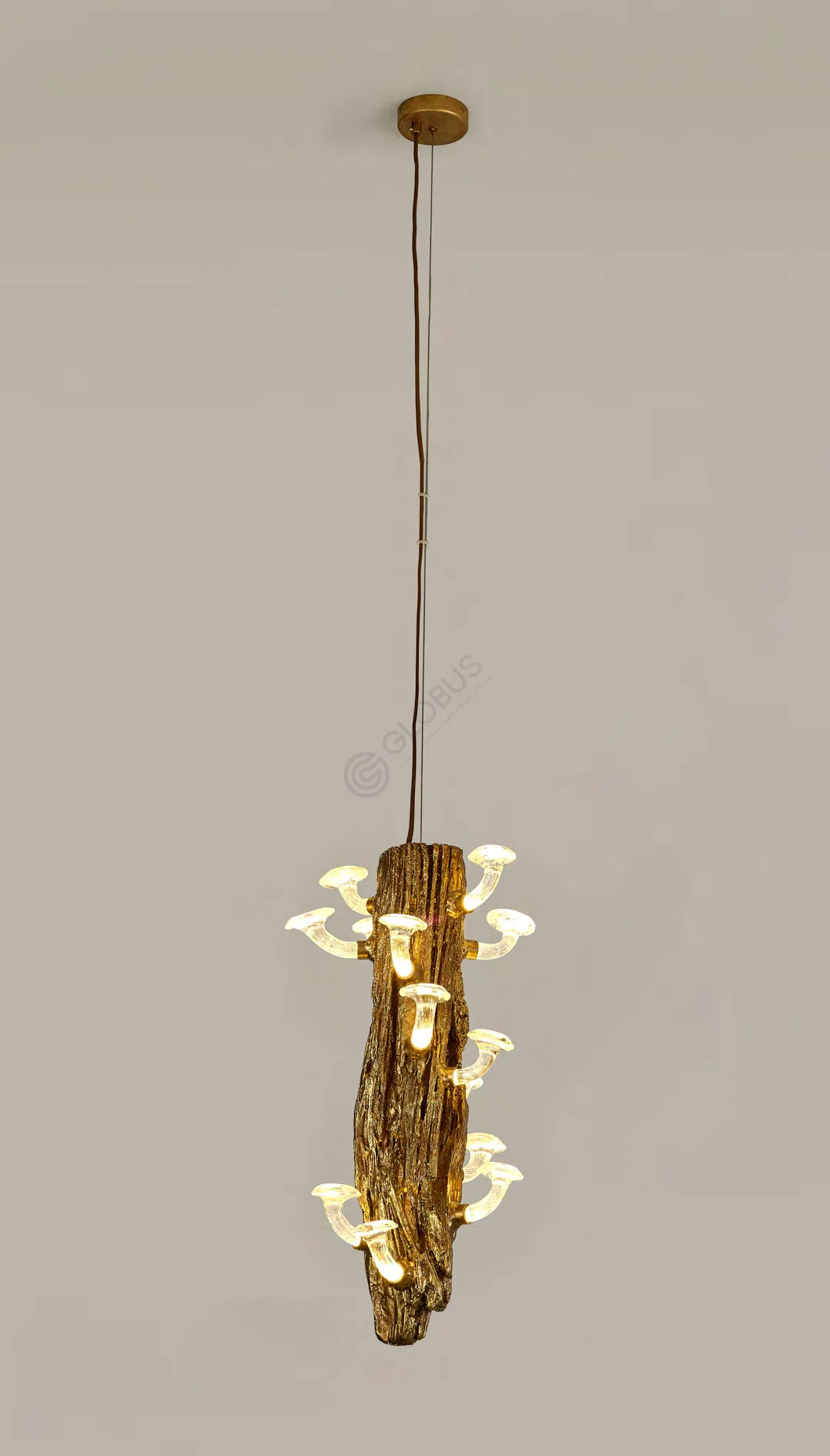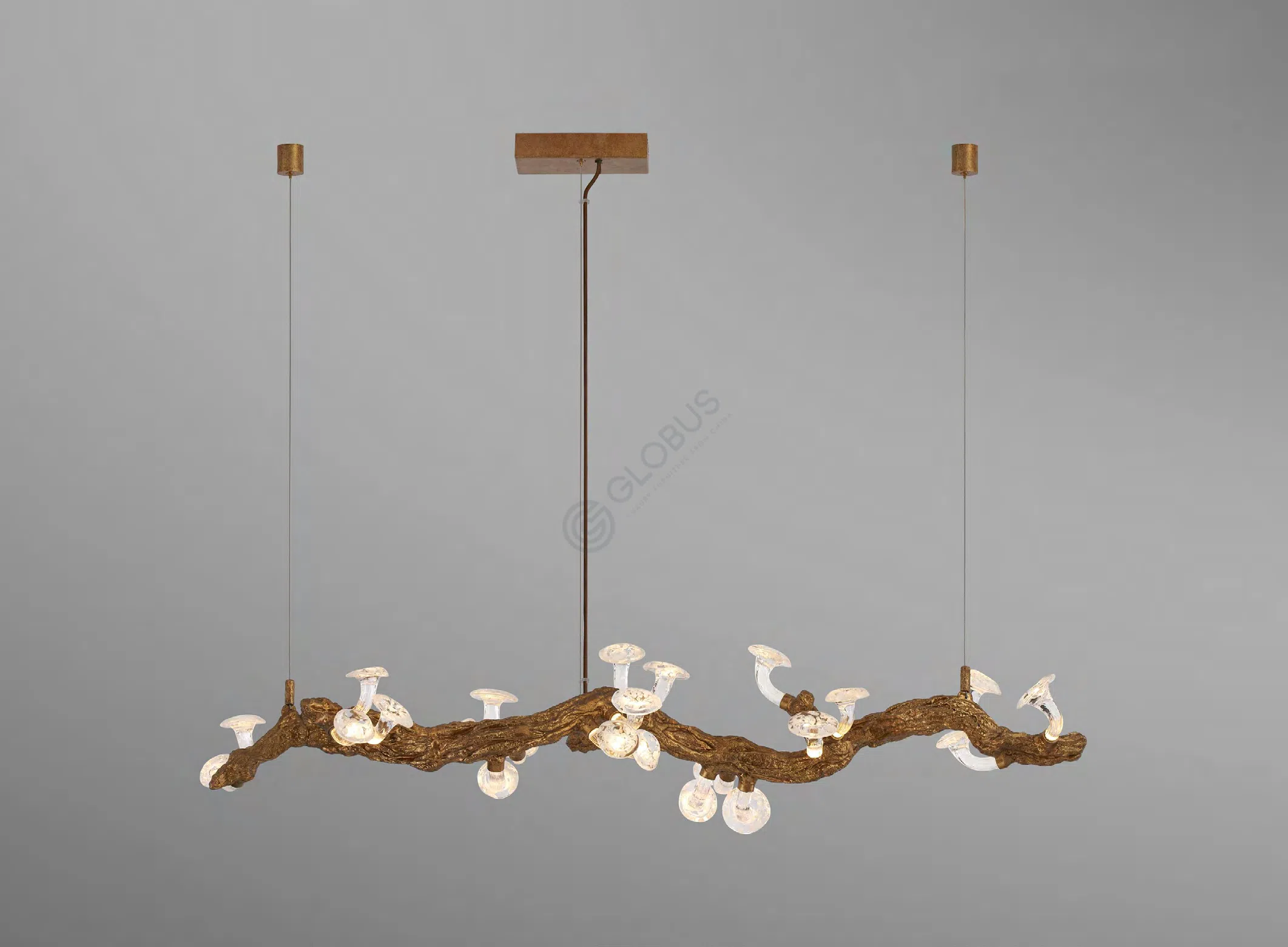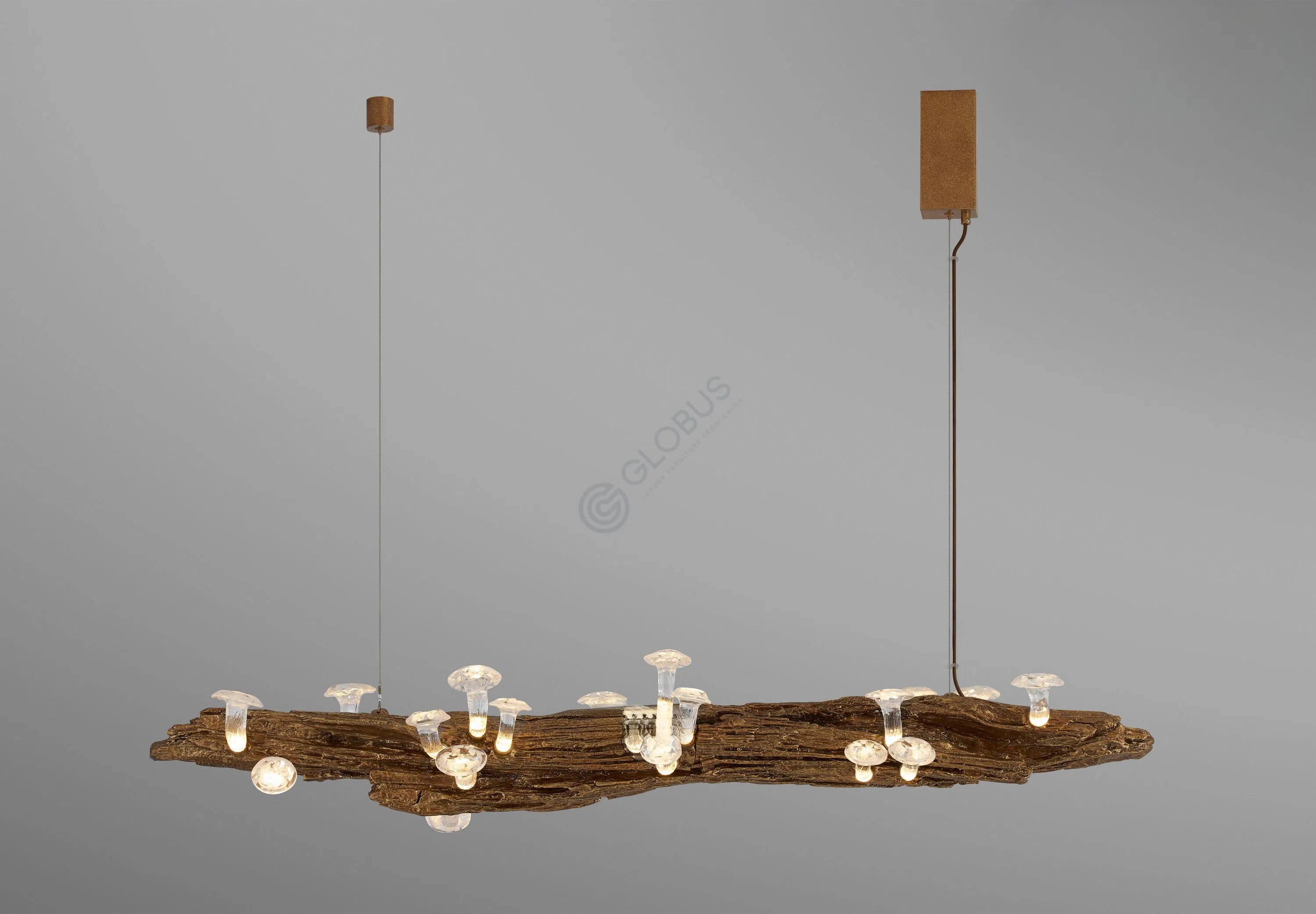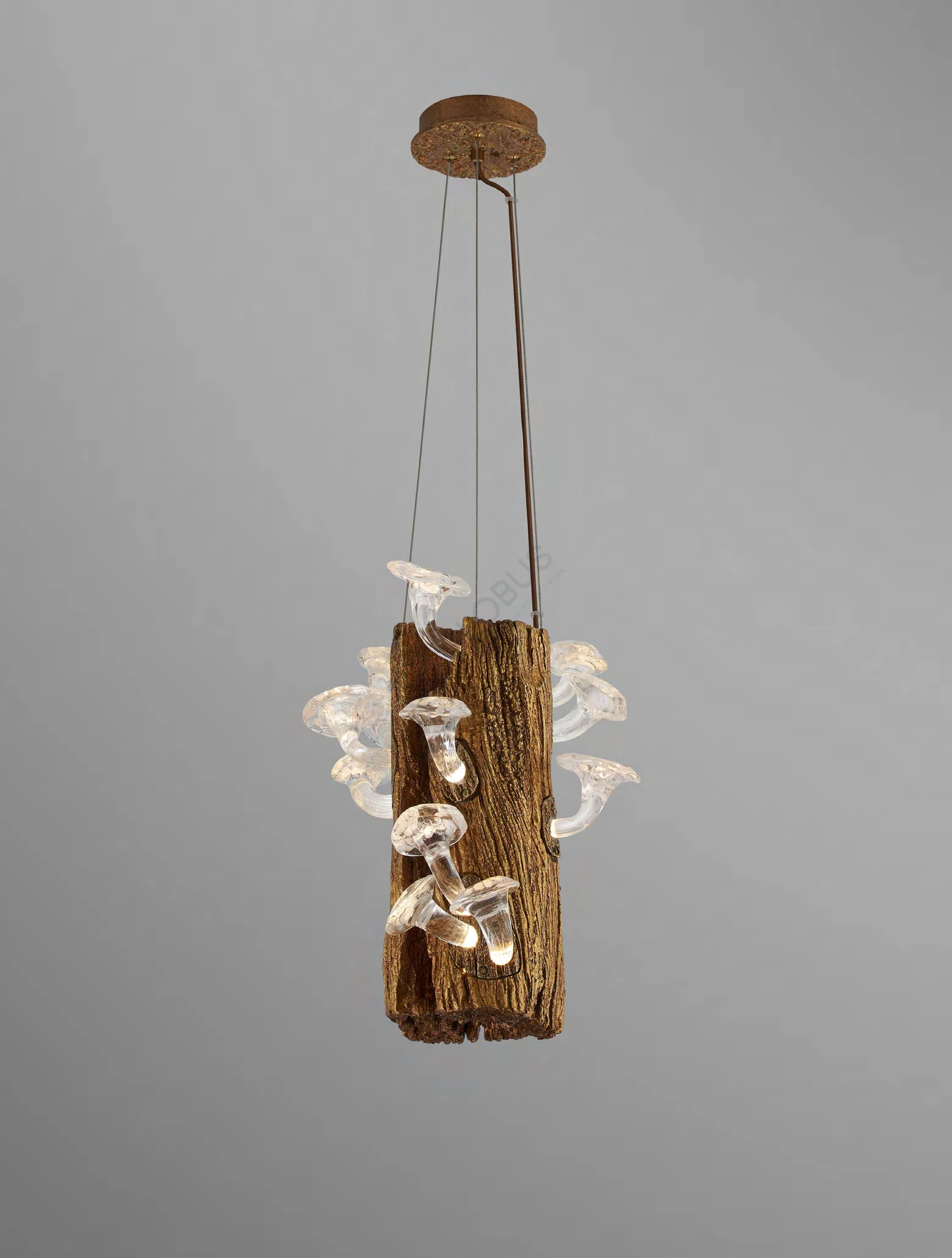 Основание люстры выполнено из алюминия с текстурой, искусно имитирующей грубую поверхность древесной коры. Из этой фактурной основы вырастают нежные элементы из стекла, каждый из которых напоминает изящный гриб, светящийся мягким, рассеянным сиянием. Сочетание необработанной, землистой текстуры и прозрачного, светящегося стекла создает удивительный визуальный контраст.