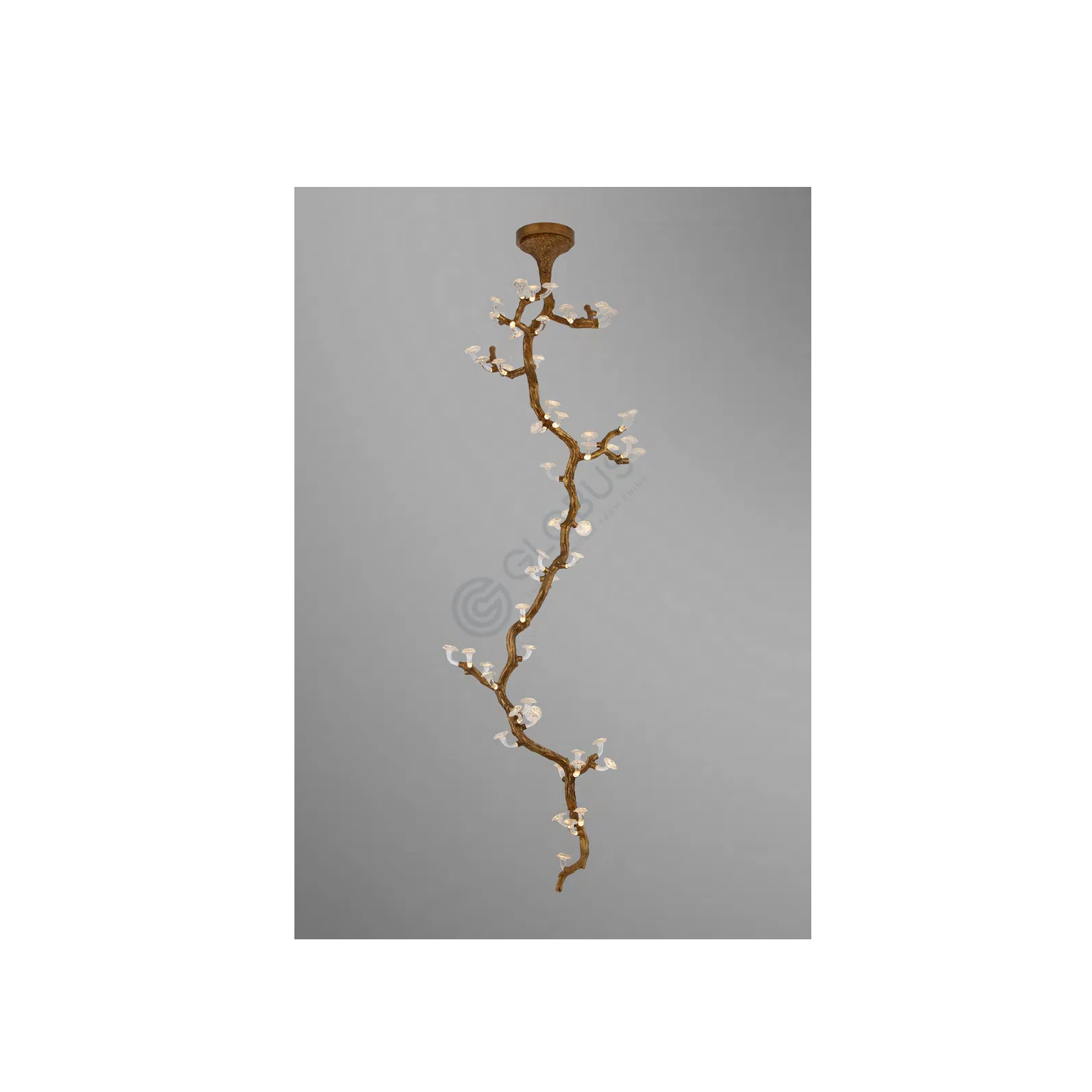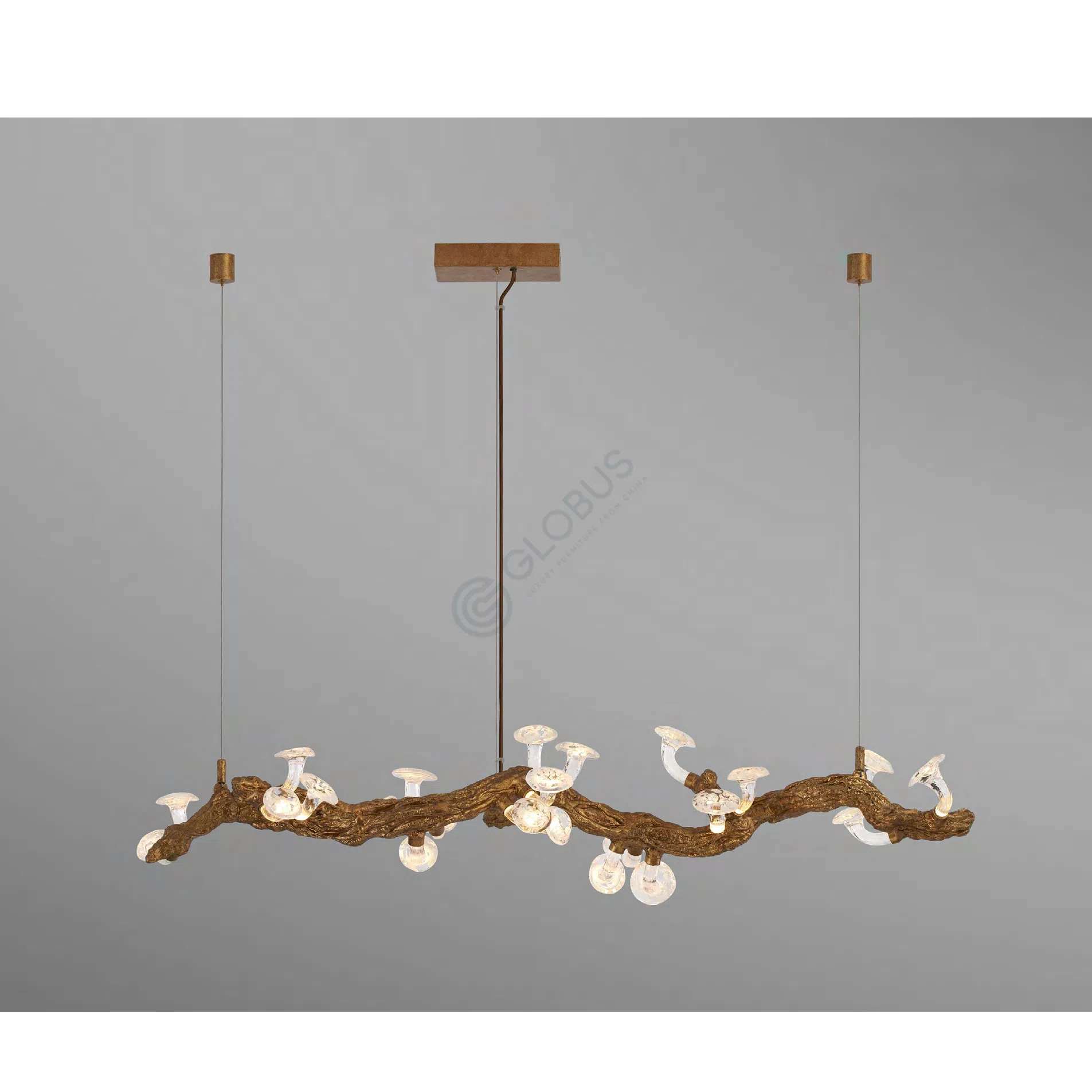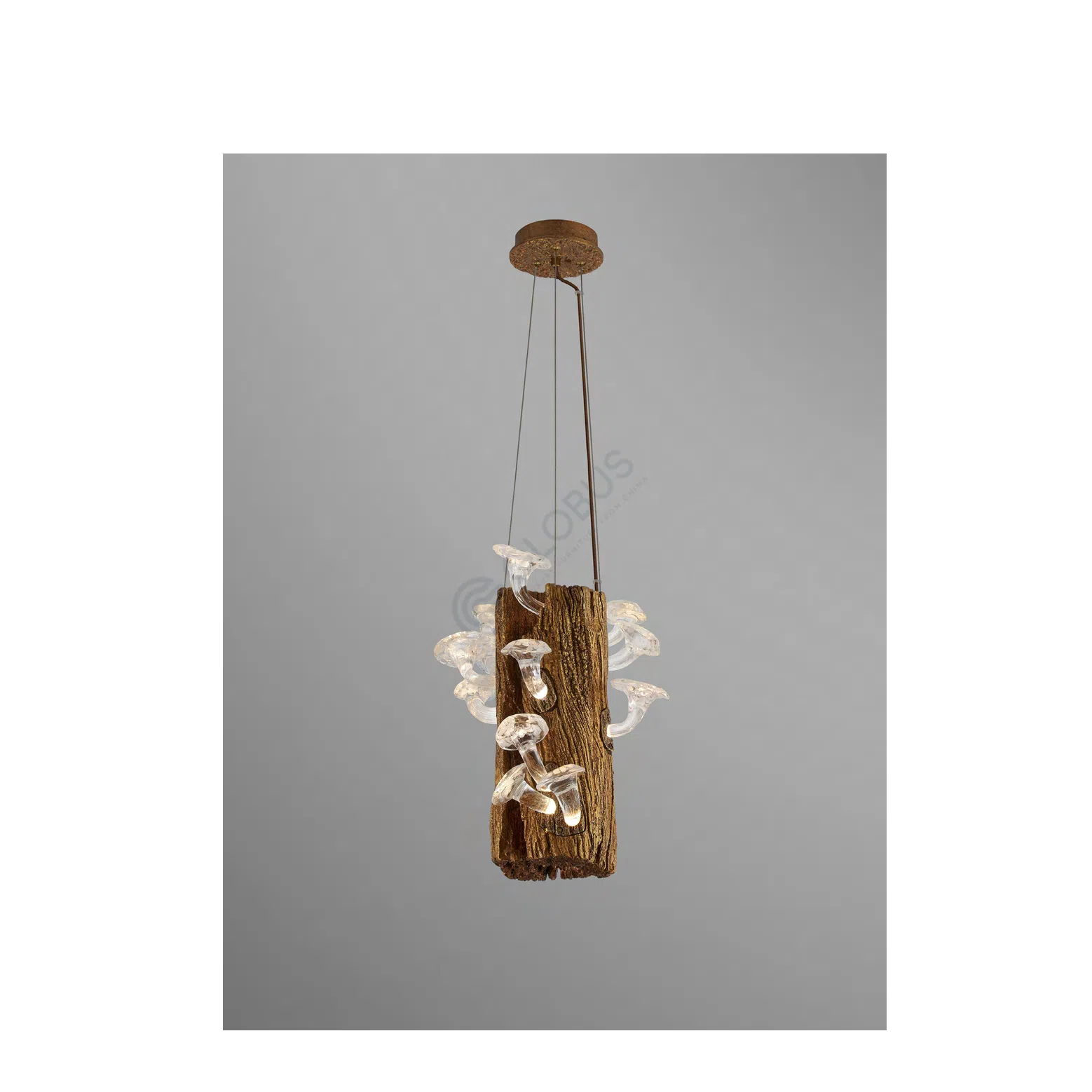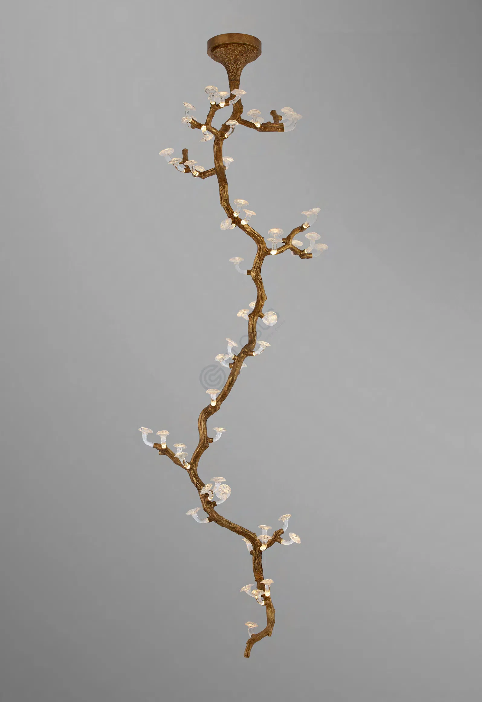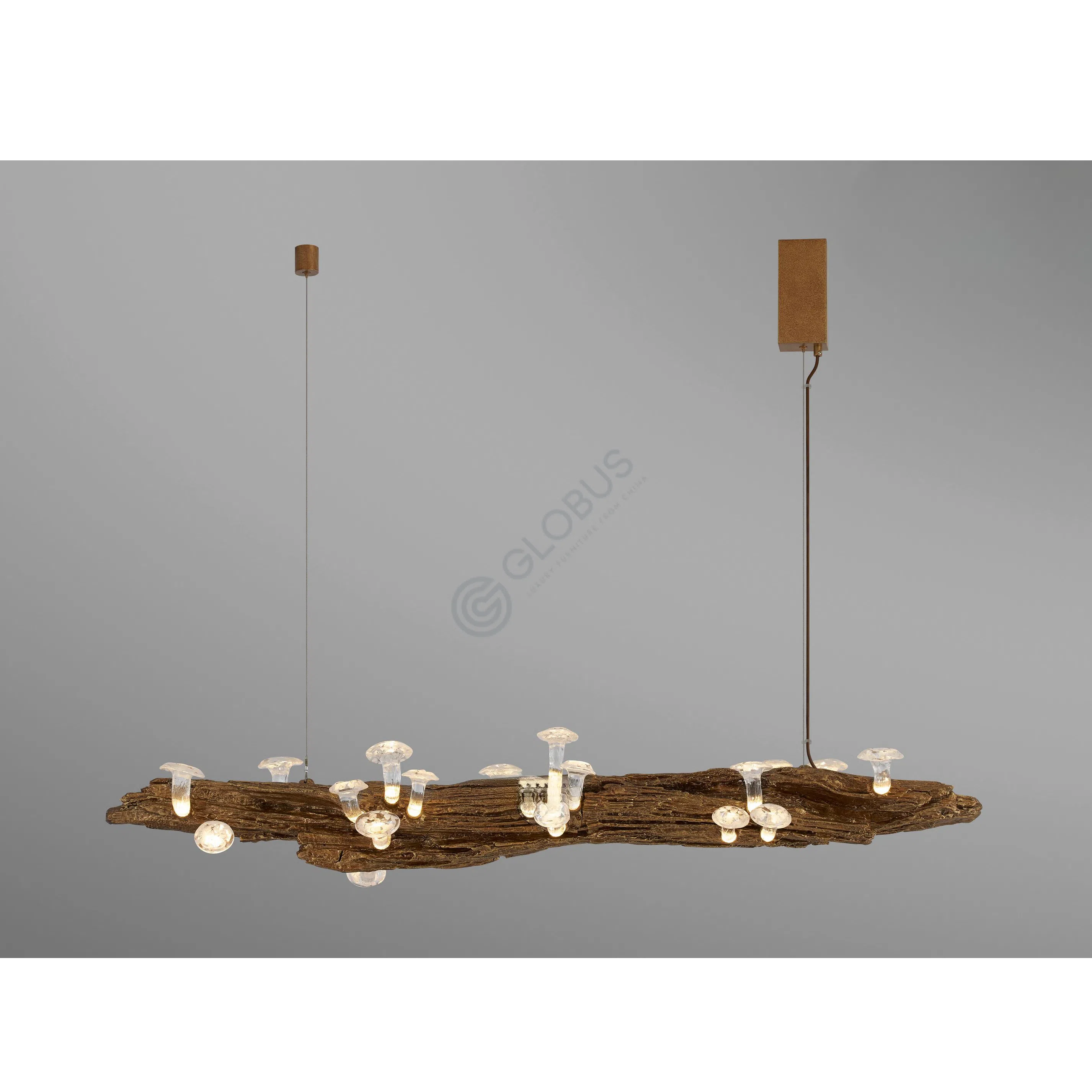Основание люстры выполнено из алюминия с текстурой, искусно имитирующей грубую поверхность древесной коры. Из этой фактурной основы вырастают нежные элементы из стекла, каждый из которых напоминает изящный гриб, светящийся мягким, рассеянным сиянием. Сочетание необработанной, землистой текстуры и прозрачного, светящегося стекла создает удивительный визуальный контраст.