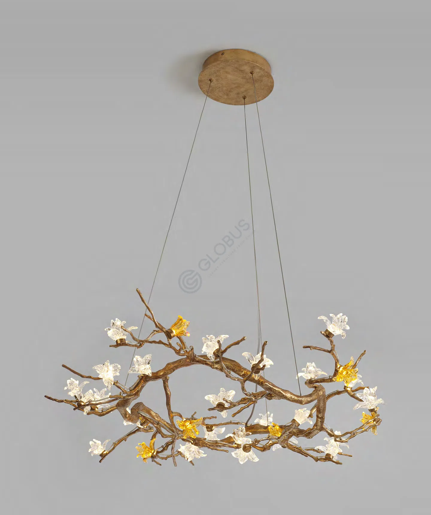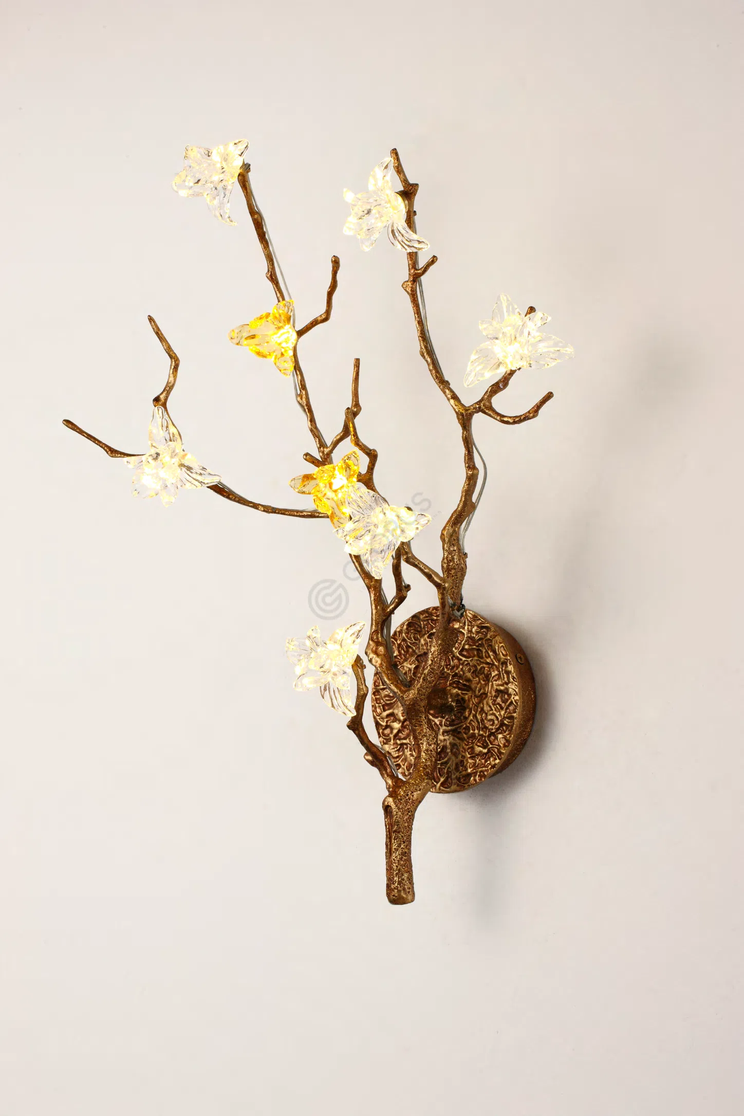 Основание выполнено из высококачественной латуни, мастерски обработанной для придания естественной, органической текстуры, имитирующей кору. Ветви украшены многочисленными световыми элементами из стекла. Прозрачные и янтарные стеклянные детали, выполненные в форме нежных цветков, создают игру света и тени, напоминая мерцание утренней росы или распускающиеся бутоны.