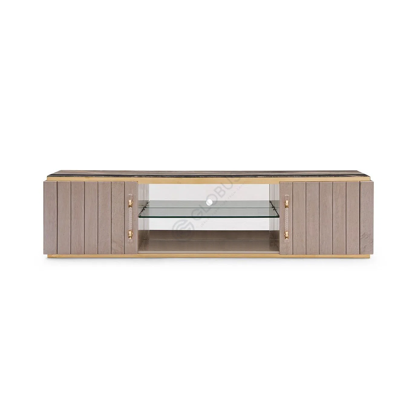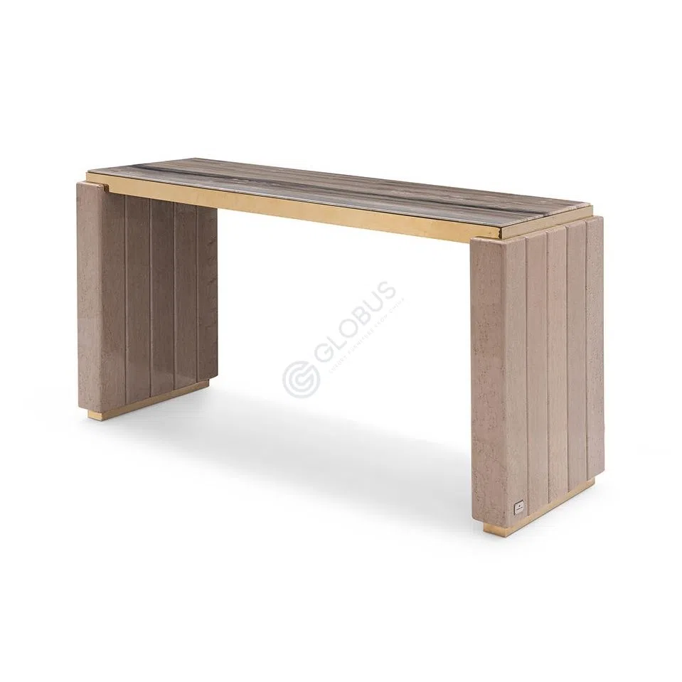 Вершина столика украшена плитой натурального мрамора с уникальным природным рисунком, который придает каждому изделию неповторимый характер. Конструкция основания представляет собой гармоничное сочетание вертикальных элементов и открытого пространства, обрамленное металлическими акцентами, подчеркивающими четкие линии и форму.