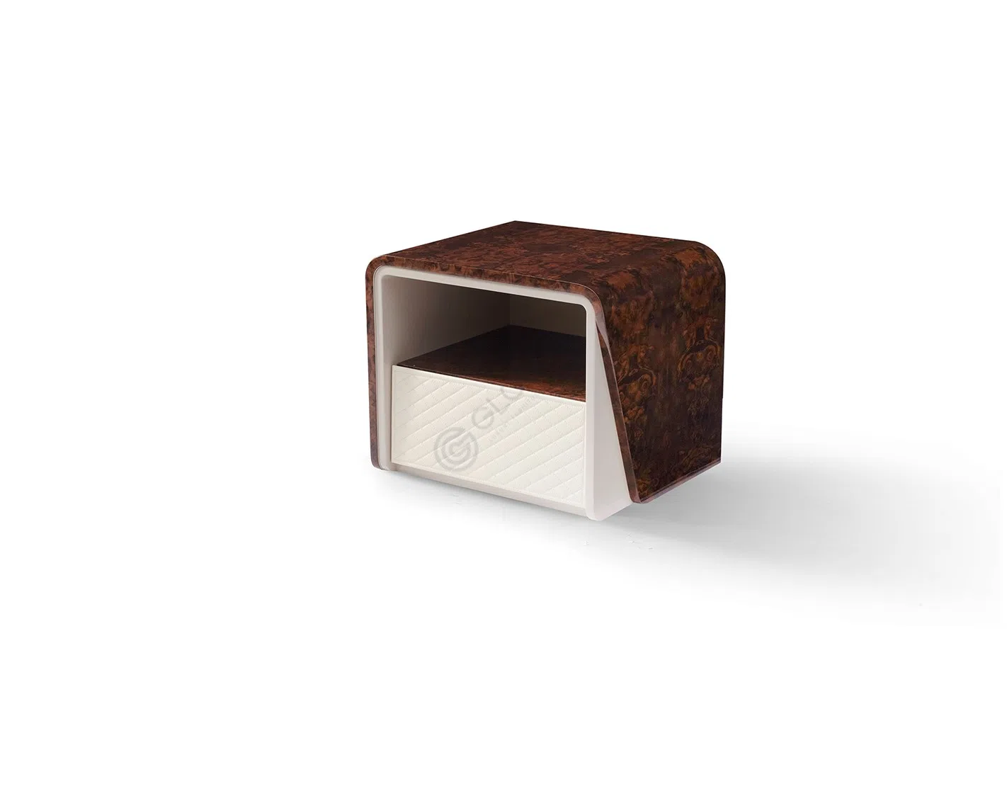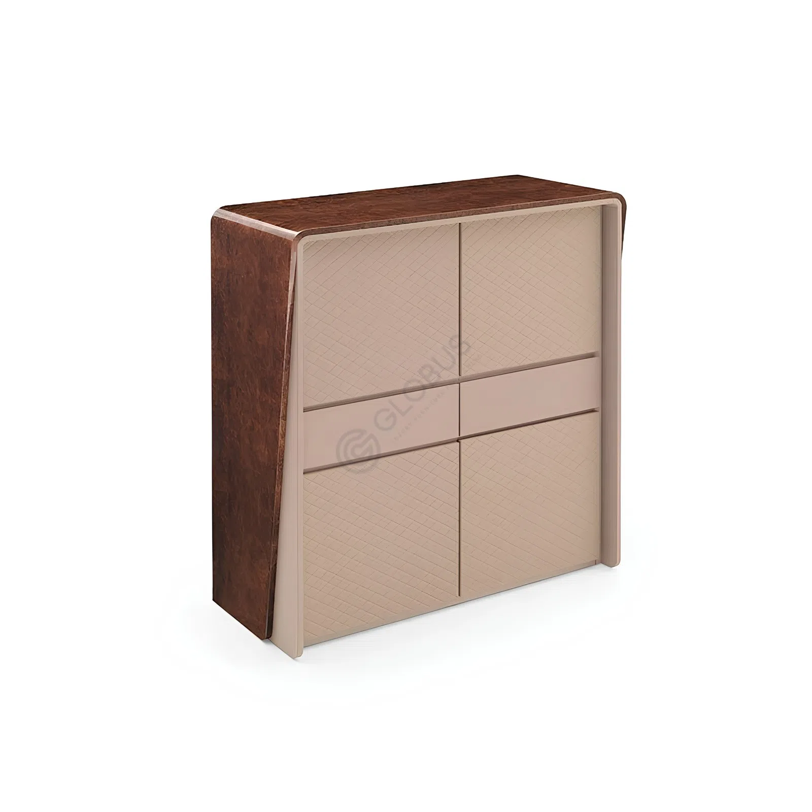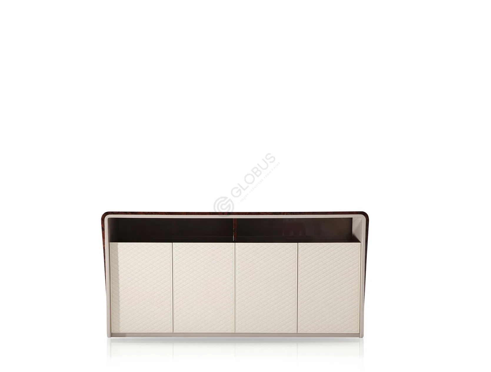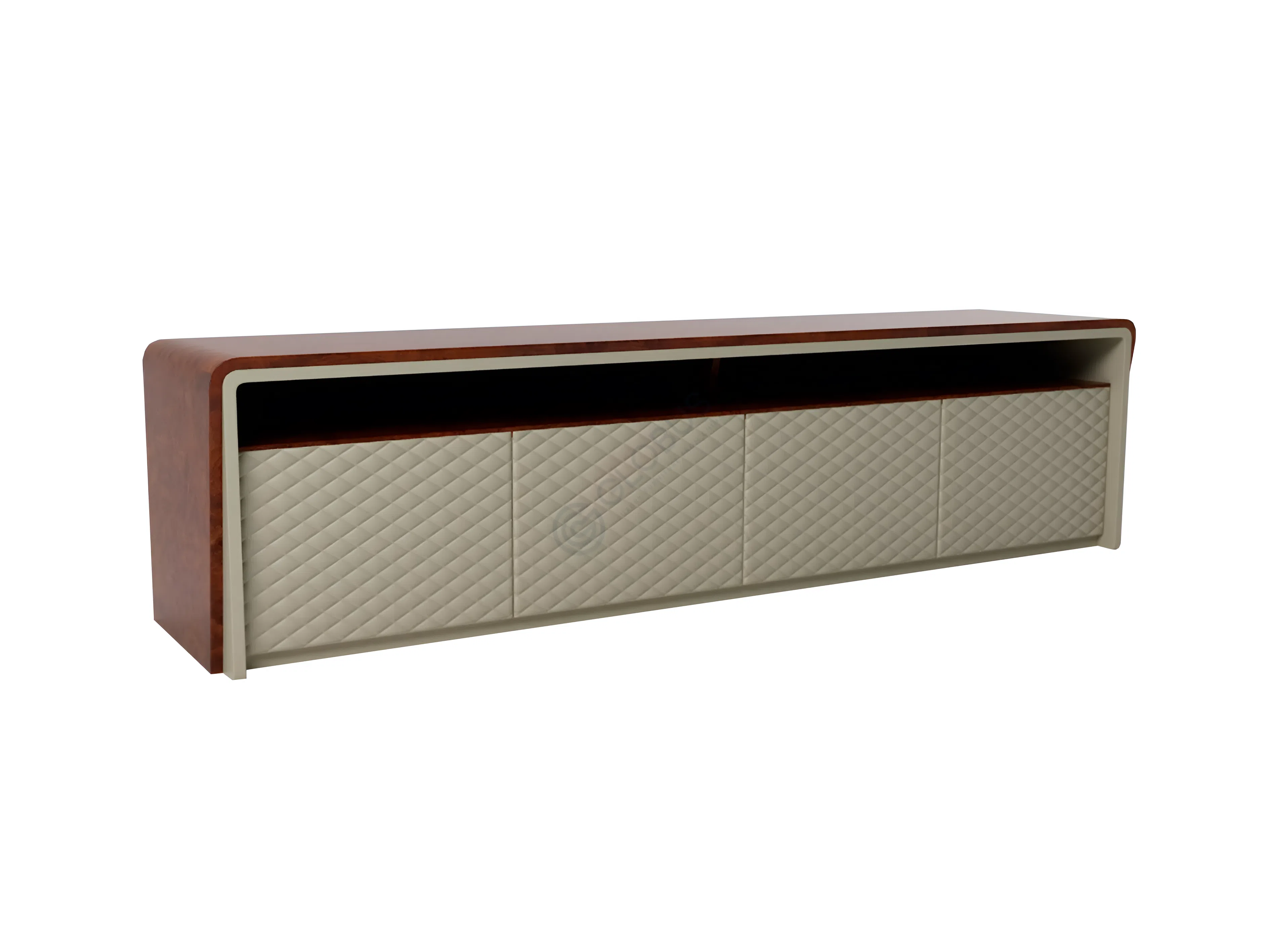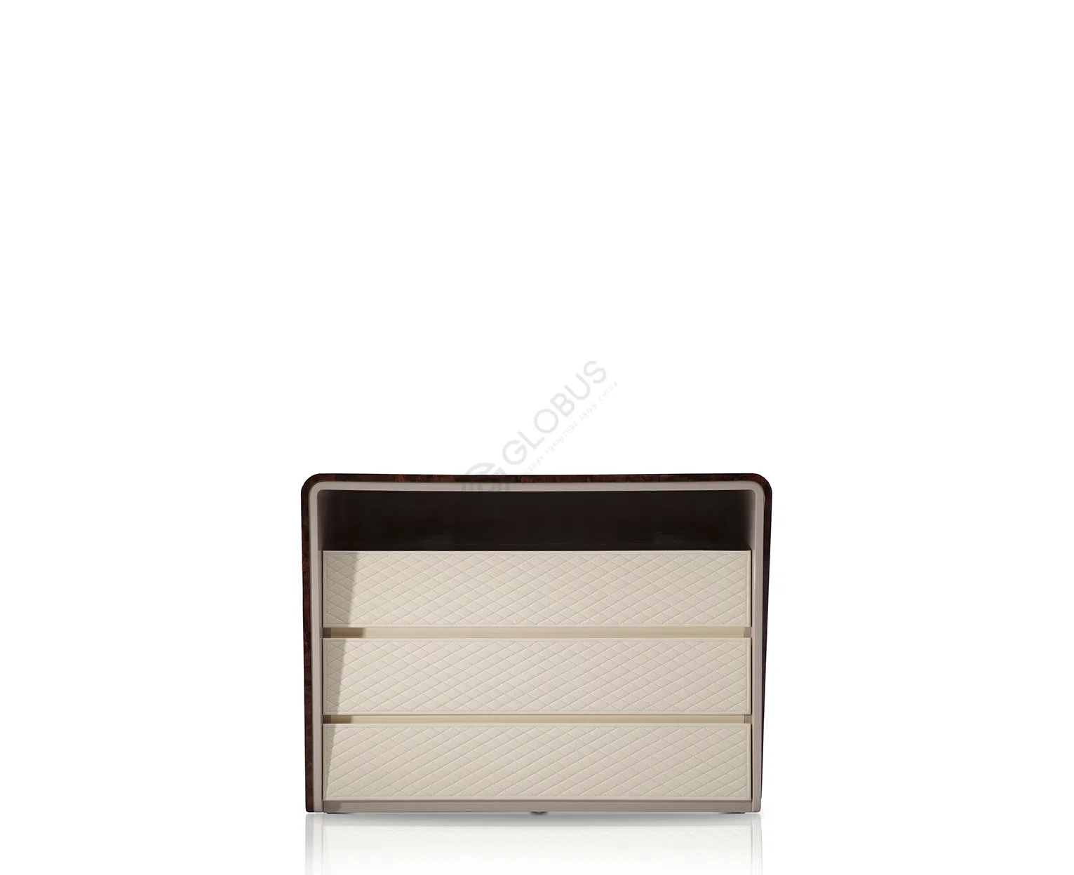 Корпус изделия выполнен из натурального дерева и шпона, что придает ему основательность и благородный вид. Фасады дверей и выдвижных ящиков покрыты высококачественной экокожей на микрофибре, украшенной деликатной стежкой, добавляющей визуальный и тактильный интерес. Такое сочетание материалов подчеркивает премиальный статус предмета.