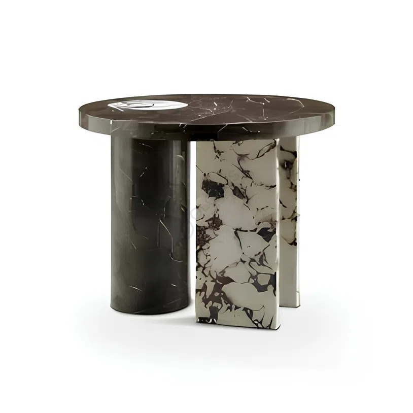Изысканность столика подчеркивается умелым сочетанием материалов. В поверхность столешницы деликатно интегрирован фрагмент натурального камня с характерным узором, гармонично перекликающийся с выразительными ножками, также выполненными из этого благородного материала. Этот мраморный акцент с его уникальным жилкованием привносит в облик изделия особую индивидуальность и тактильное богатство, раскрывая истинную красоту природных текстур.