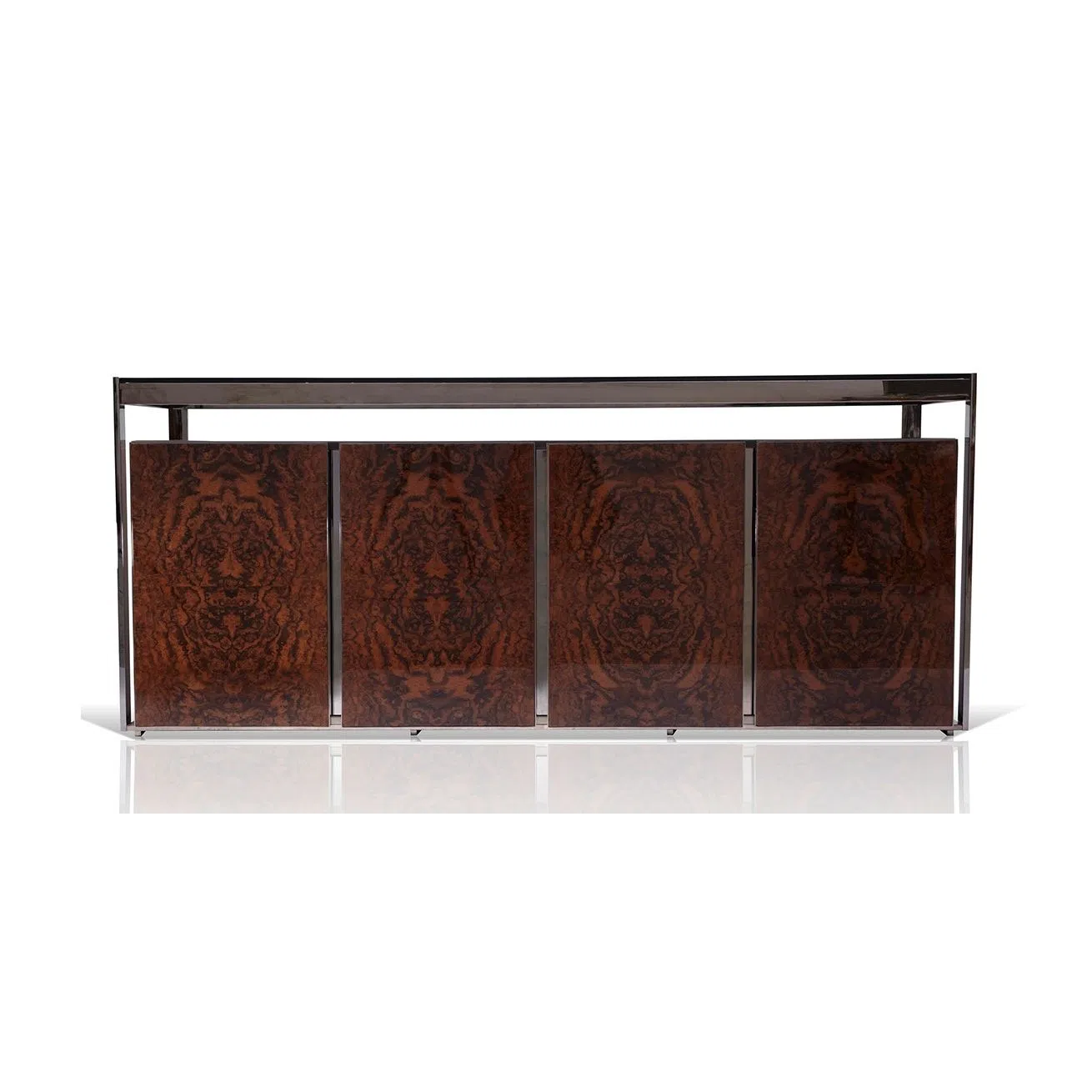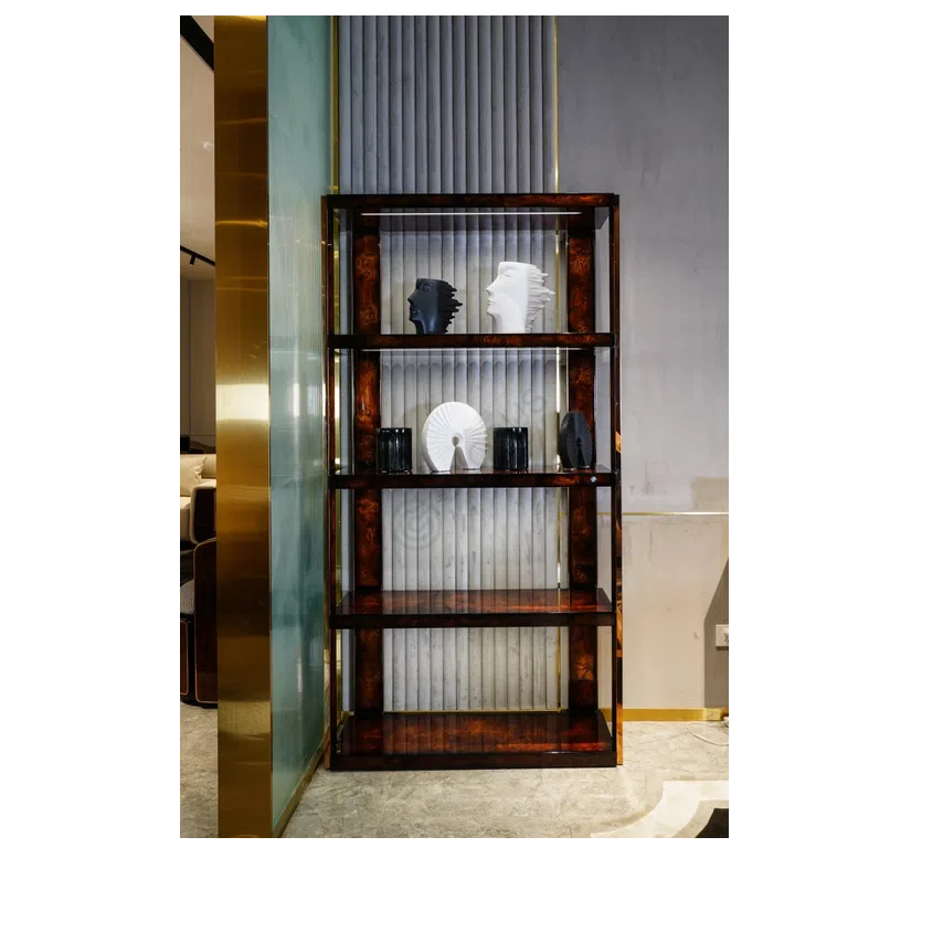 Изделие представляет собой элегантную конструкцию, в которой мастерски сочетаются разнообразные высококачественные материалы. Крепкое металлическое основание обеспечивает устойчивость, а элементы из натурального дерева и фанеры создают прочный каркас. Фасады декорированы изысканным шпоном с уникальным природным рисунком, что придает каждому шкафчику индивидуальность. В отделке использованы также стекло и экокожа на микрофибре, добавляющие изделию утонченности и тактильного комфорта.