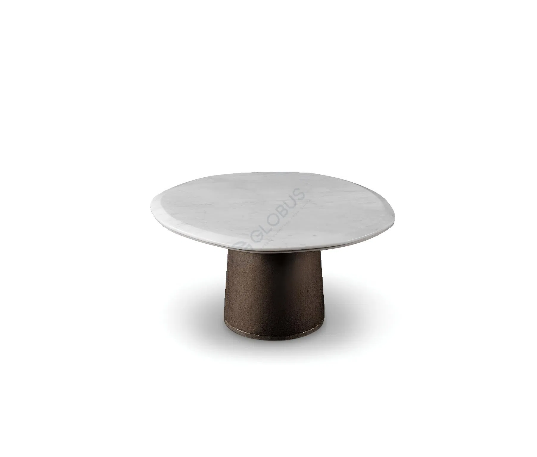 Устойчивость и оригинальность столику придают две массивные опоры. Их скульптурная форма и текстура, напоминающая природный камень или металл, контрастируют с гладкой мраморной плитой, создавая баланс между мощью и утонченностью. Конструкция ножек, выполненных с использованием металла и фанеры, обеспечивает надежную поддержку.
