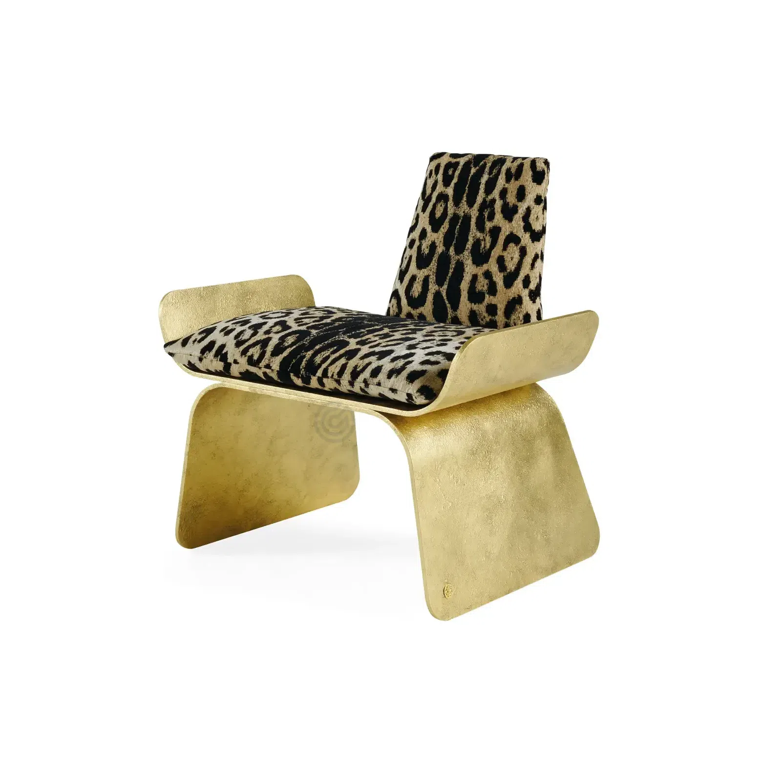 Центральным элементом пуфа выступает мягкое сиденье, обтянутое роскошным текстилем с эффектным леопардовым принтом. Этот смелый узор добавляет предмету характера и гламура, обеспечивая при этом высокий уровень комфорта. Детально проработанные края сиденья и небольшие ручки в основании подчеркивают внимание к качеству исполнения.