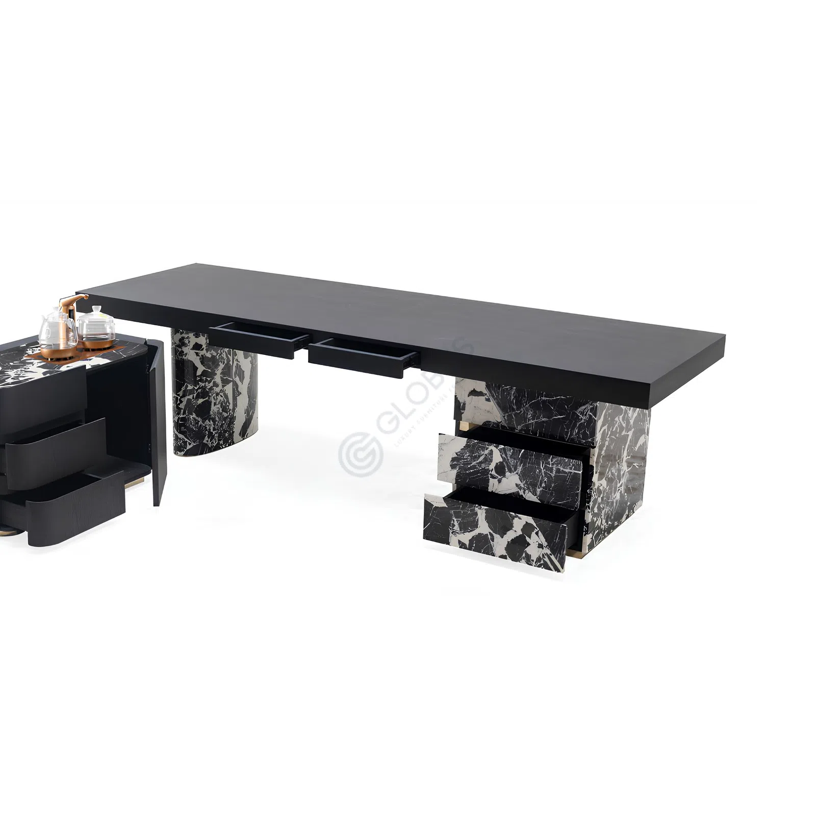 Буфет сочетает в себе элегантность и функциональность, создавая уникальный акцент в интерьере. Изготовленный из шпона, он обладает изысканным внешним видом, который дополняется натуральным мрамором, придающим изделию роскошный вид. Металлические элементы добавляют современный штрих, обеспечивая прочность и долговечность. Этот предмет мебели станет идеальным решением для тех, кто ценит стиль и качество.